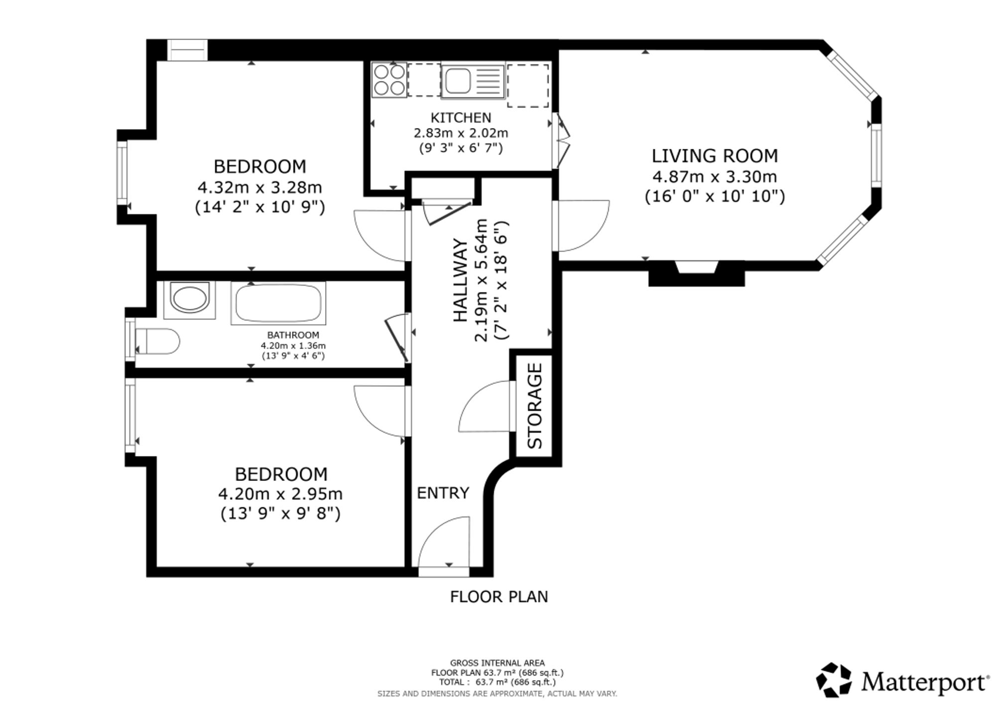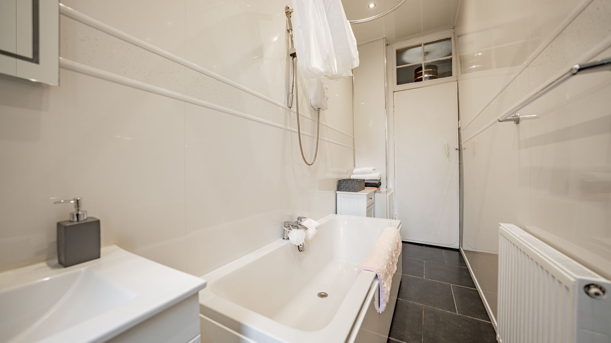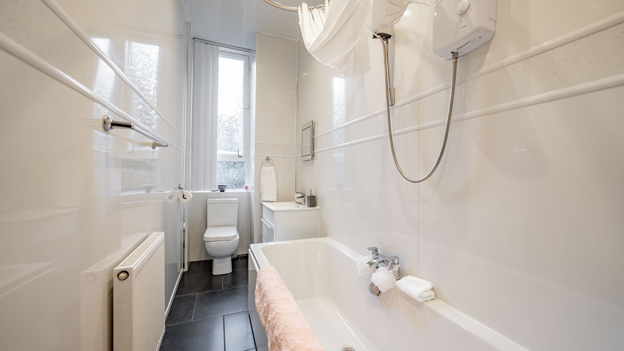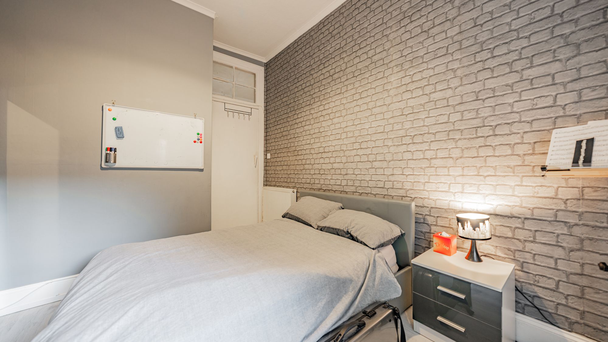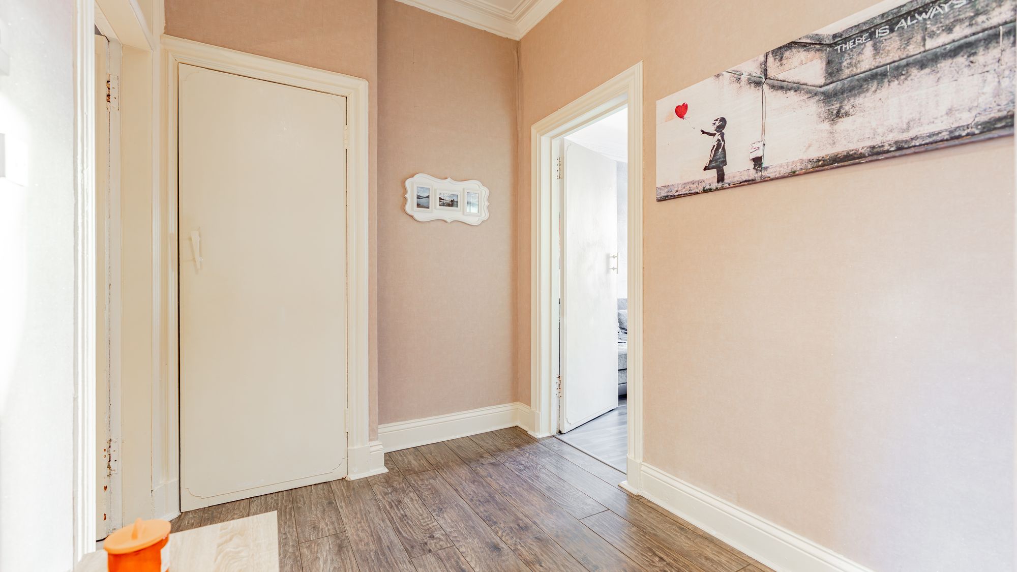 There are two well-sized double bedrooms, including a generous rear-facing principal bedroom with space for free-standing furniture, and a second double bedroom featuring unique integrated storage. Completing the accommodation is an attractive three-piece bathroom suite with shower over bath.