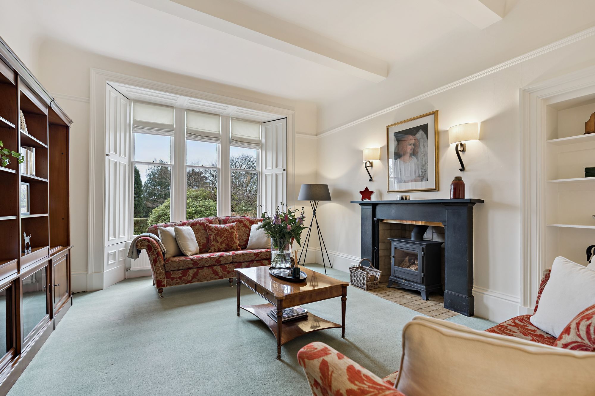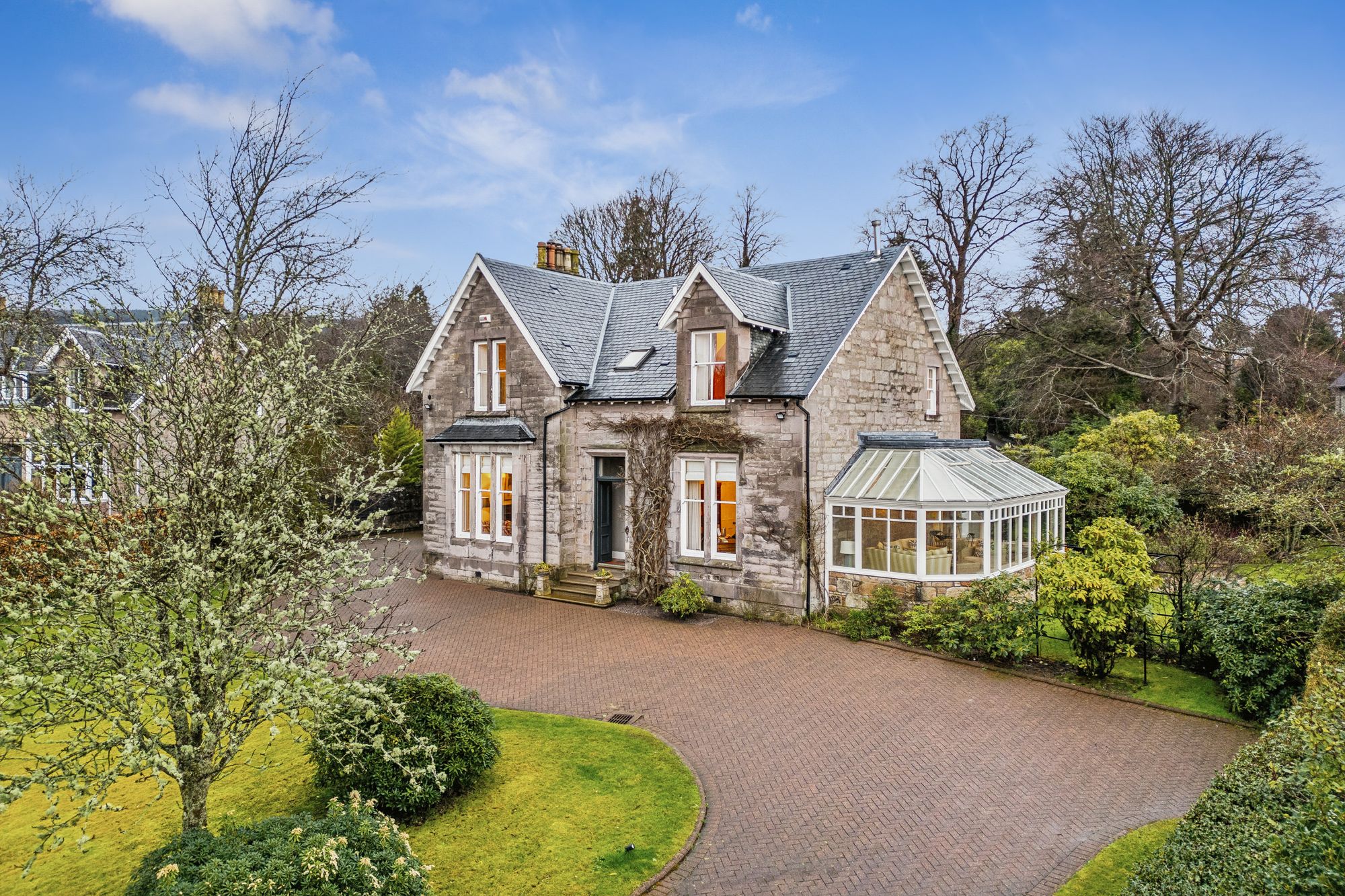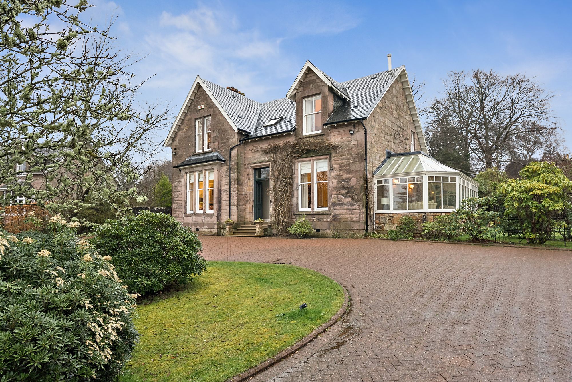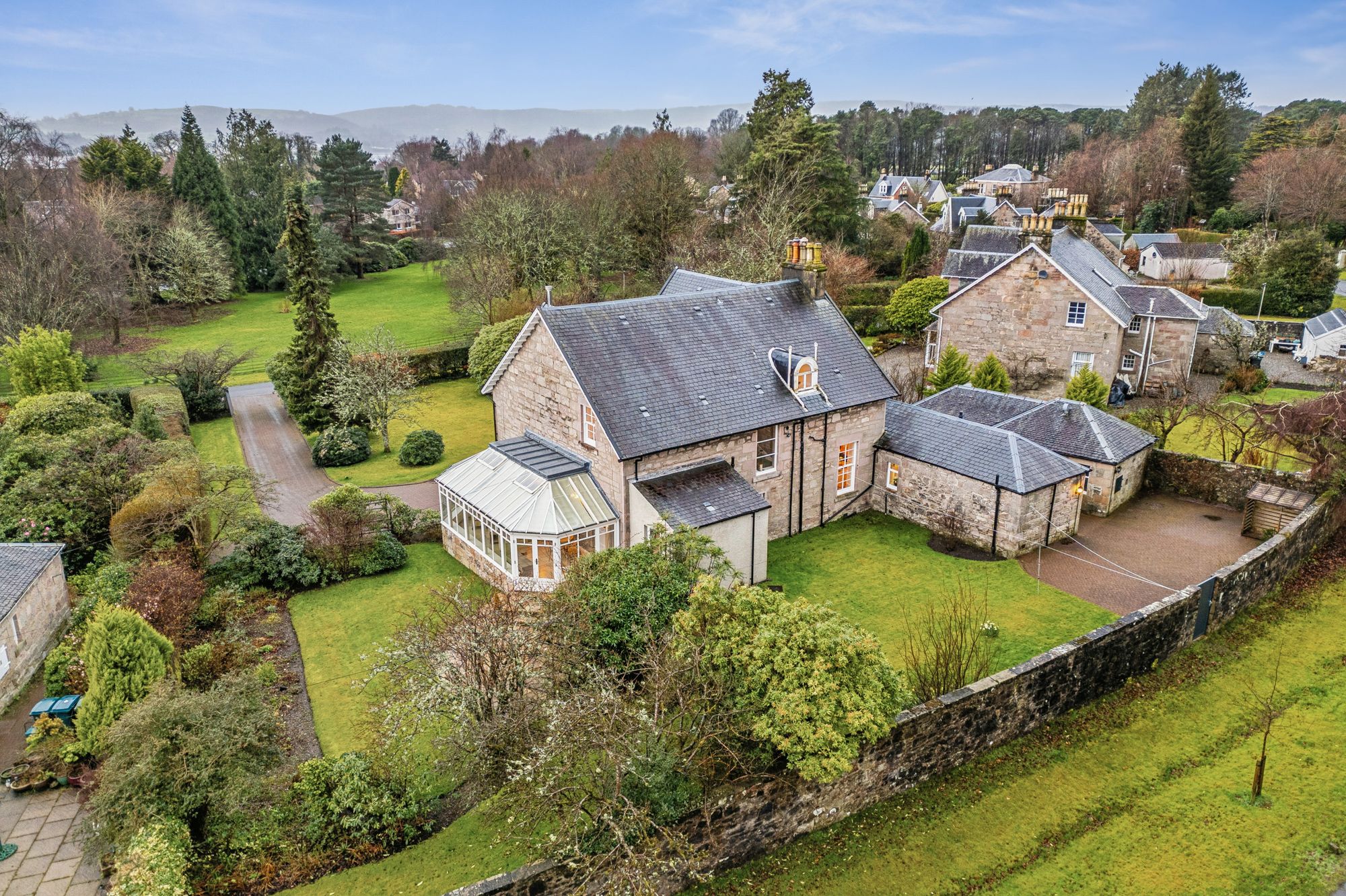 Internally, the accommodation is generously proportioned and exceptionally flexible, extending to eight principal apartments which allow for a variety of family living arrangements. A broad entrance vestibule opens into a welcoming reception hallway that immediately sets the tone for the elegant interior. The beautiful front-facing lounge features a striking focal point fireplace with an inset log-burning stove, creating a warm and inviting public space. In addition, there is a further, separate ground floor sitting room and a third public room, currently utilised as bedroom five, providing further versatility depending on lifestyle requirements. A rear hallway also gives access to a convenient ground floor wash room. One of the most impressive spaces within the home is the almost full-length sun-filled conservatory, which enjoys delightful garden outlooks and provides a superb setting for relaxing or entertaining throughout the seasons. The traditionally styled yet contemporary kitchen is arranged on a semi-open plan basis with a charming dining room that again features a wood-burning stove, forming a comfortable and sociable heart to the home. A practical utility area provides additional convenience for everyday living. A fabulous staircase rises gracefully from the entrance hallway, passing a striking mezzanine level window which floods the stairwell with natural light, before reaching the upper landing. From here, access is provided to four well-proportioned bedrooms, each offering comfortable accommodation. The front-facing bedrooms enjoy particularly attractive views across the gardens and surrounding greenery which must truly be seen to be appreciated. Completing the upper level are a separate WC/wash room and an additional shower room, providing excellent facilities for a busy household.