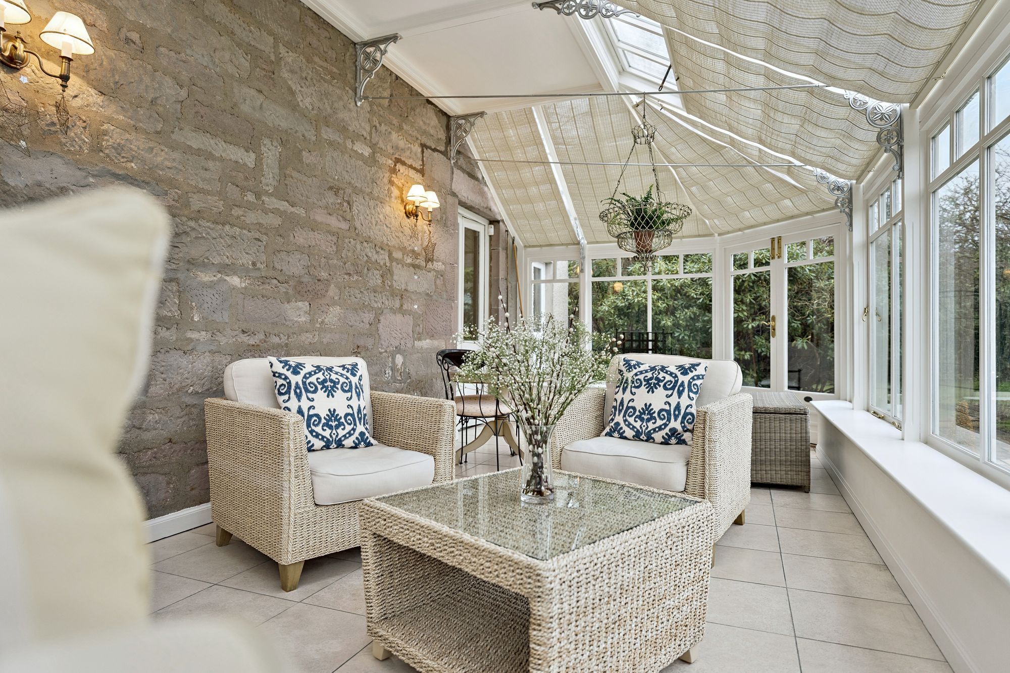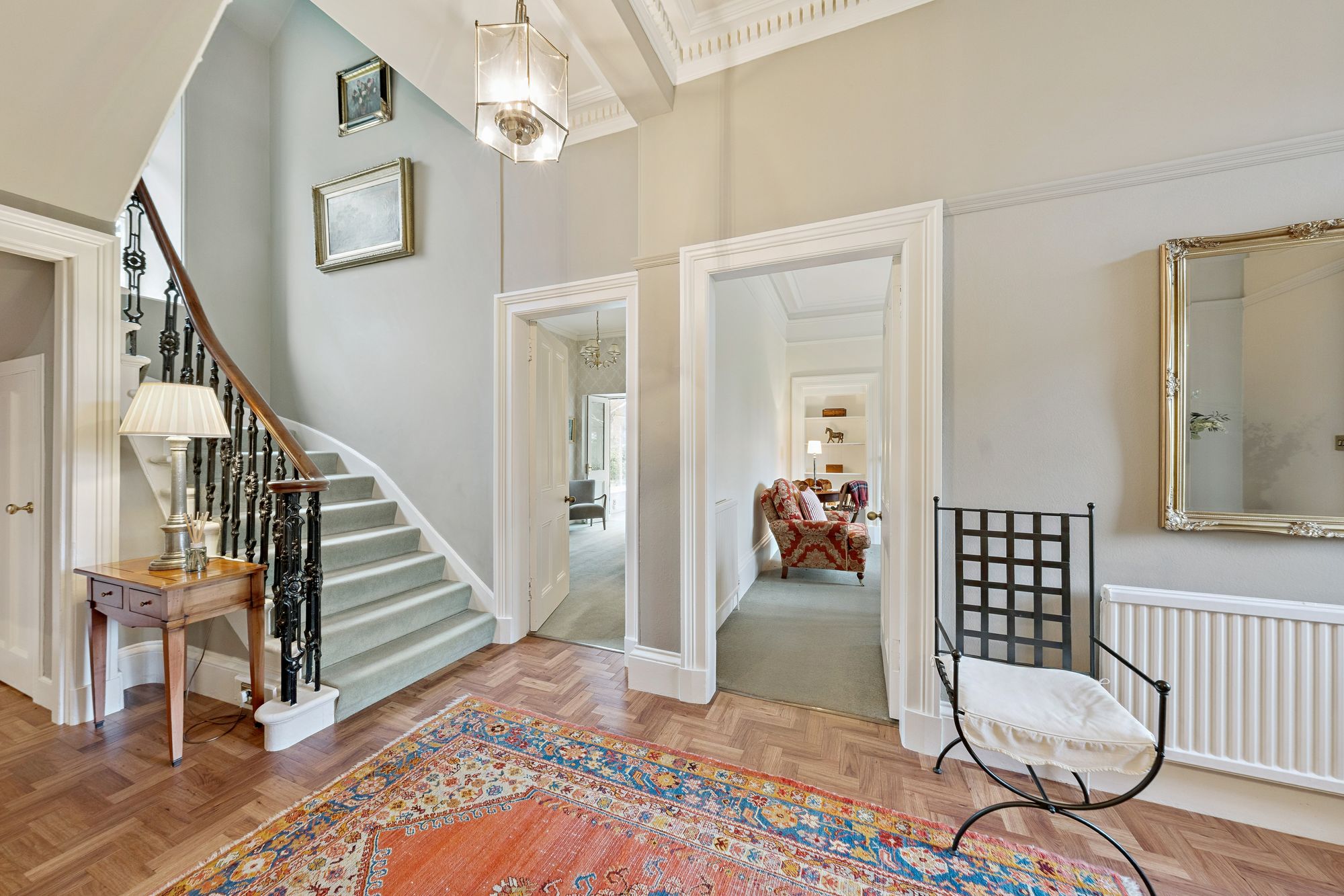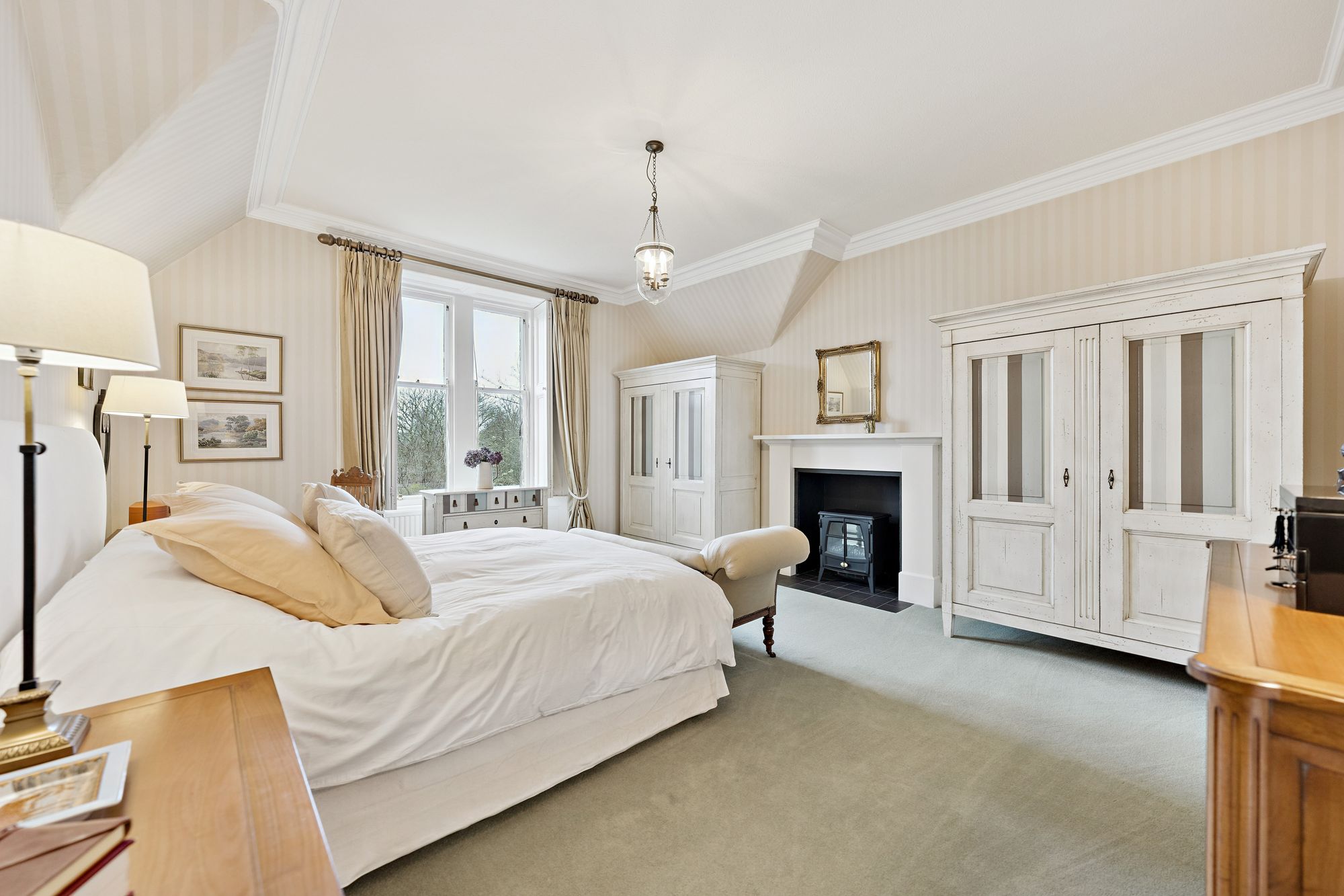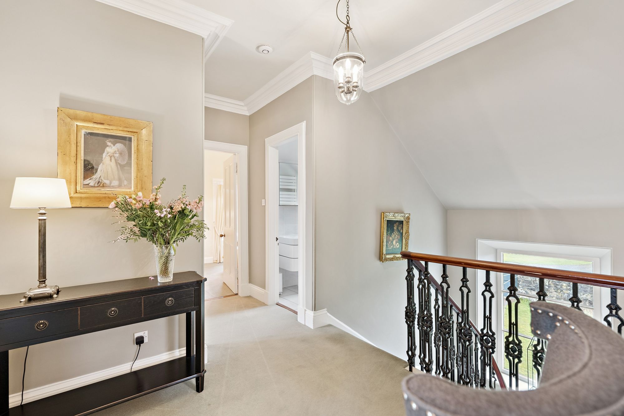 Internally, the accommodation is generously proportioned and exceptionally flexible, extending to eight principal apartments which allow for a variety of family living arrangements. A broad entrance vestibule opens into a welcoming reception hallway that immediately sets the tone for the elegant interior. The beautiful front-facing lounge features a striking focal point fireplace with an inset log-burning stove, creating a warm and inviting public space. In addition, there is a further, separate ground floor sitting room and a third public room, currently utilised as bedroom five, providing further versatility depending on lifestyle requirements. A rear hallway also gives access to a convenient ground floor wash room. One of the most impressive spaces within the home is the almost full-length sun-filled conservatory, which enjoys delightful garden outlooks and provides a superb setting for relaxing or entertaining throughout the seasons. The traditionally styled yet contemporary kitchen is arranged on a semi-open plan basis with a charming dining room that again features a wood-burning stove, forming a comfortable and sociable heart to the home. A practical utility area provides additional convenience for everyday living. A fabulous staircase rises gracefully from the entrance hallway, passing a striking mezzanine level window which floods the stairwell with natural light, before reaching the upper landing. From here, access is provided to four well-proportioned bedrooms, each offering comfortable accommodation. The front-facing bedrooms enjoy particularly attractive views across the gardens and surrounding greenery which must truly be seen to be appreciated. Completing the upper level are a separate WC/wash room and an additional shower room, providing excellent facilities for a busy household.