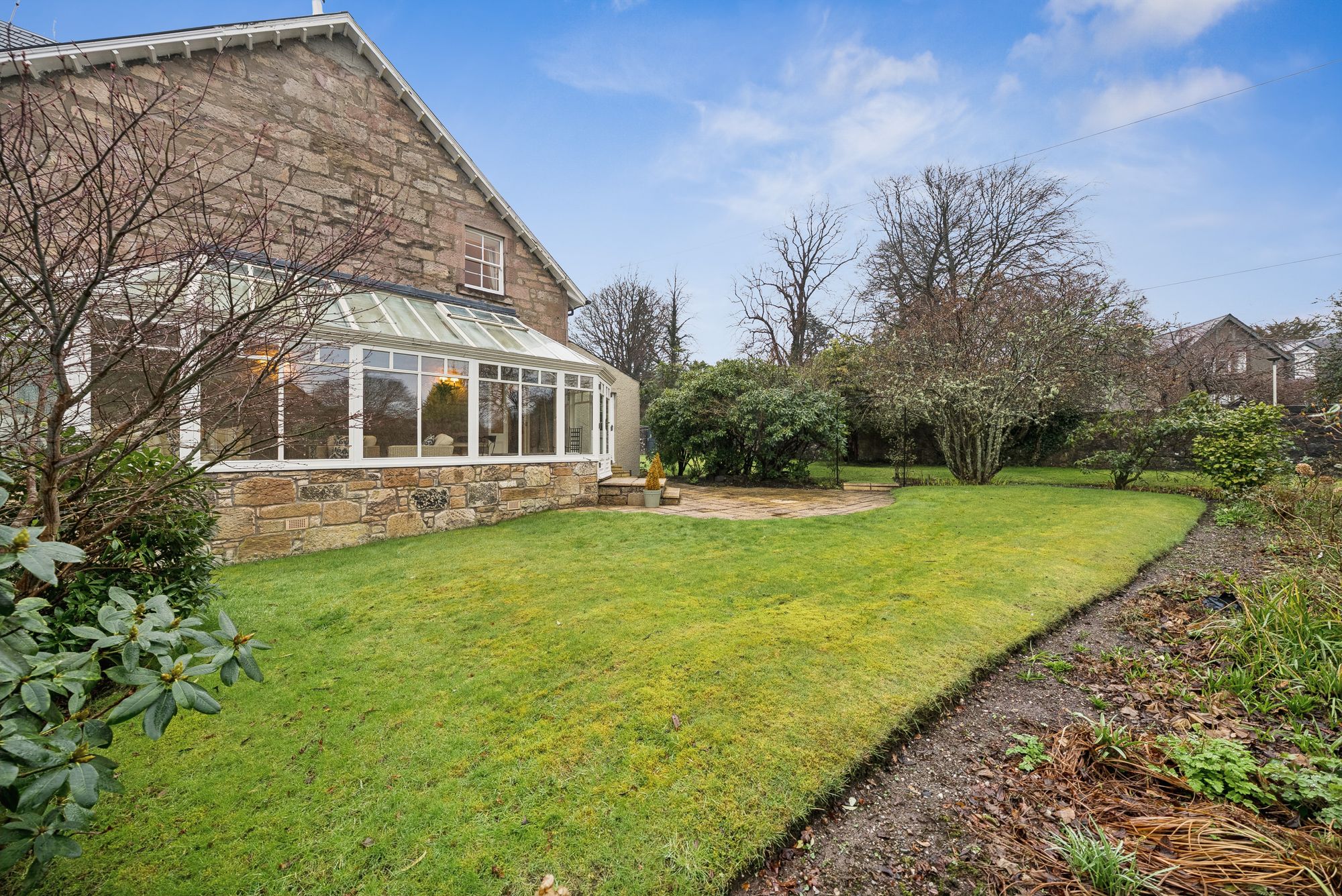 Externally, the property sits within generously proportioned and beautifully maintained garden grounds. To the front there is a manicured lawn bordered by a variety of mature plants, shrubs and trees, all enclosed by well-kept hedging that enhances privacy. A neatly laid mono-blocked driveway leads to a level parking area with space for three to four family vehicles and continues round to a detached garage. To the rear of the garage there is a substantial stone store with further storage found on an additional storeroom/workspace behind the utility room within, ideal for hobbies or storage. The rear gardens have been thoughtfully arranged for both ease of maintenance and family enjoyment, incorporating a combination of patio and lawned areas further extending down the side. These grounds provide an ideal environment for outdoor entertaining, children’s play or simply enjoying the peaceful surroundings.