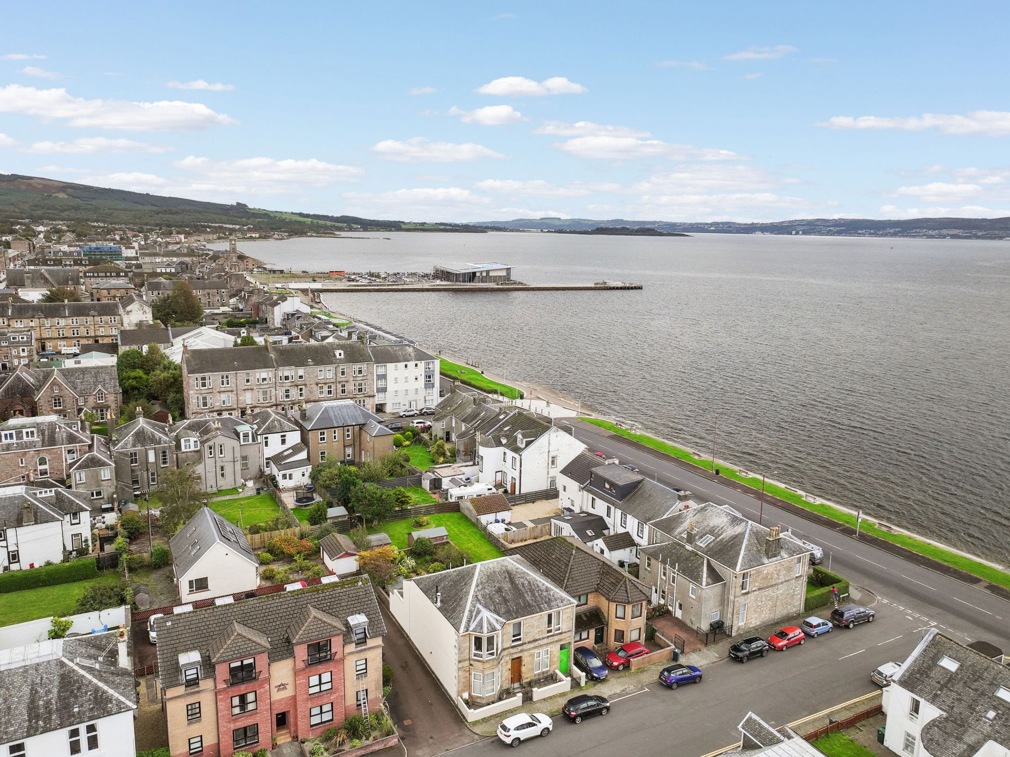 Inside, a large and welcoming reception hall with high ceilings sets the tone for the rest of the flat. The spacious lounge is flooded with natural light from a beautiful bay window, offering open views across the town and featuring a charming fireplace as its focal point. To the rear, the generously sized dining kitchen comes fitted with a range of wall mounted and counter level units, offering ample storage and workspace. A handy utility off the kitchen adds extra storage space. There are three well proportioned bedrooms, including a spacious master with built in double wardrobes and lovely views towards the water. The second bedroom comfortably accommodates a double bed, while the third, also of a good size, is currently used as a home office. The bright and airy shower room is fitted with a walk-in shower enclosure, vanity wash hand basin, and wc. The property benefits from a mix of PVC double glazing and older-style aluminium framed sash and case windows, with mains gas supply and gas coal-effect fire in the lounge.