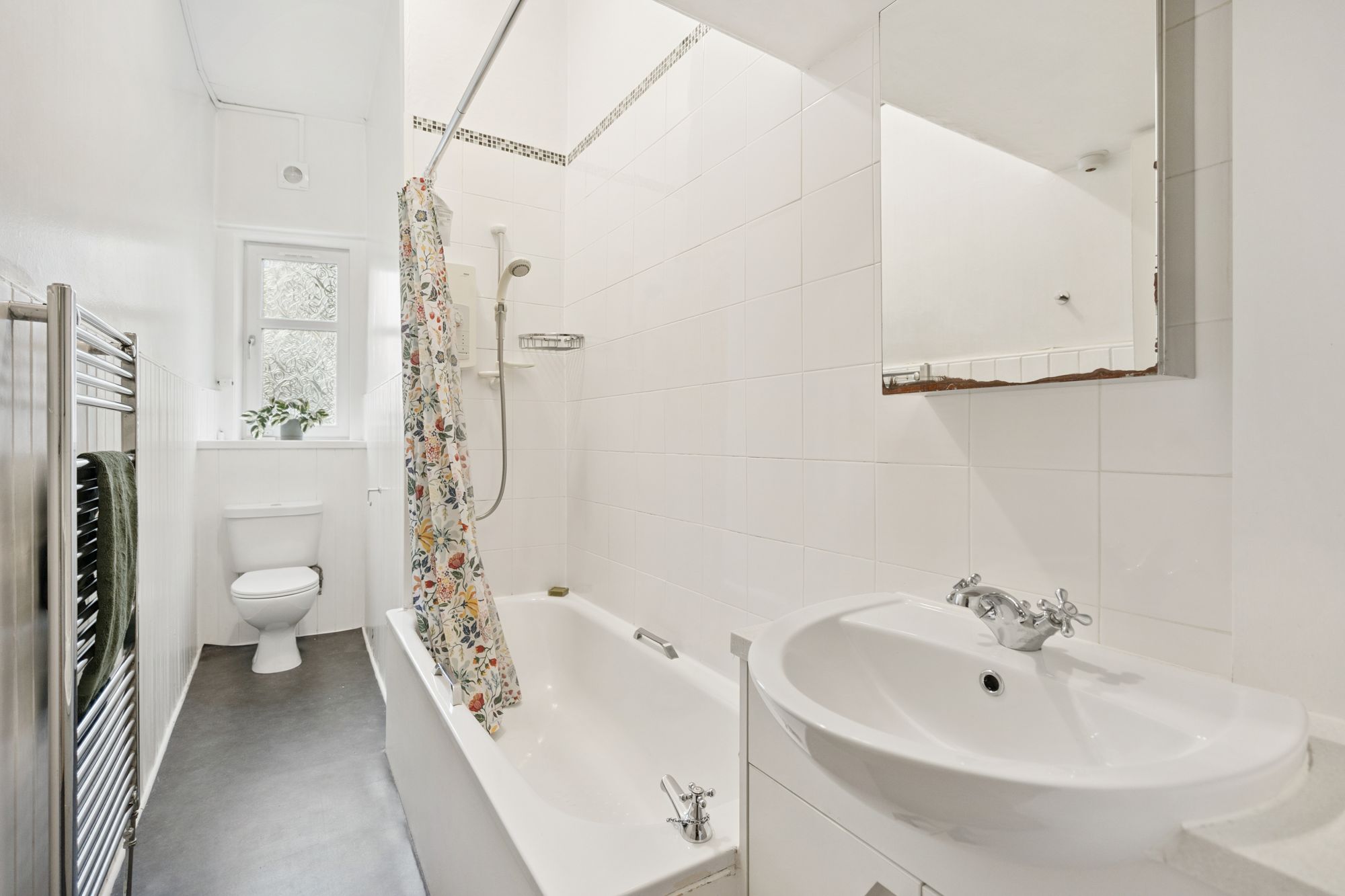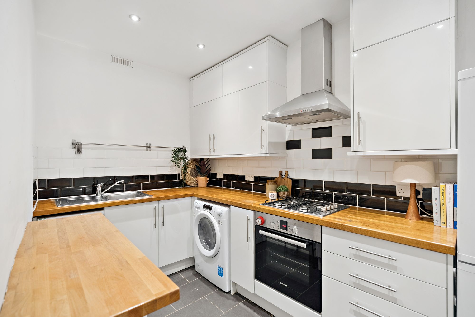 The principal bedroom is quietly positioned to the rear and benefits from two generous storage cupboards, along with double patio doors providing direct access to the well-kept communal garden. The second double bedroom, currently utilised as a home office, is located to the front and offers ample space for a double bed and additional furnishings. The accommodation is completed by a well-appointed bathroom featuring a shower over bath.