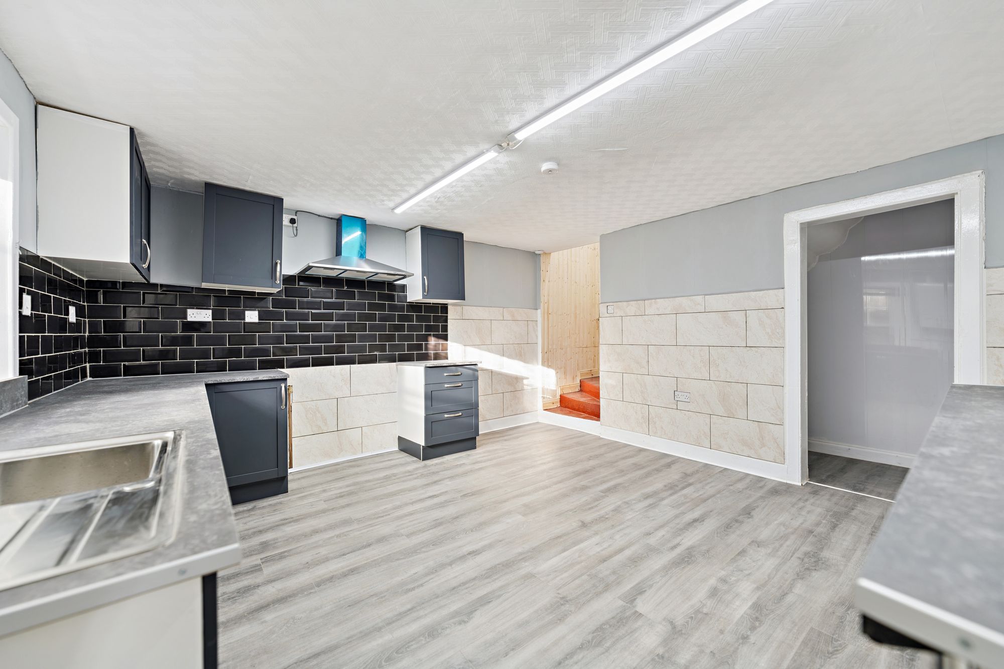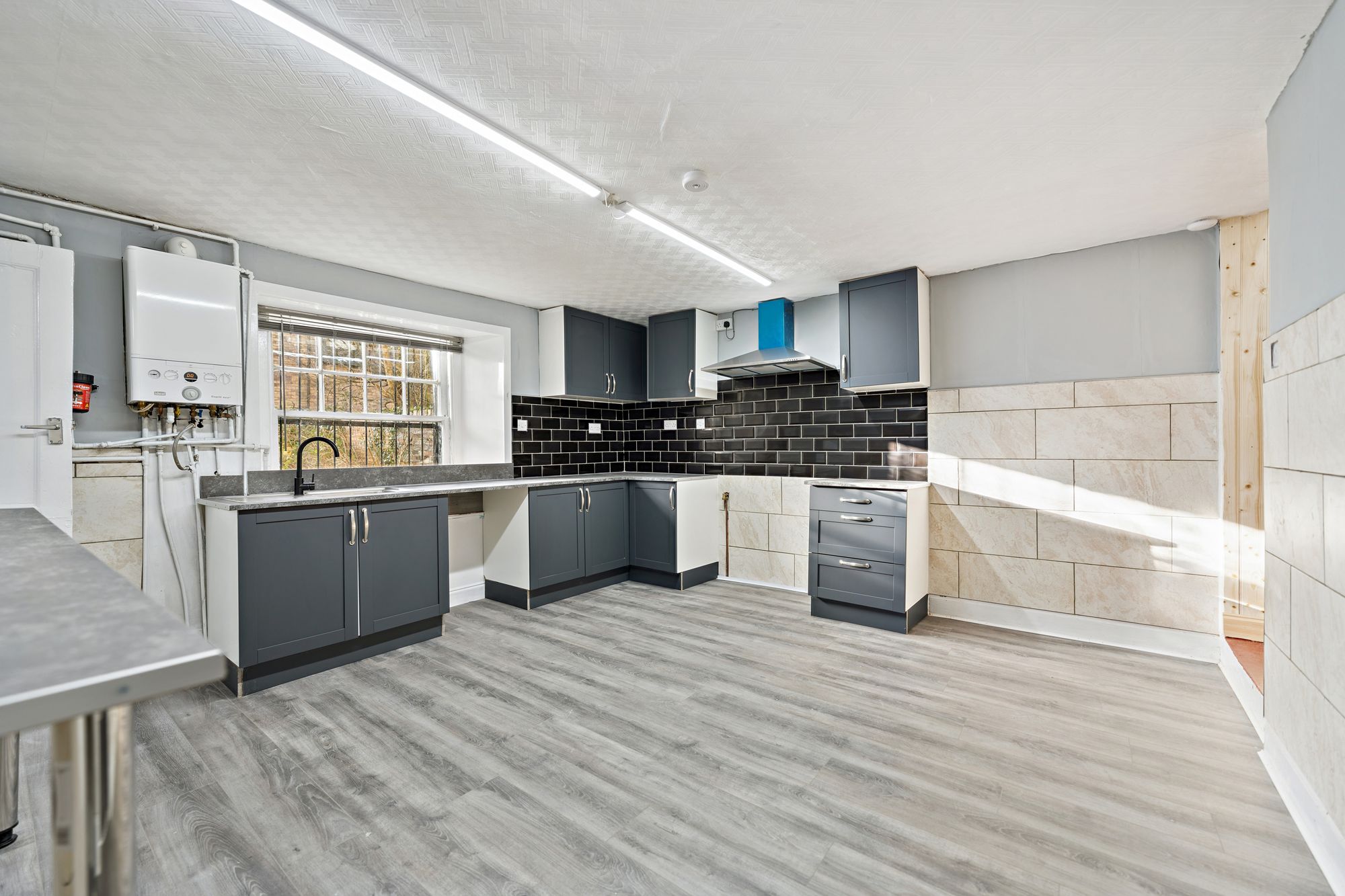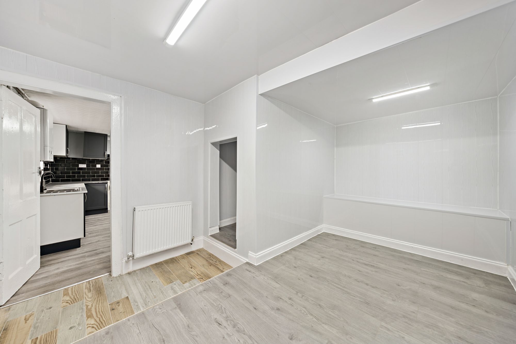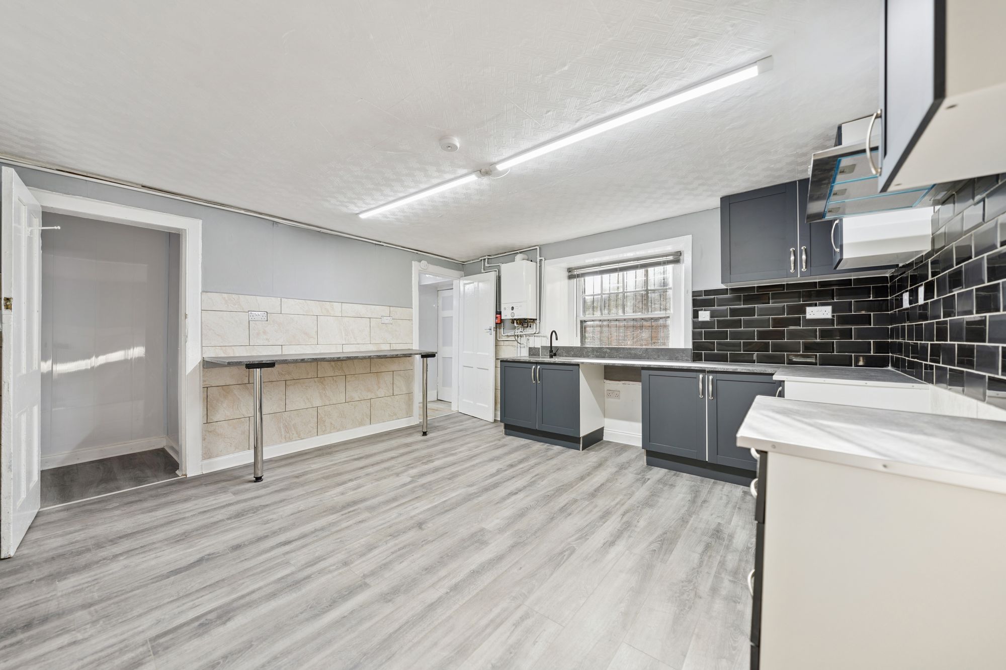 A staircase leads to the lower level where a modern, dining-sized kitchen is located, complete with a useful pantry/utility room. Further storage is provided by an additional store room, while a rear door offers direct access to the communal garden.