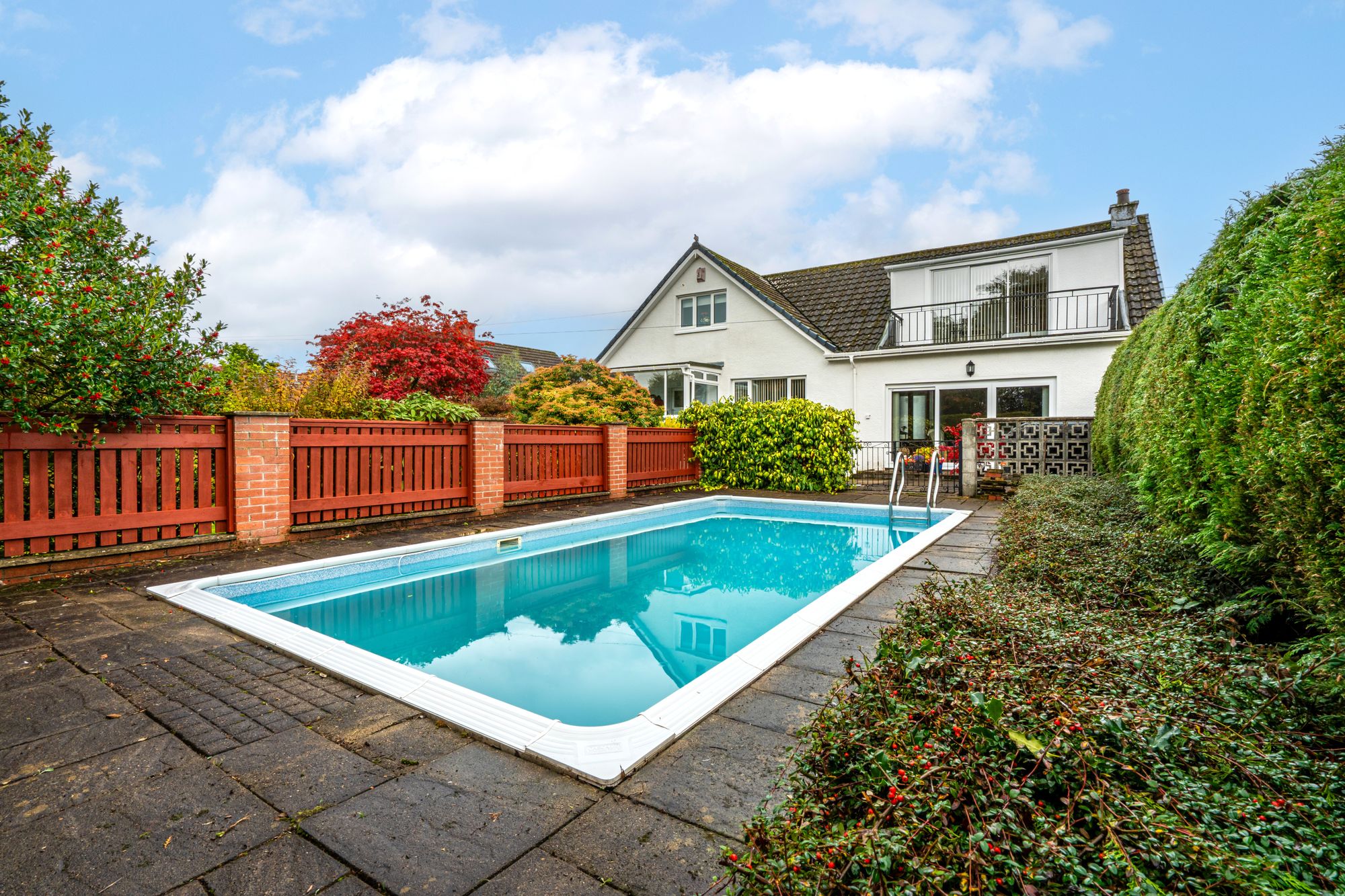 A notable highlight of the home is the swimming pool set within the rear garden—an exceptional and rare feature—offering a private leisure experience in the comfort of your own grounds. Enhancing the character further is a Chubb safe embedded in granite, subtly integrated into the design for both practicality and style.