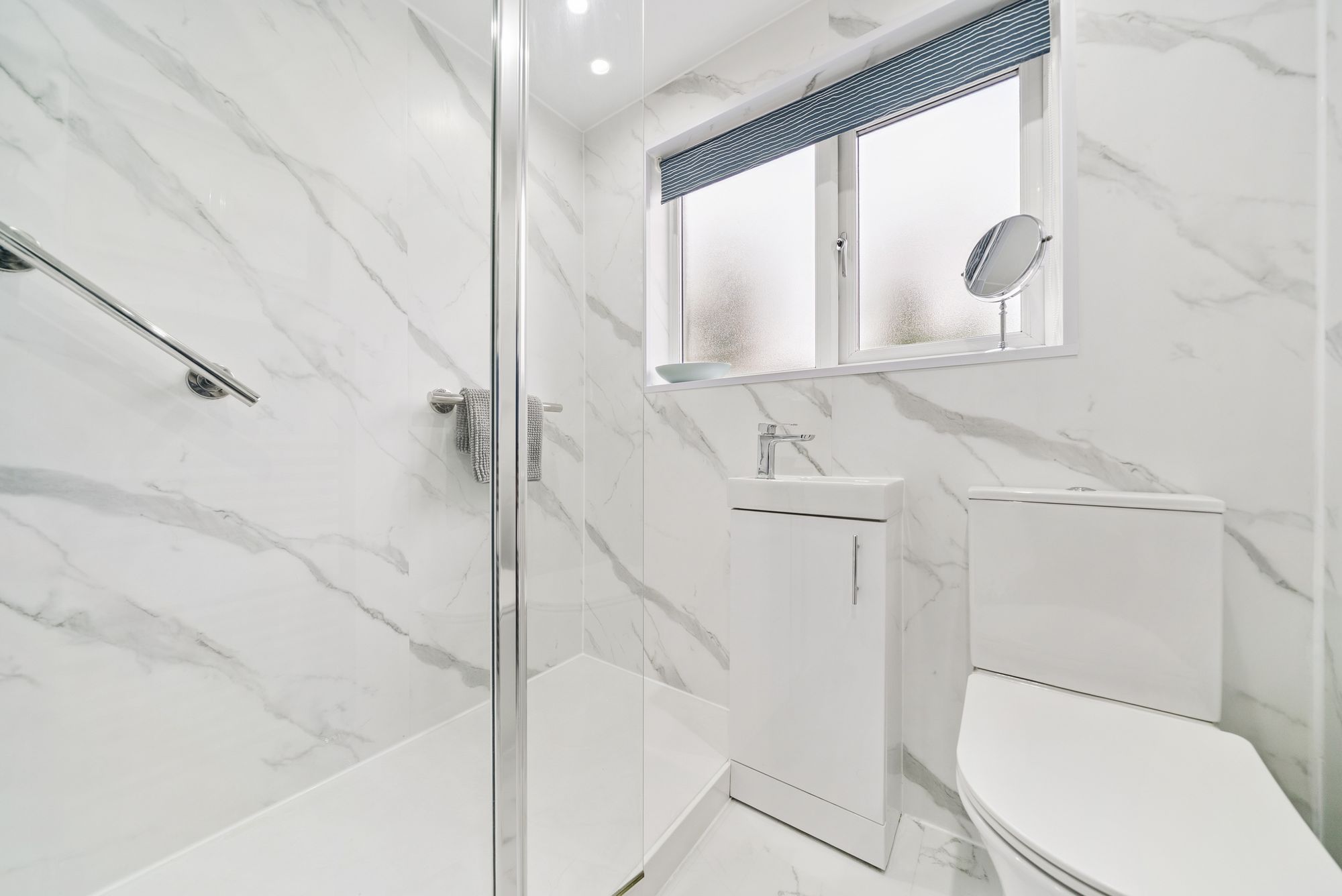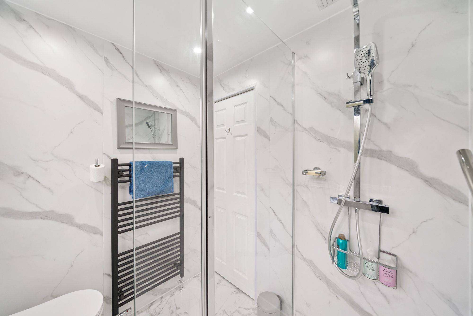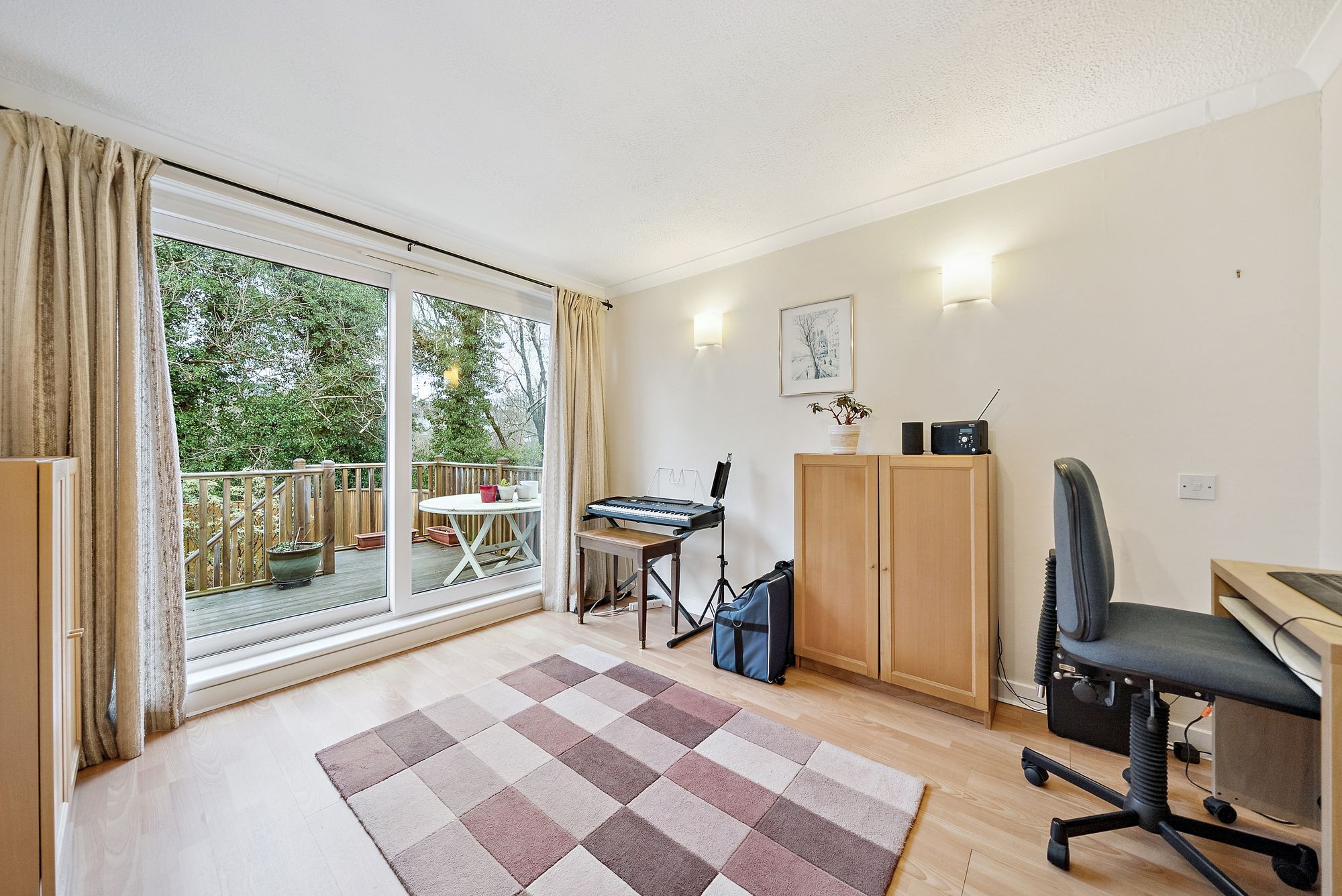 Internally, the property is presented in neutral, tasteful décor, with accommodation beginning in a spacious entrance hall. French doors lead through to an open plan lounge featuring a focal point gas fire and opening into the dining area. The shaker style kitchen is fitted with a range of white wall and base units complemented by wood work surfaces and includes an integrated oven and gas hob. The kitchen leads into a separate dining area with sliding doors opening onto the garden decking, while a separate family room currently being utilised as a study also benefits from sliding doors leading outside. On the upper level there are two well proportioned bedrooms, along with a refitted shower room incorporating contemporary white sanitary ware, a vanity unit, walk-in rainfall shower and heated towel radiator.