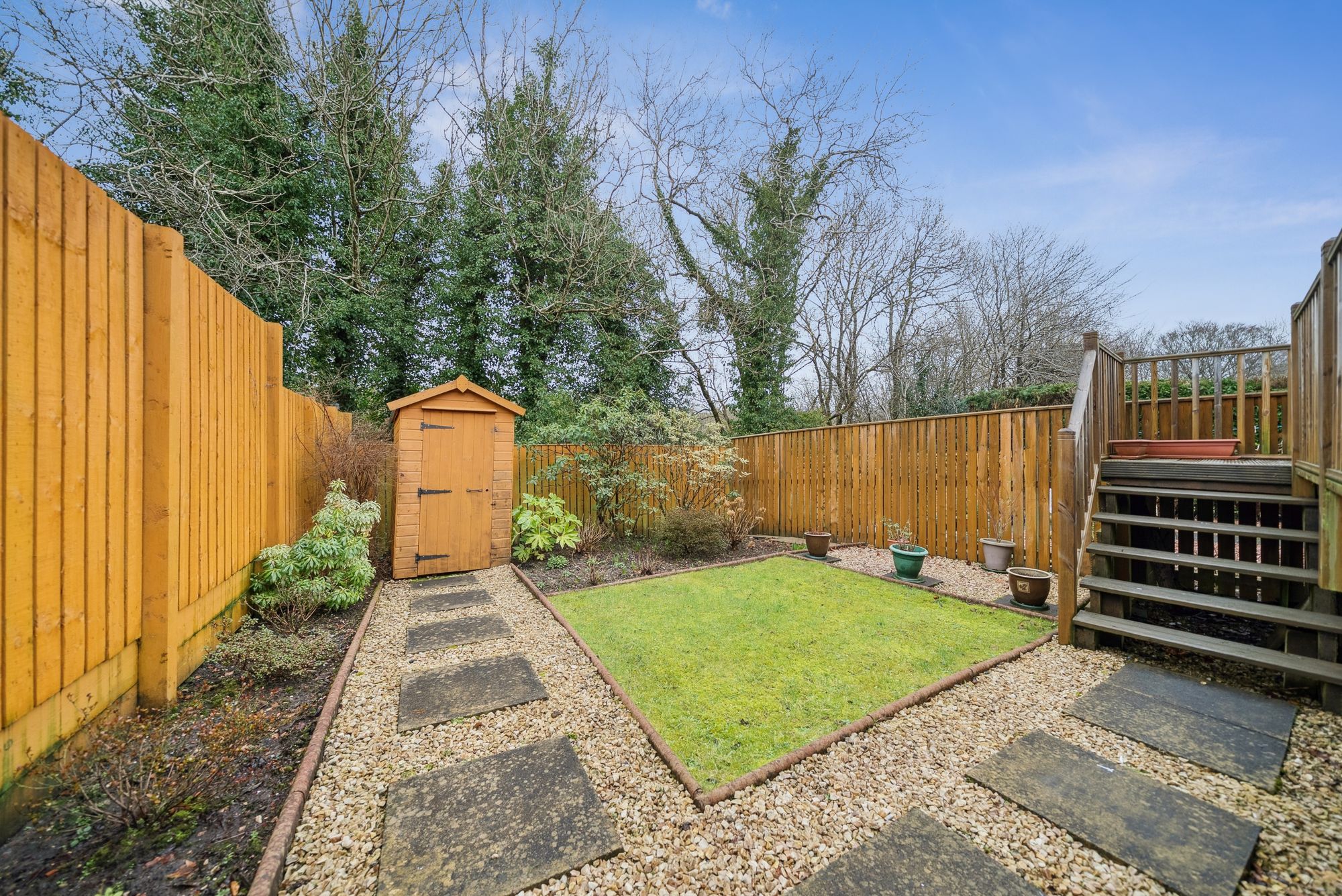 Externally, the property is approached via a landscaped front garden, with a long slabbed and gravel driveway providing parking for several vehicles and extending along the side of the house to a timber gate giving access to the rear garden. To the rear, a decked area with steps leads down to a well-maintained garden with level lawn and gravel areas, bordered by mature trees and shrubs. The gardens are well screened, offering a high degree of privacy and attractive outlooks with timber fencing, beyond which lies a colourful tree-lined backdrop.
