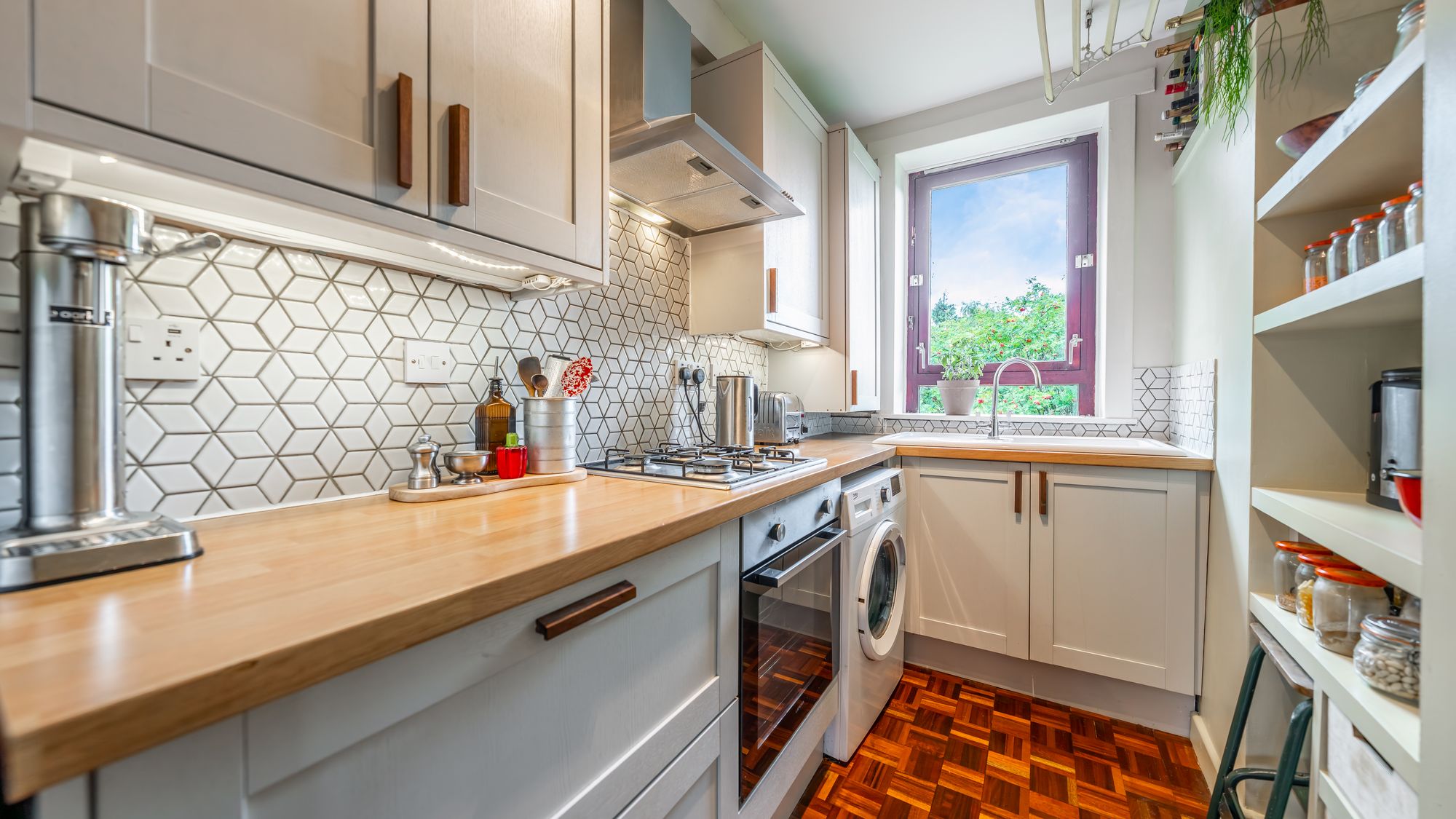 The property offers two generous double bedrooms; both flooded with natural light. The stylish fitted kitchen features modern wall and floor-mounted units, integrated appliances, and ample worktop space. A modern family bathroom completes the accommodation with shower over bath.