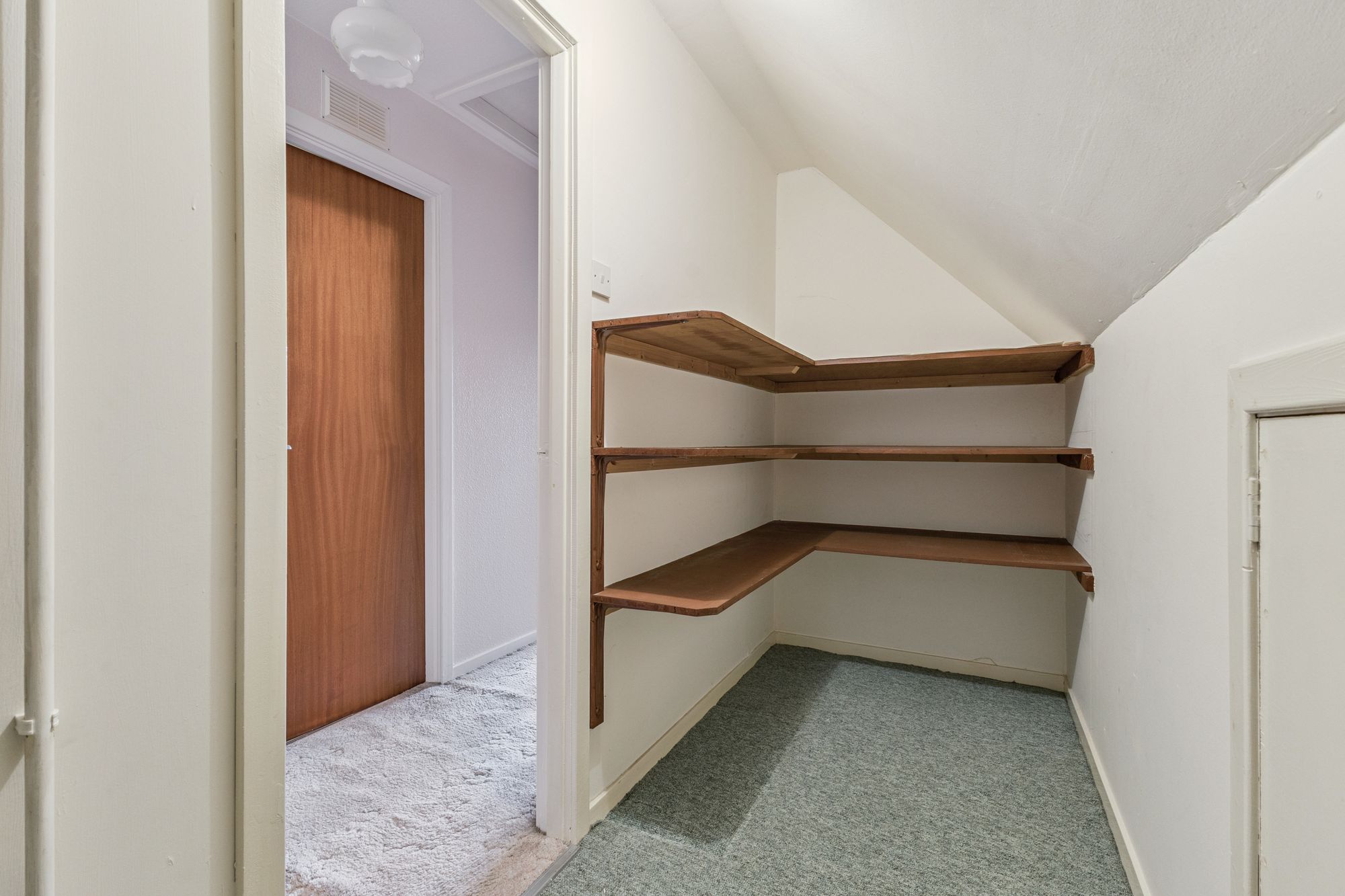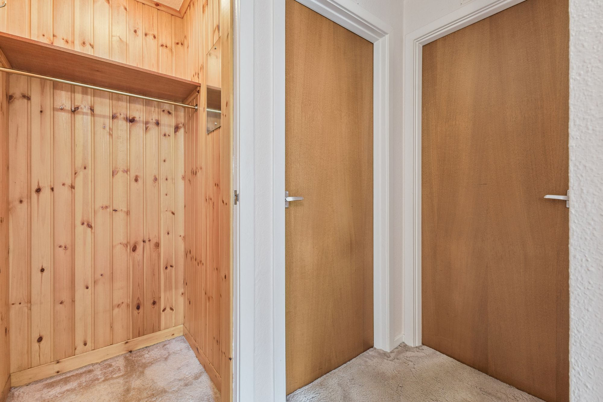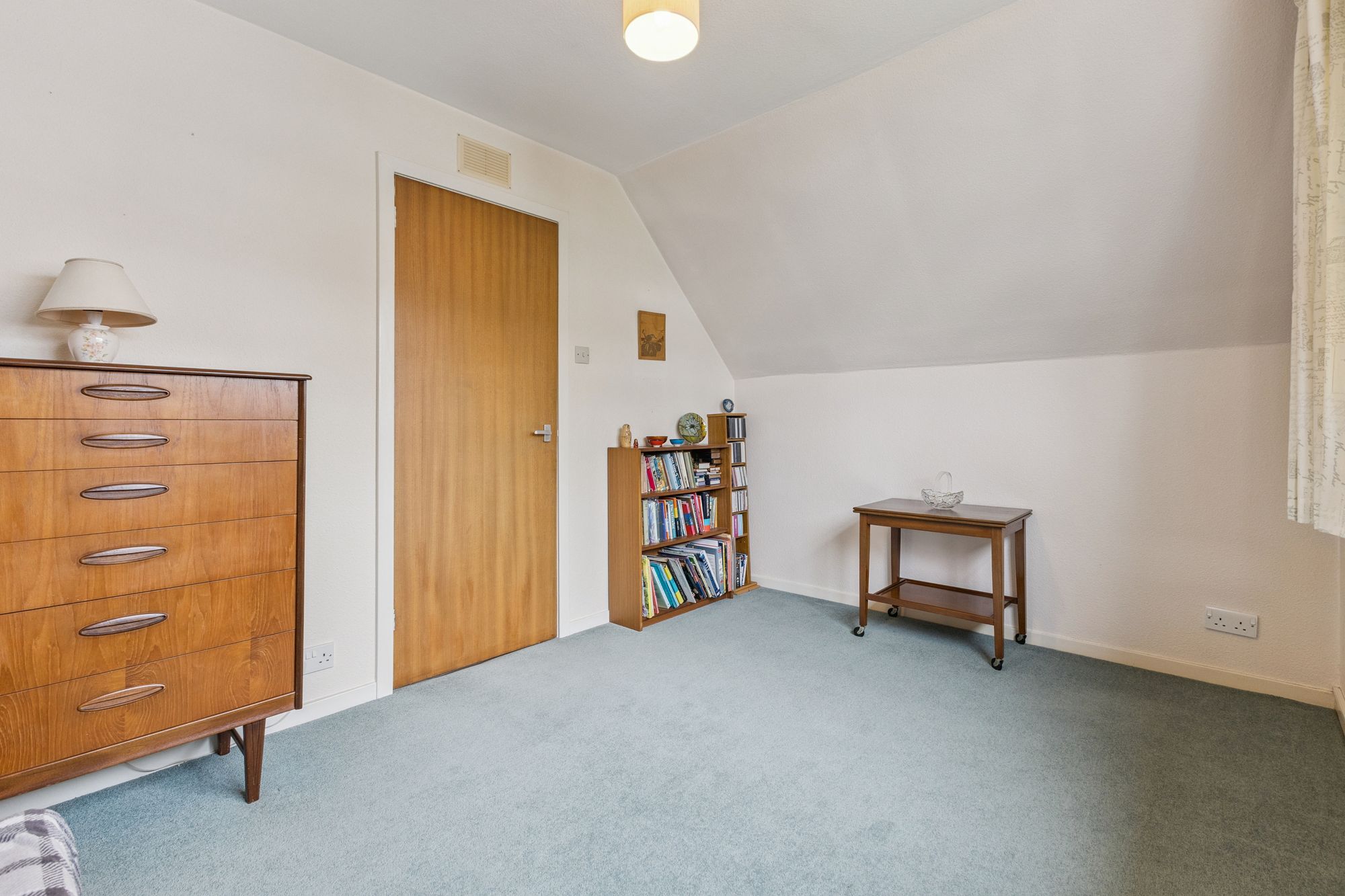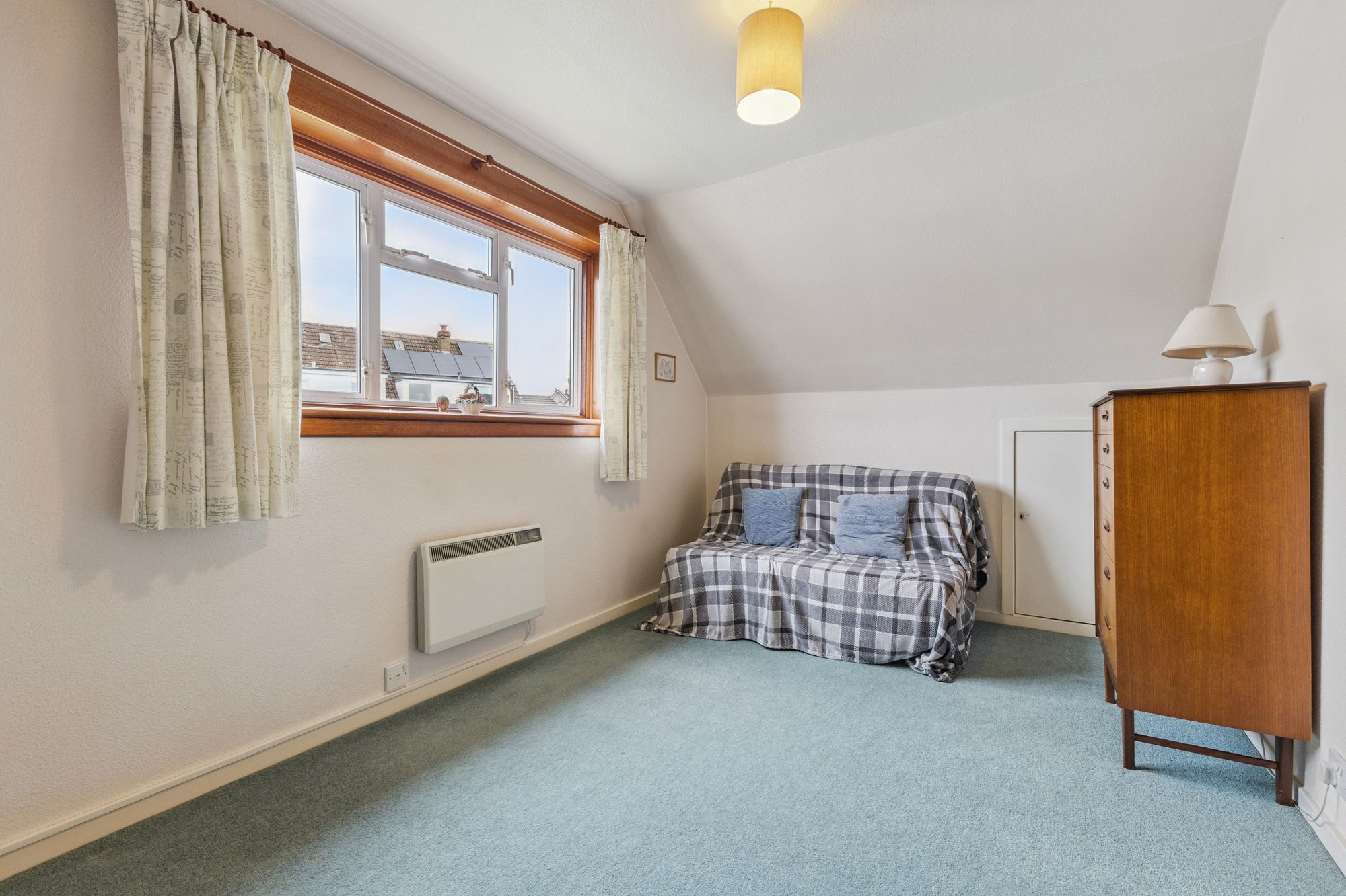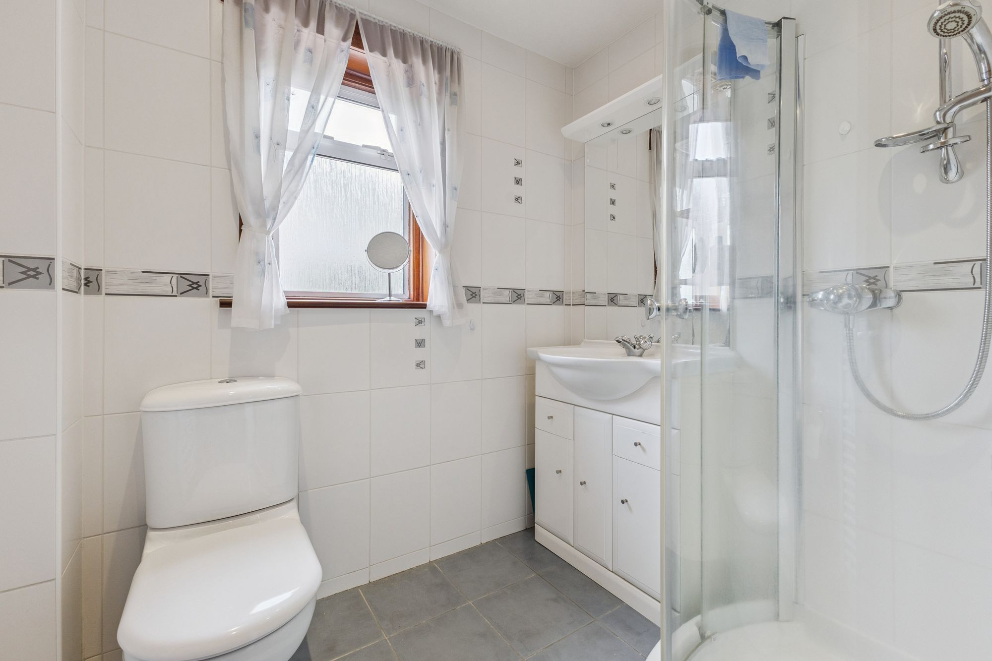 A carpeted staircase leads to the upper landing, which benefits from a large walk-in cupboard with access to eaves storage. The principal bedroom includes fitted wardrobes and an additional cupboard, while the rear bedroom also provides access to eaves storage. A second shower room is located on this level and is equipped with a shower cubicle, electric shower, wall-mounted towel rail, wash hand basin, and WC.