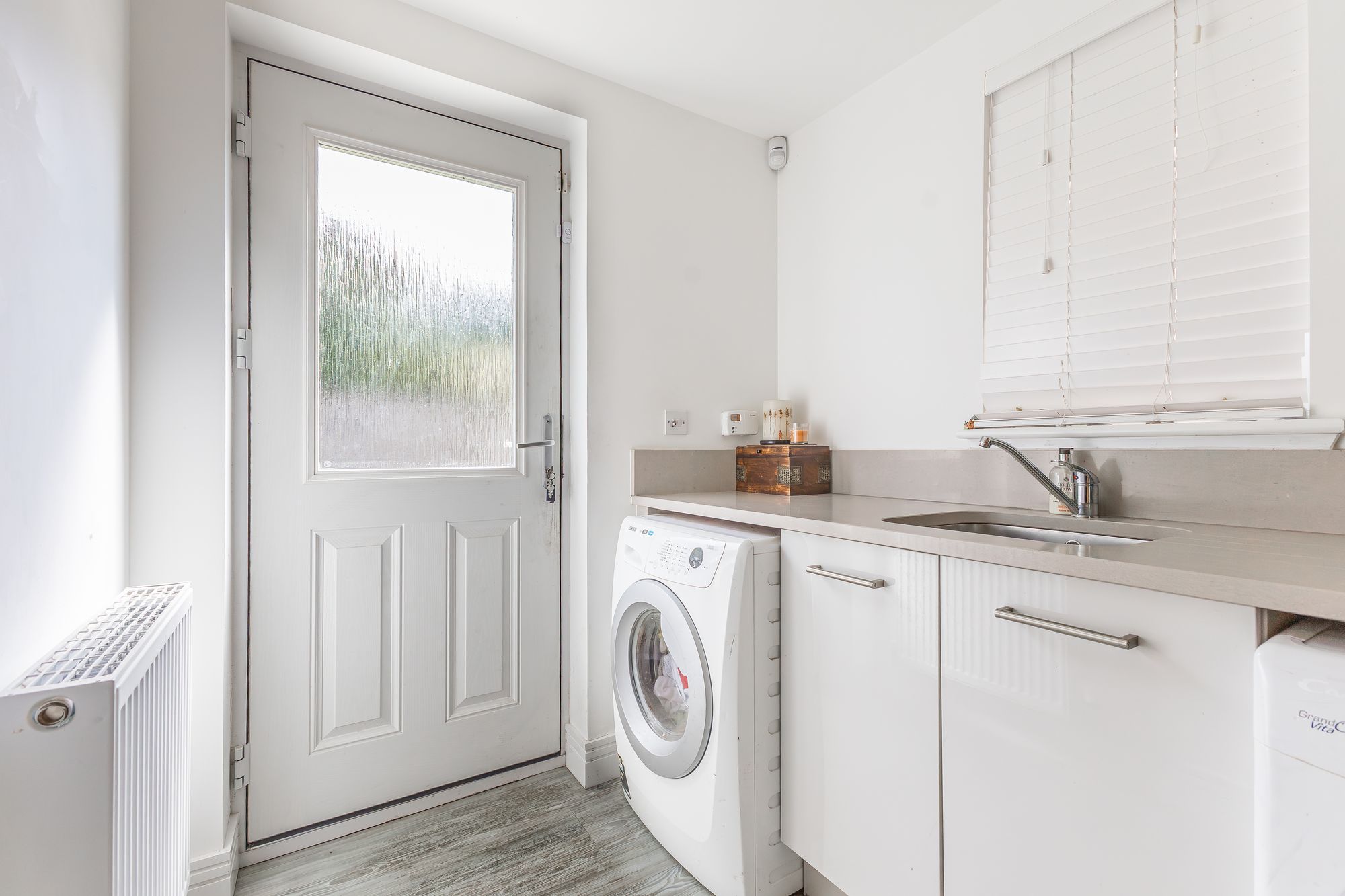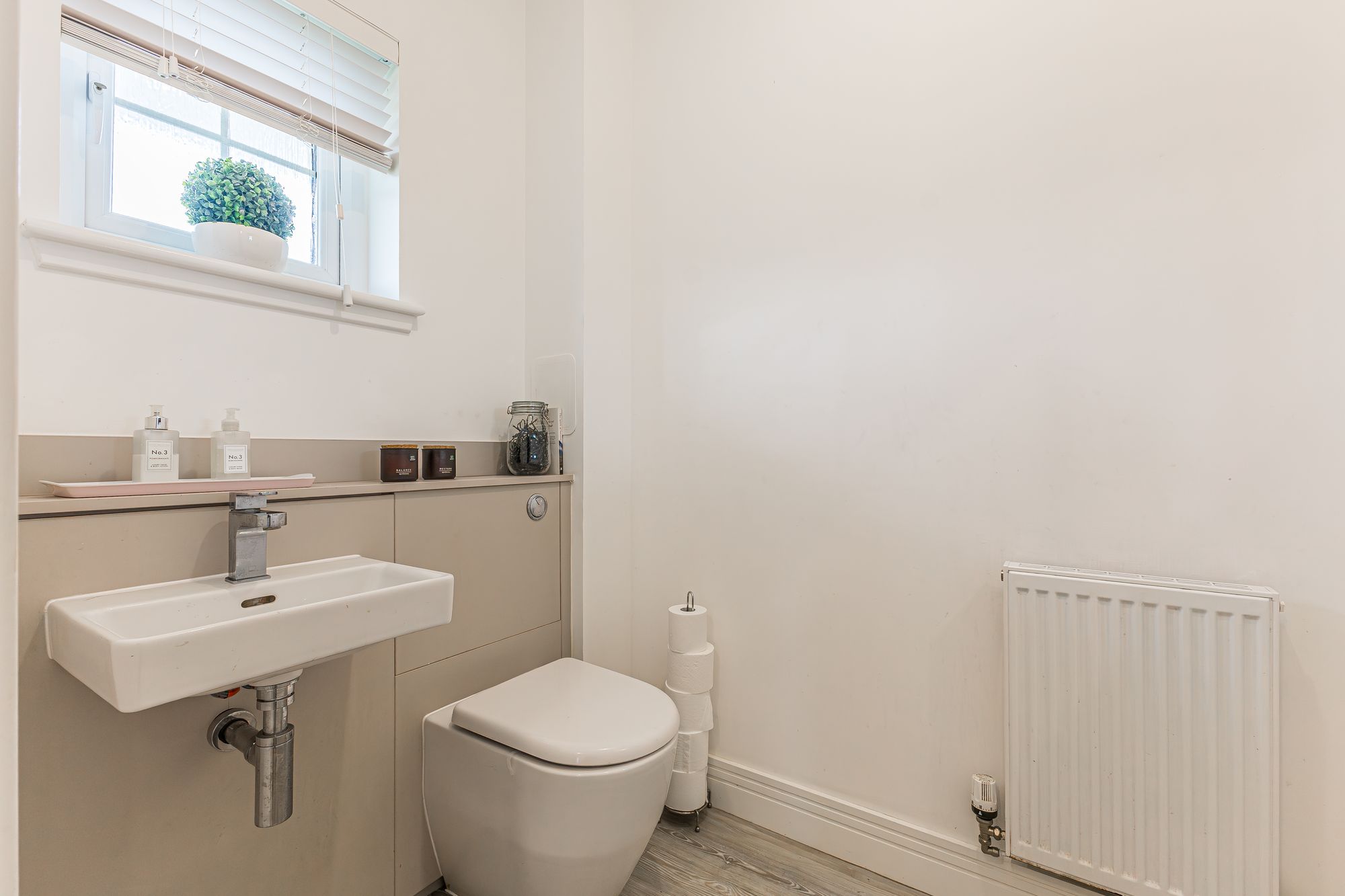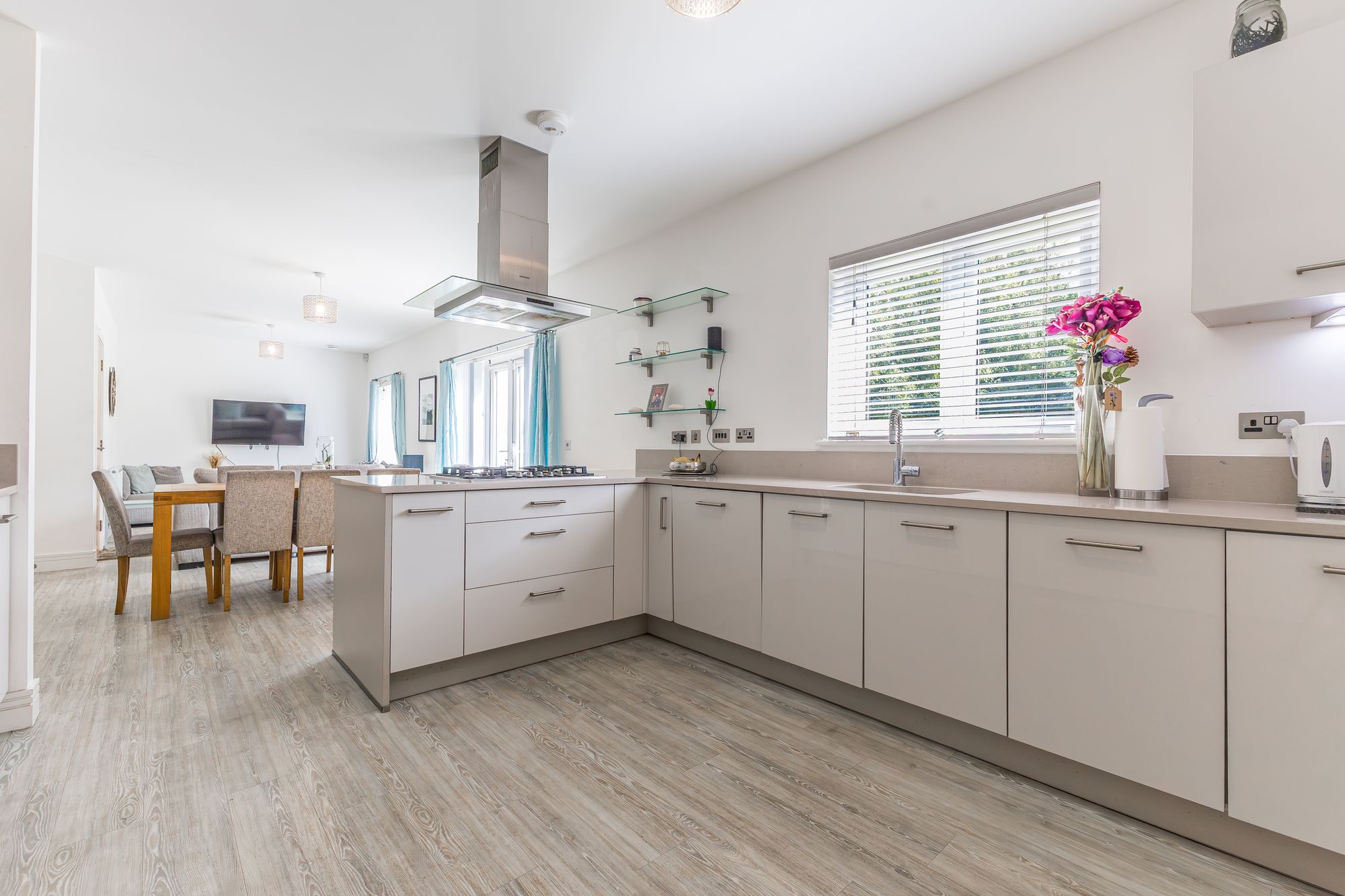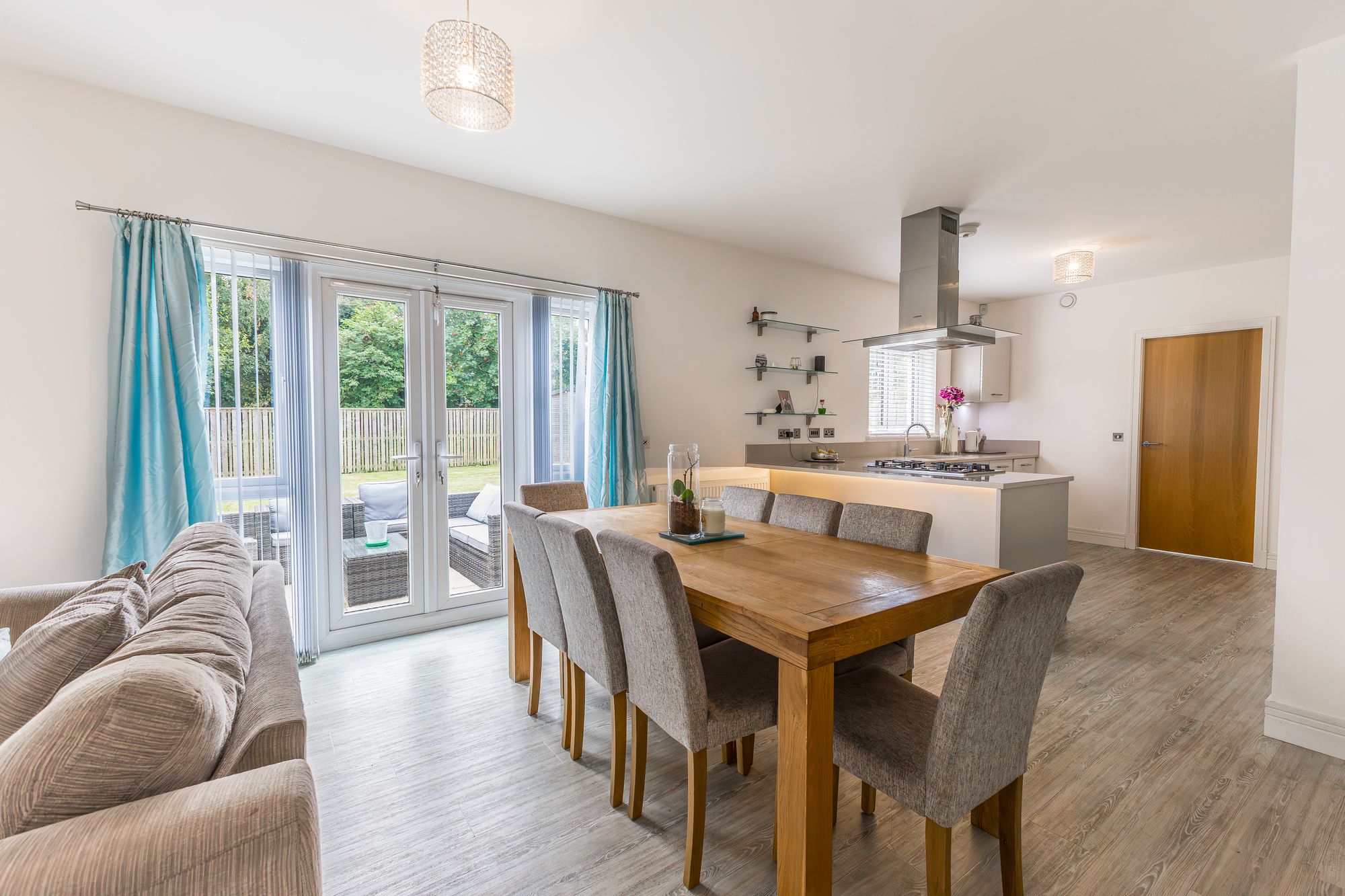 At the heart of the home lies the impressive open-plan kitchen and dining area, designed with both everyday family life and entertaining in mind. The modern kitchen features sleek cabinetry, a breakfast bar, and an adjoining utility room for added convenience. The spacious dining area easily accommodates a large table and enjoys direct access to the rear garden via elegant patio doors-perfect for al fresco dining during the warmer months. A ground floor WC completes the downstairs accommodation.