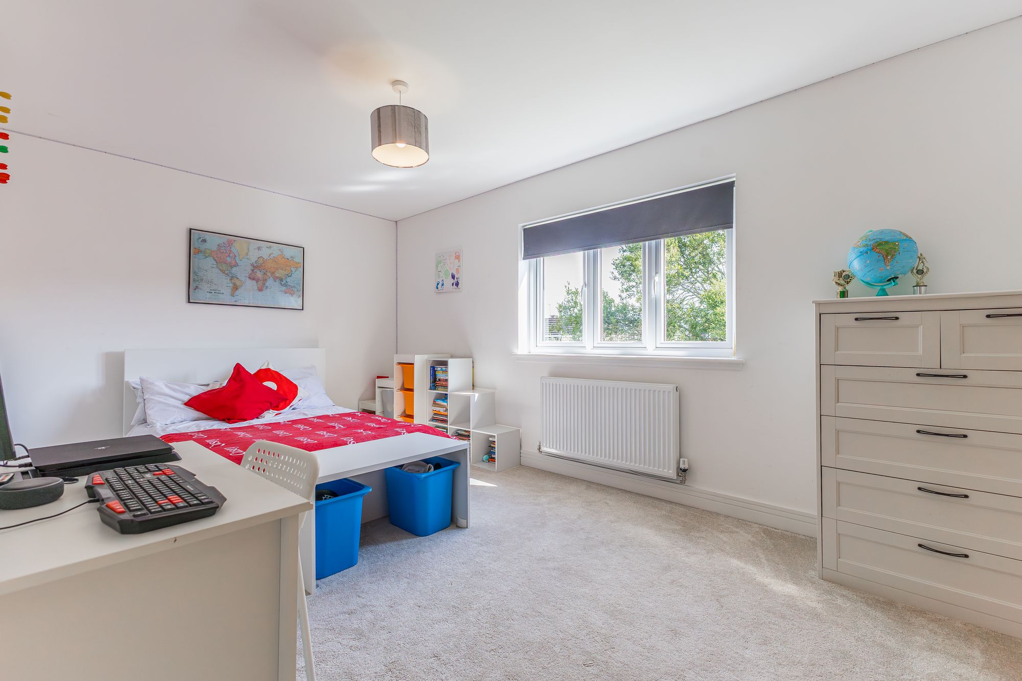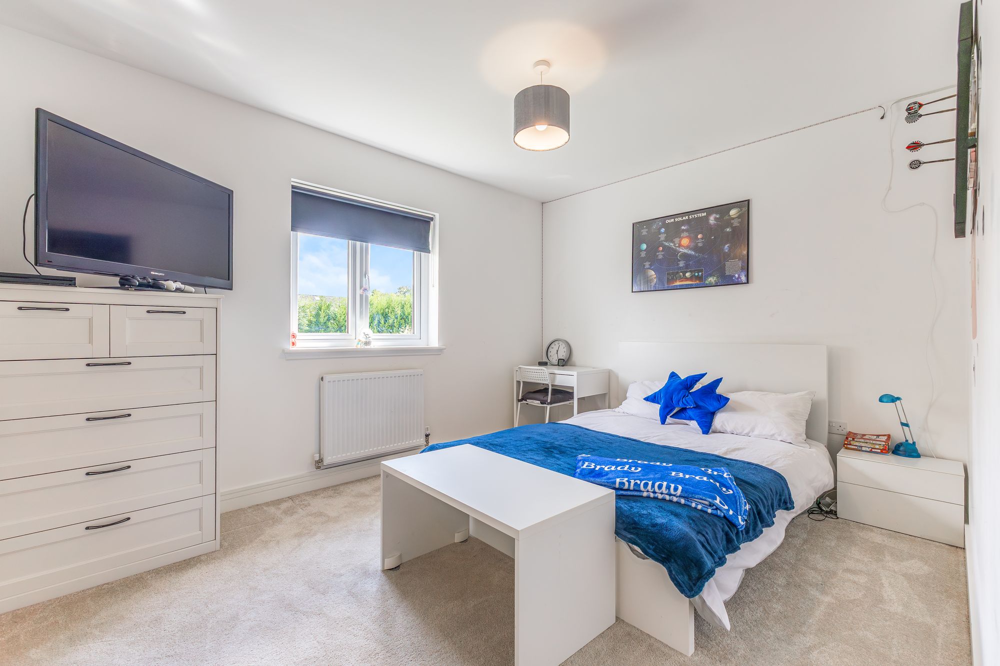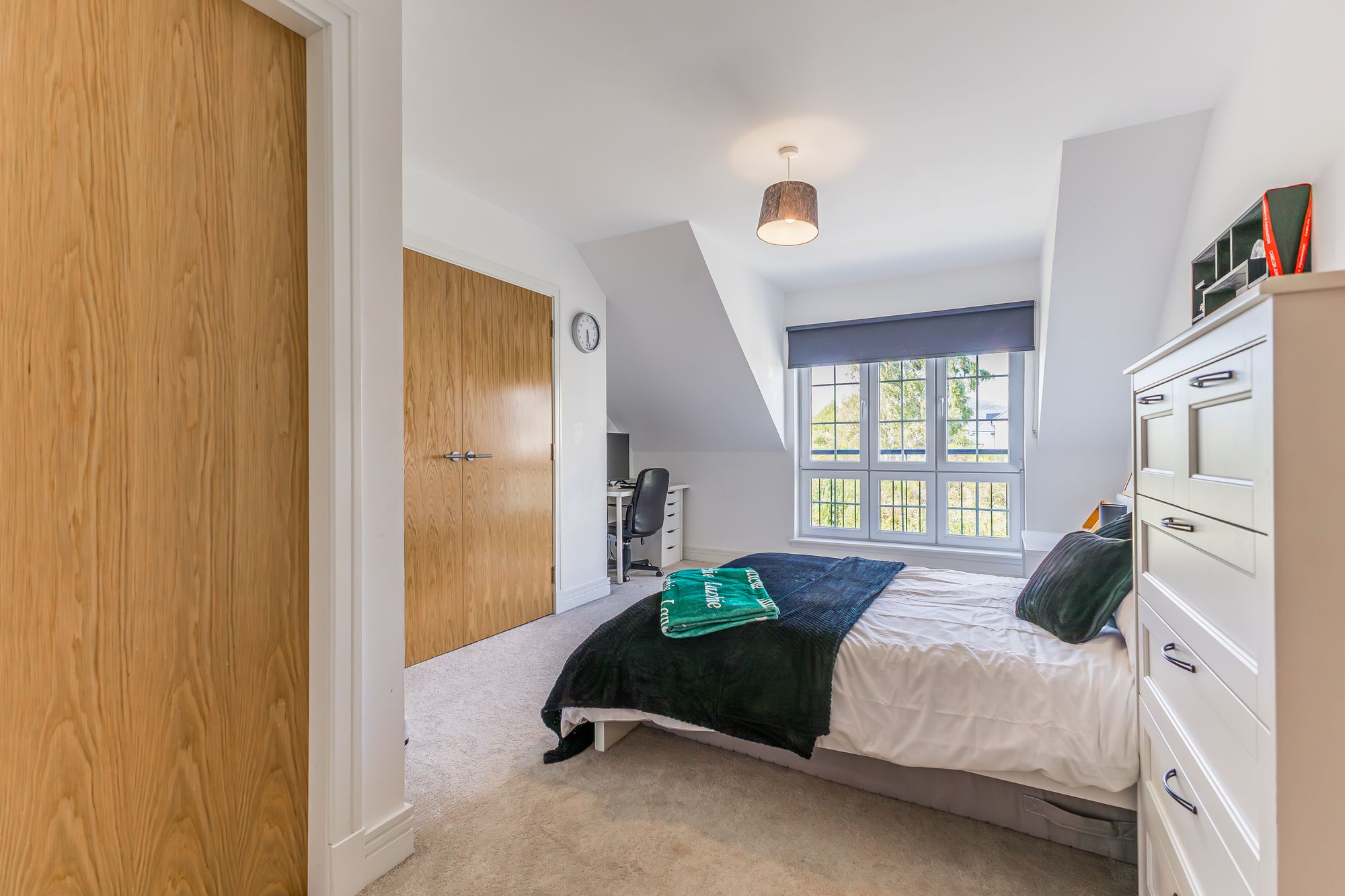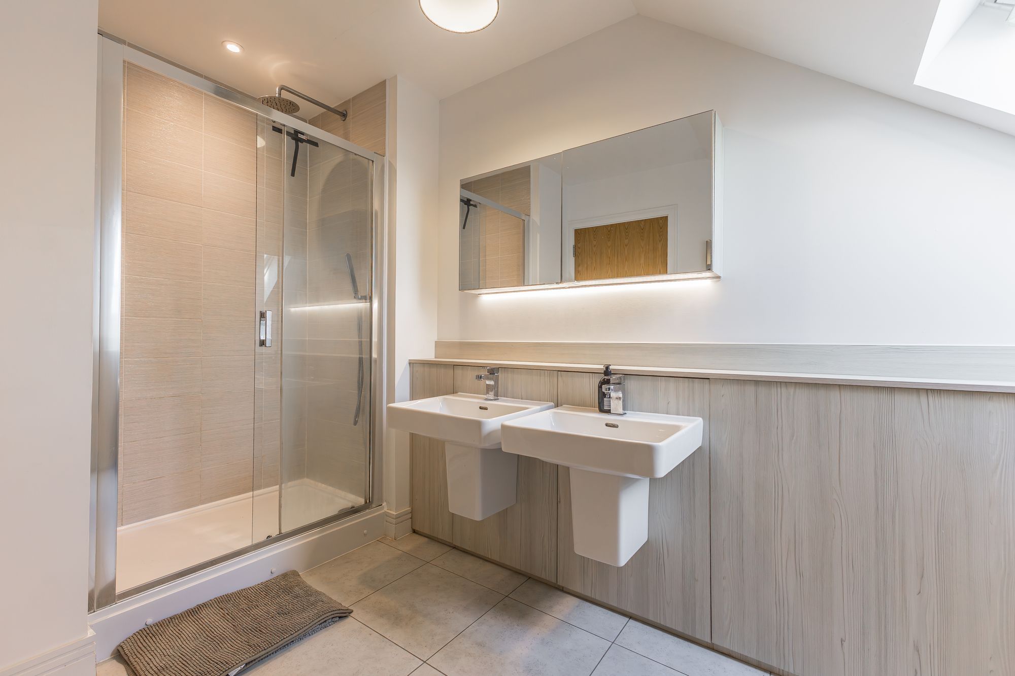 Upstairs, the bright upper landing gives access to five generously proportioned double bedrooms, all finished to a high standard. The principal bedroom is a luxurious retreat, complete with fitted wardrobes and a beautifully appointed en-suite bathroom featuring a double vanity unit, LED mirror, and a large shower enclosure with floor-to-ceiling tiling. The second bedroom also benefits from its own en-suite, presented in the same immaculate style. All further bedrooms offer excellent space, built-in storage, and quality carpeting for comfort.