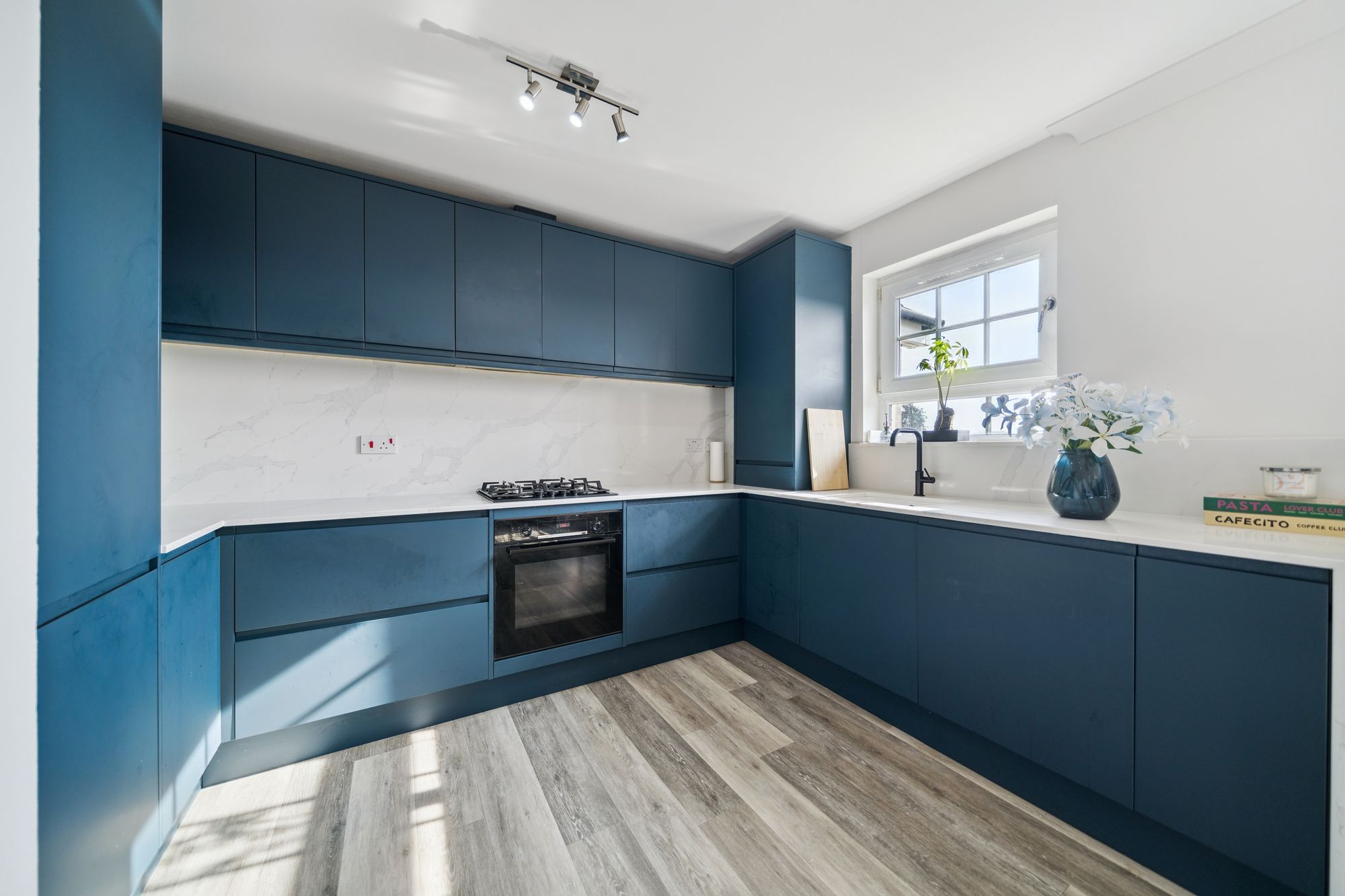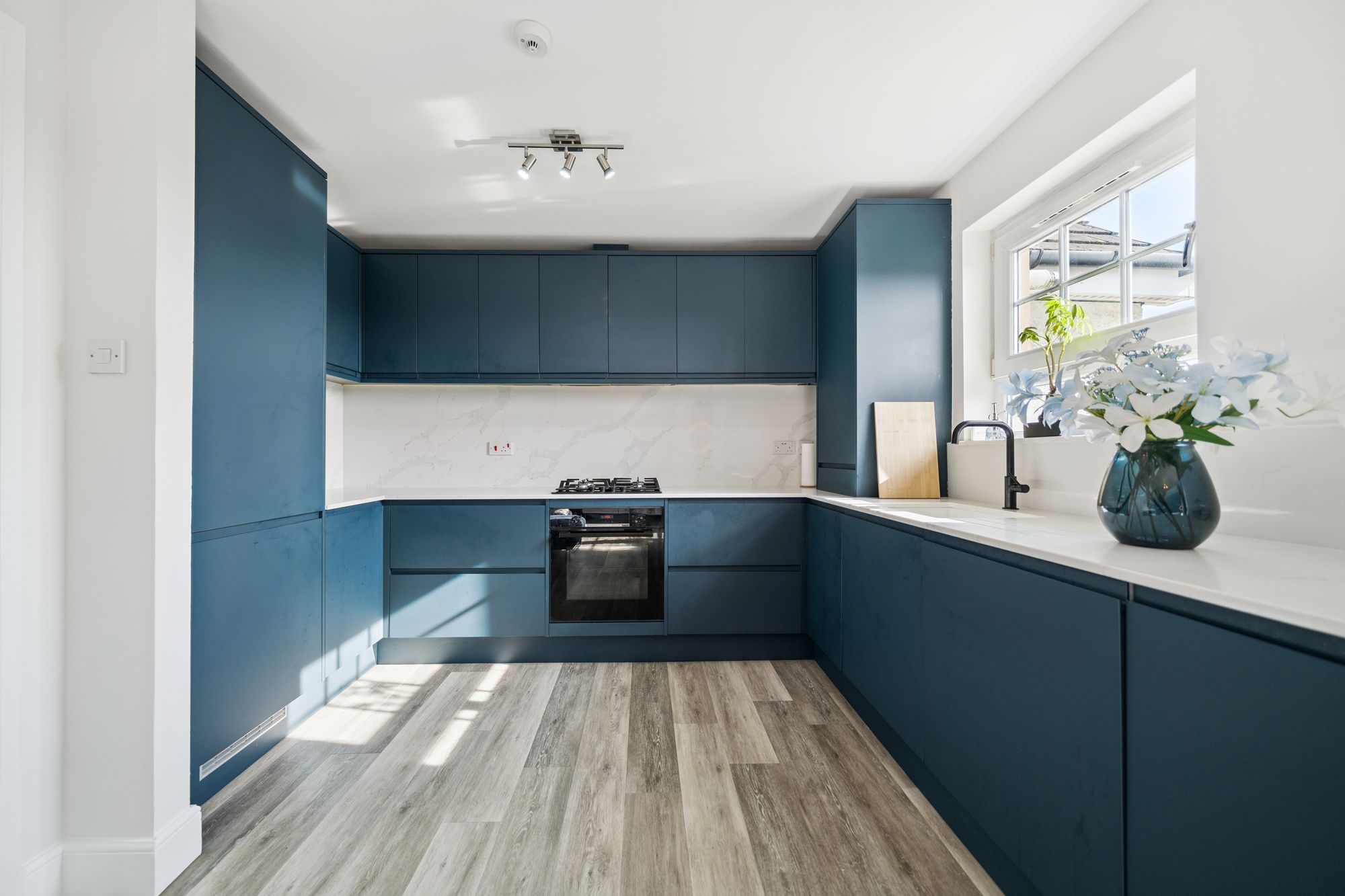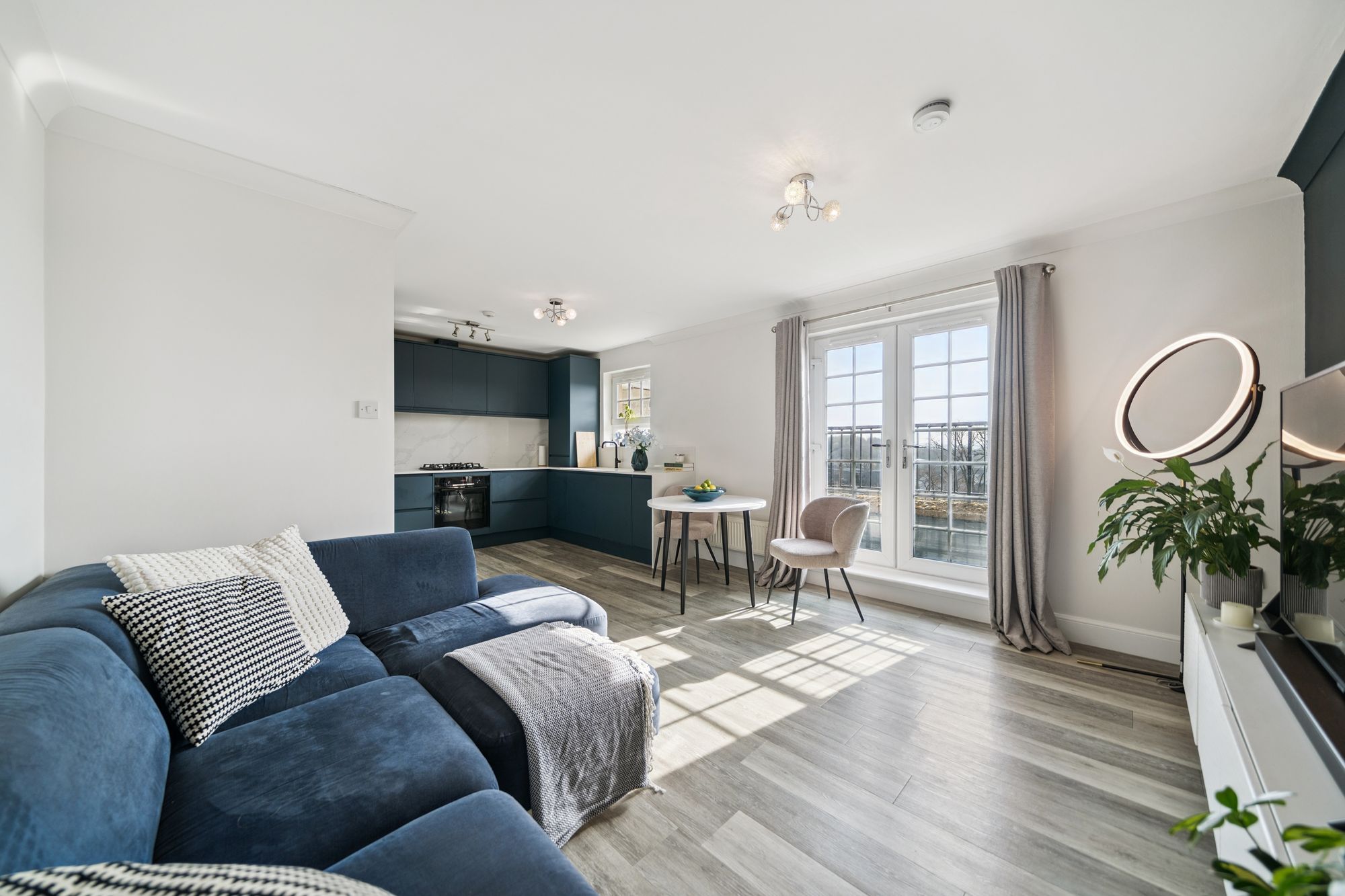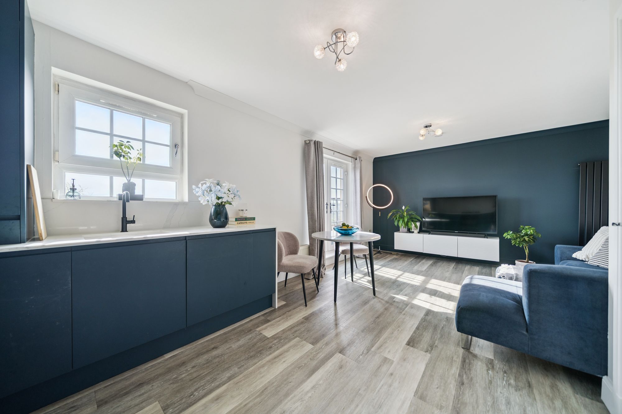 At the heart of the home is an impressive open‑plan living space, featuring an Architect‑designed kitchen with premium Rocca quartz worktops and splashbacks, a striking waterfall edge detail and an undermount sink for a contemporary aesthetic. The lounge door has been repositioned to improve the room’s functionality, creating a more versatile and balanced layout for living and dining, and the space is enhanced by a Juliet balcony which bathes the room in natural light.