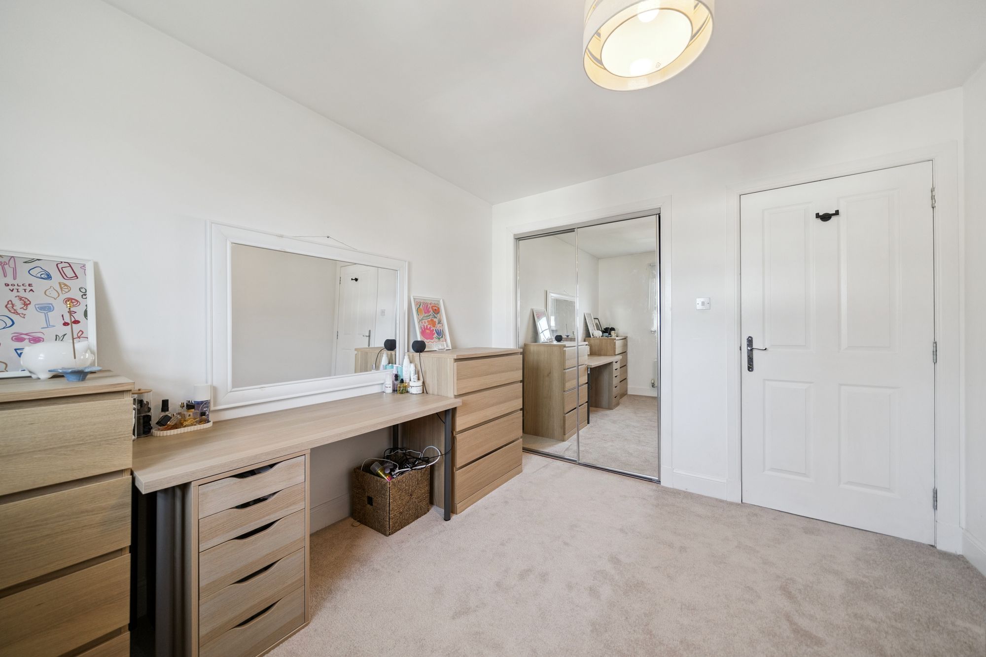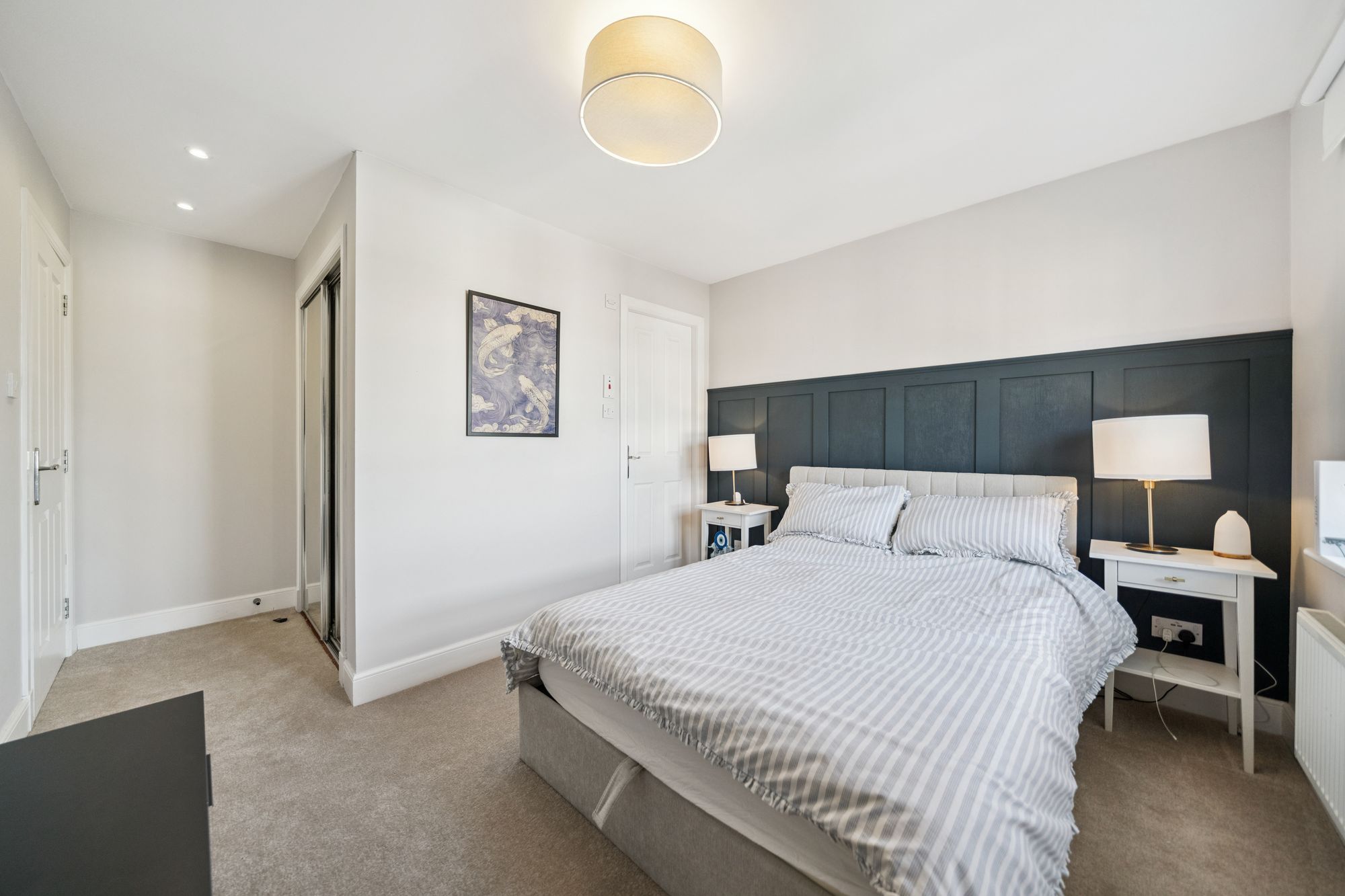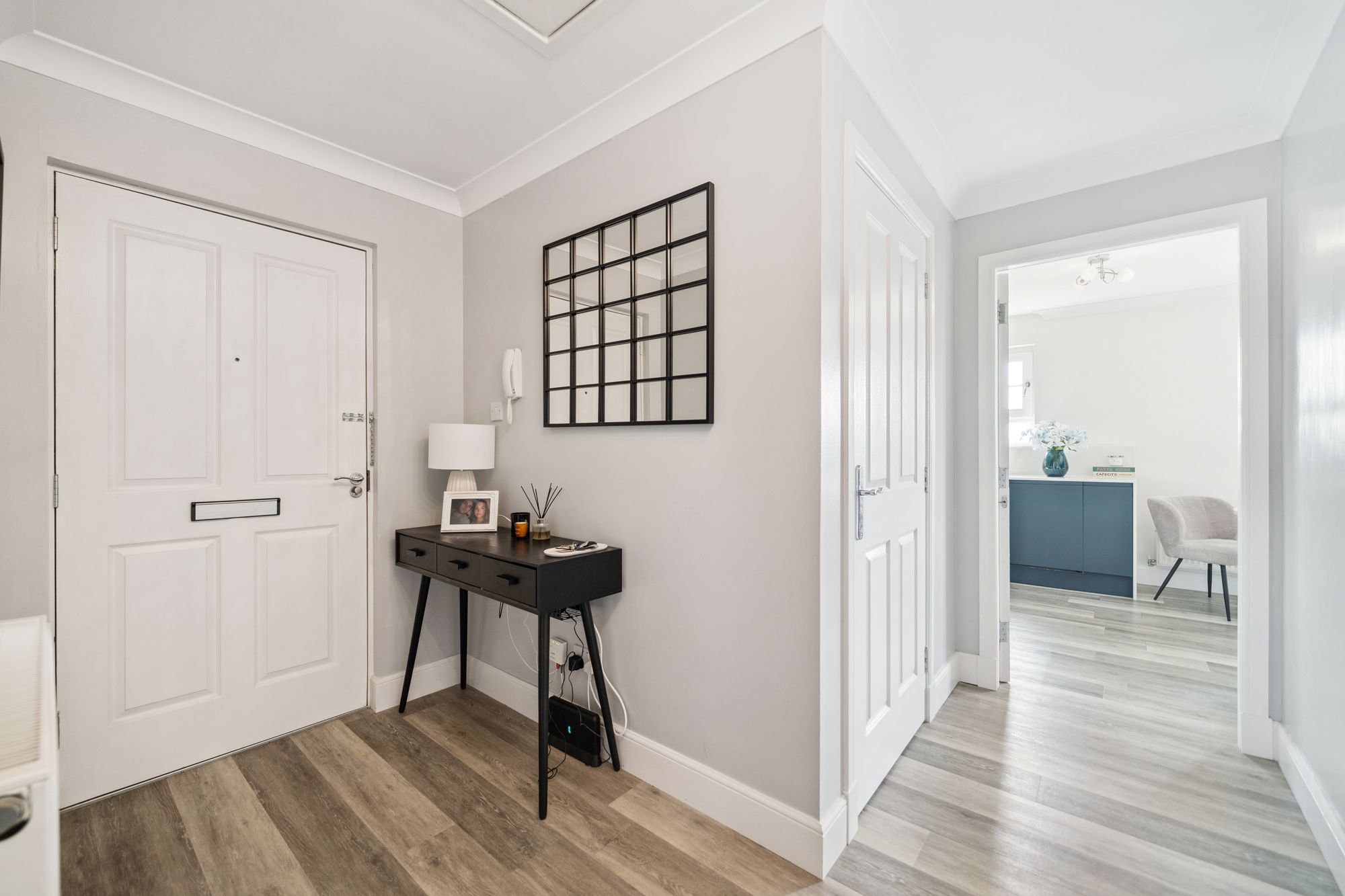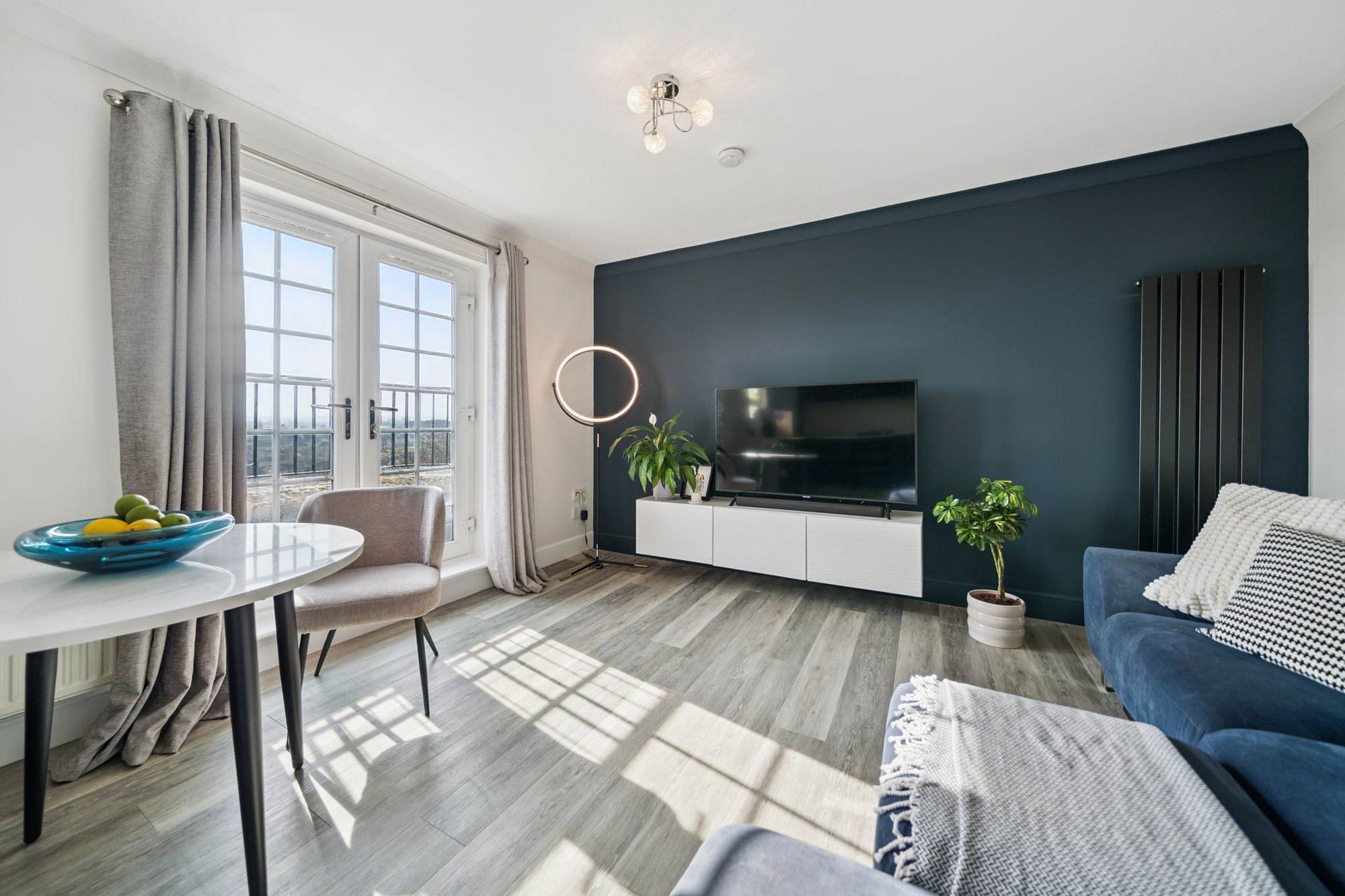 At the heart of the home is an impressive open‑plan living space, featuring an Architect‑designed kitchen with premium Rocca quartz worktops and splashbacks, a striking waterfall edge detail and an undermount sink for a contemporary aesthetic. The lounge door has been repositioned to improve the room’s functionality, creating a more versatile and balanced layout for living and dining, and the space is enhanced by a Juliet balcony which bathes the room in natural light.