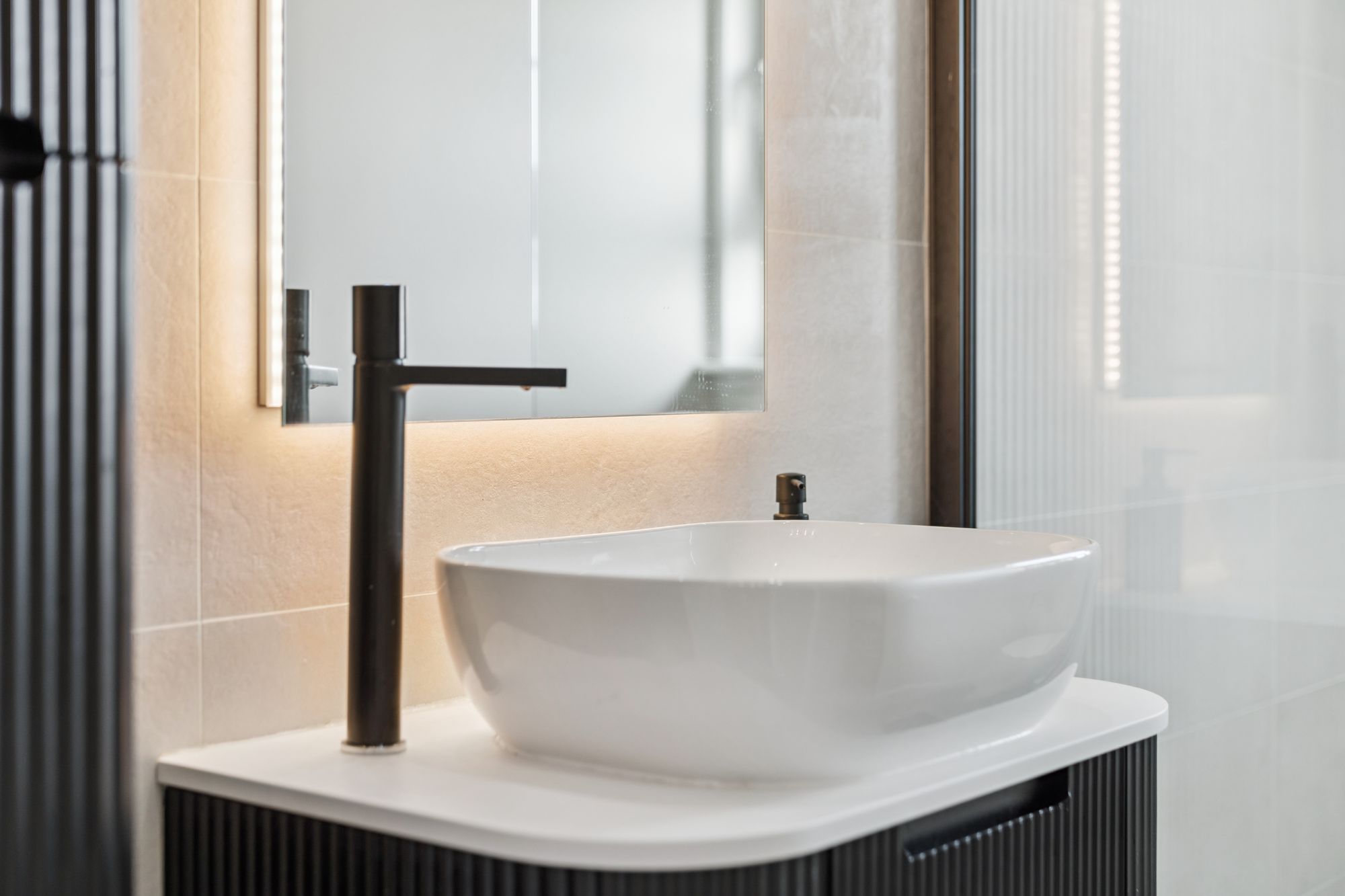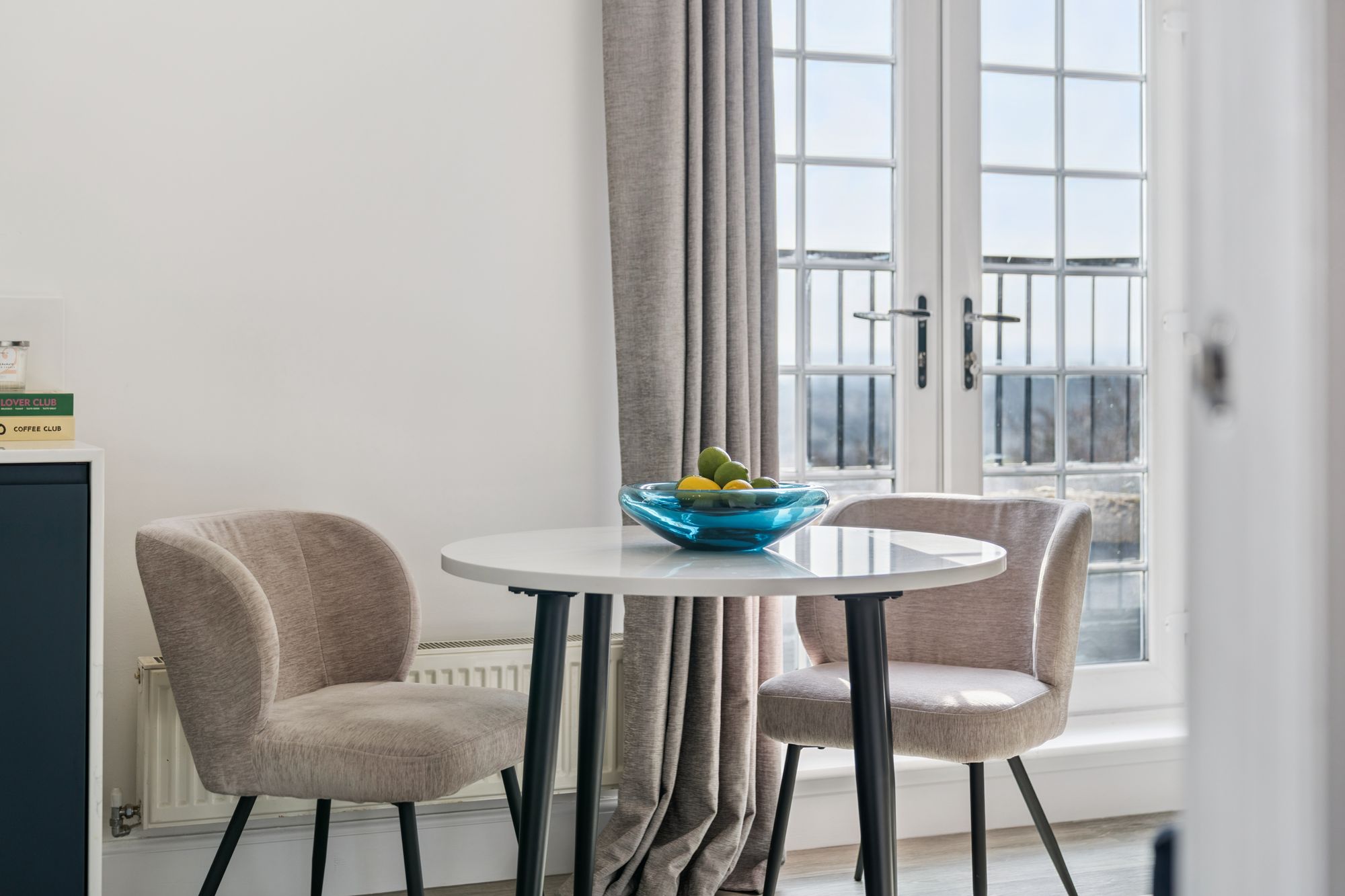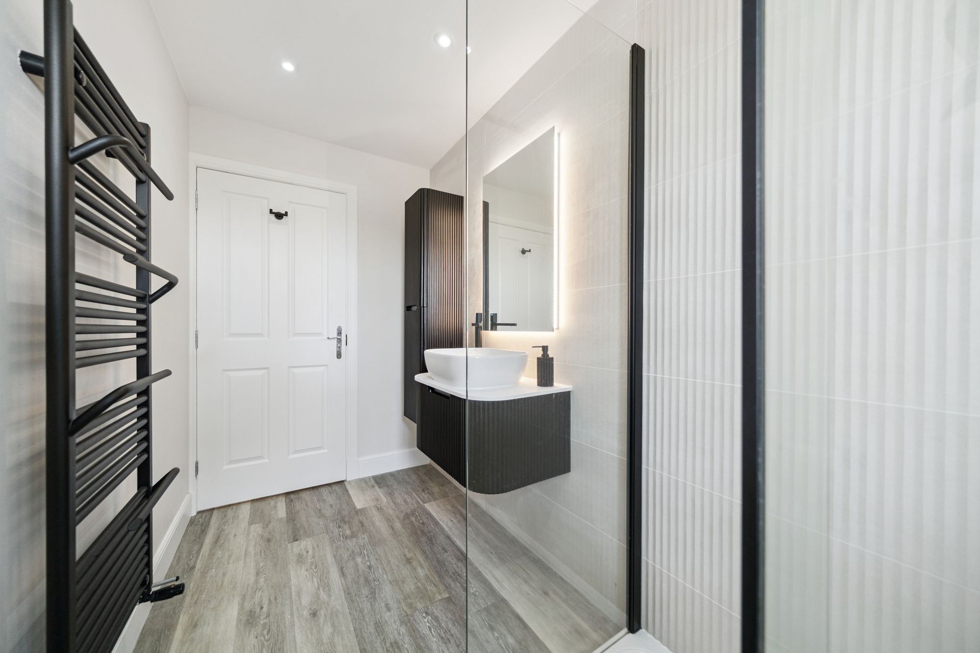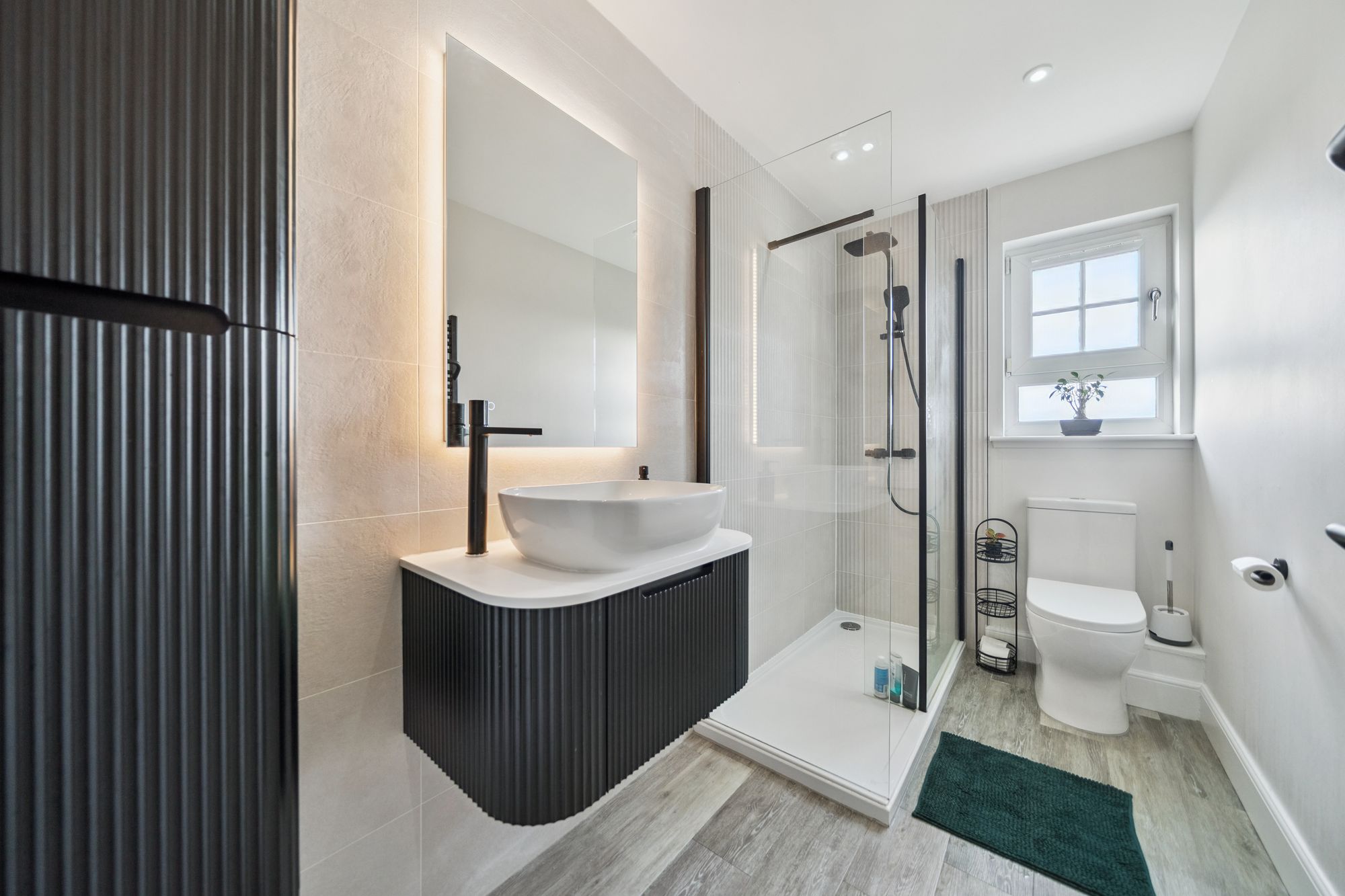At the heart of the home is an impressive open‑plan living space, featuring an Architect‑designed kitchen with premium Rocca quartz worktops and splashbacks, a striking waterfall edge detail and an undermount sink for a contemporary aesthetic. The lounge door has been repositioned to improve the room’s functionality, creating a more versatile and balanced layout for living and dining, and the space is enhanced by a Juliet balcony which bathes the room in natural light.