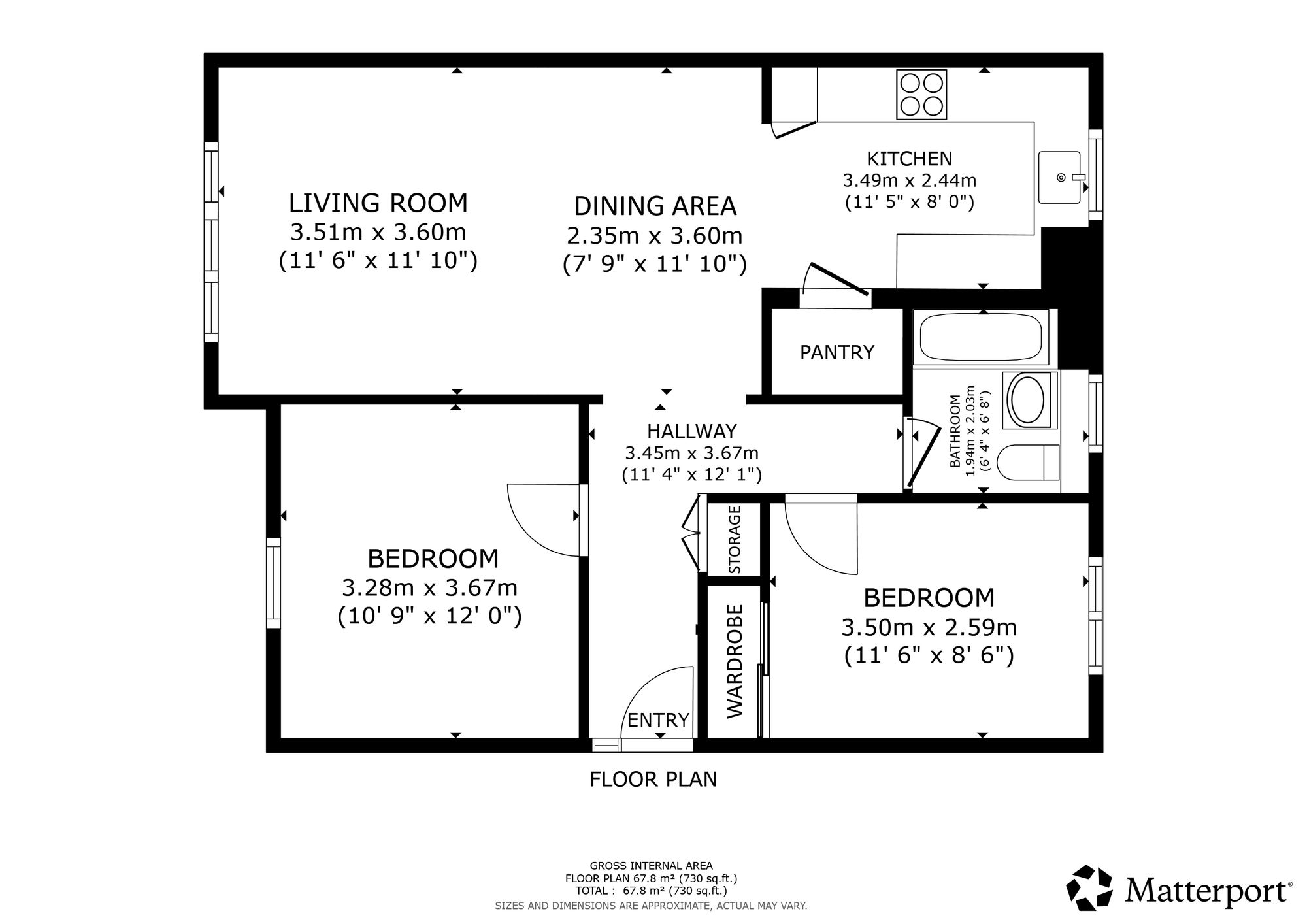 The building itself is accessed via a secure entry system and the communal areas are well maintained by the appointed factors. The attached photographs, floor plan and HD video tour will give an indication to the size and layout of the flat. However, in brief the accommodation extends to; welcoming entrance hallway with storage off, beautiful glass double doors lead through to a spacious open plan living/dining/kitchen. The kitchen itself has base and wall mounted shaker style units with integrated appliances, tiled splash back and pantry off. There are two double bedrooms, one of which has built in wardrobes and the accommodation is completed by a fully tiled bathroom, with three piece suite, shower over the bath and stylish LED strip lighting. To the rear of the building there is a private, single garage which is large enough for one small car, or is perfect for additional storage.