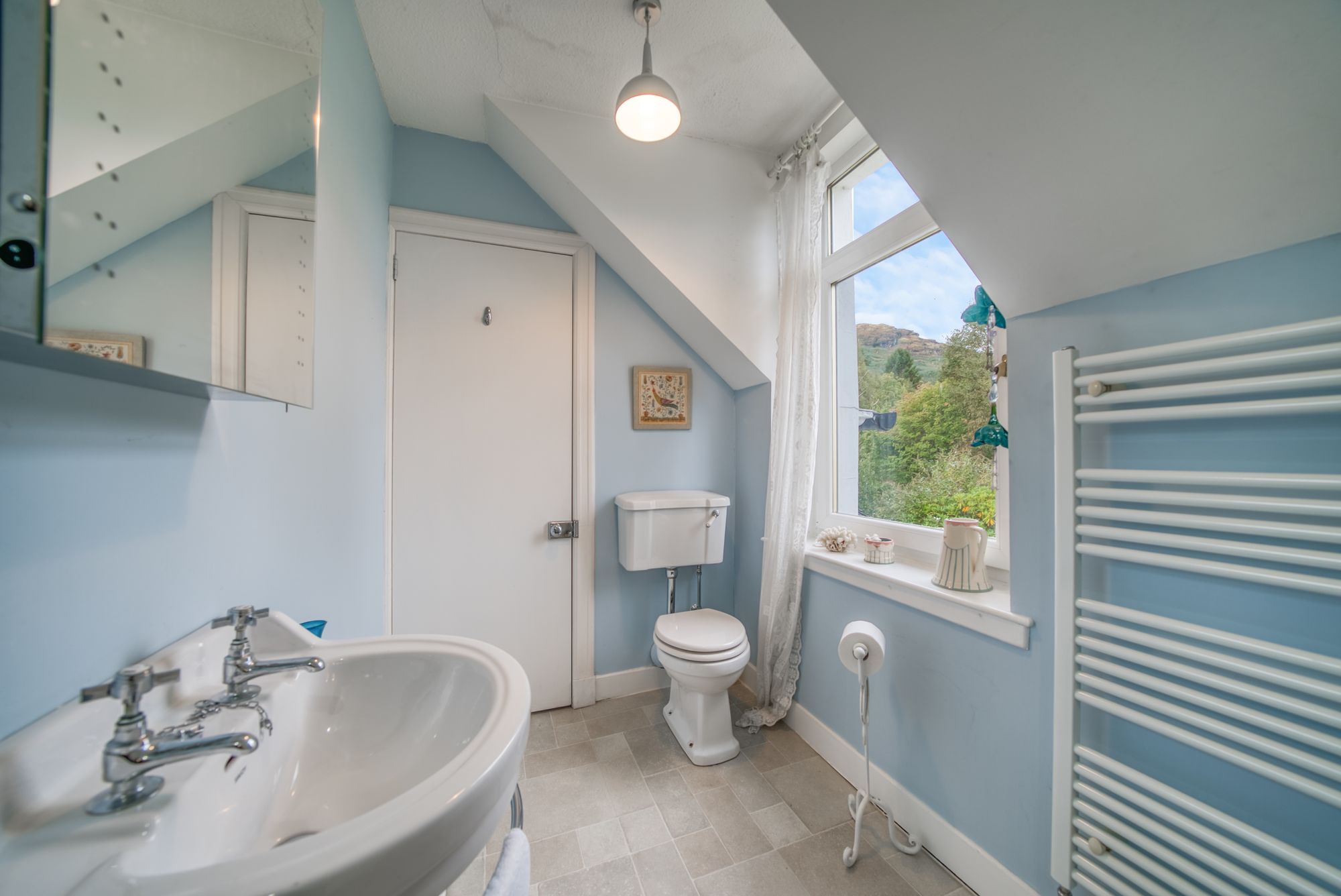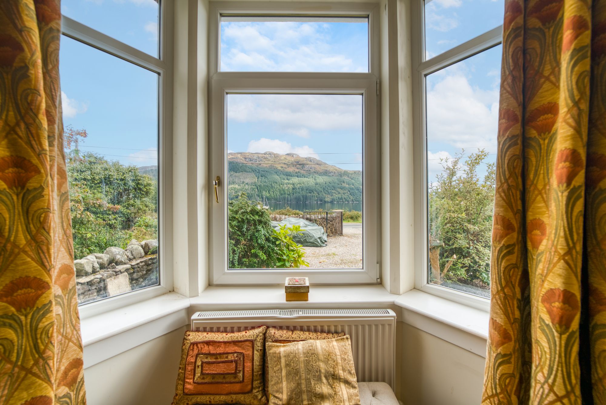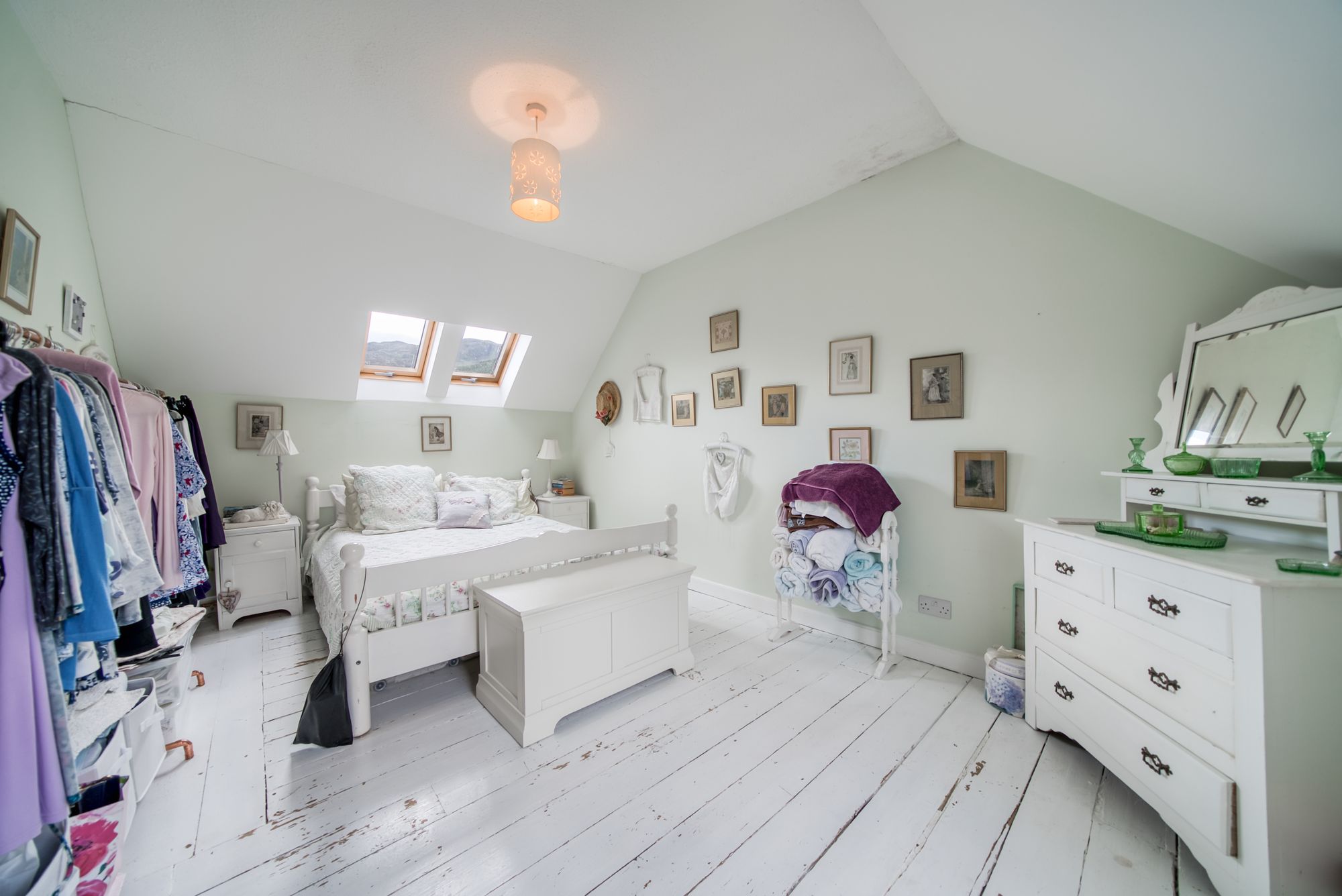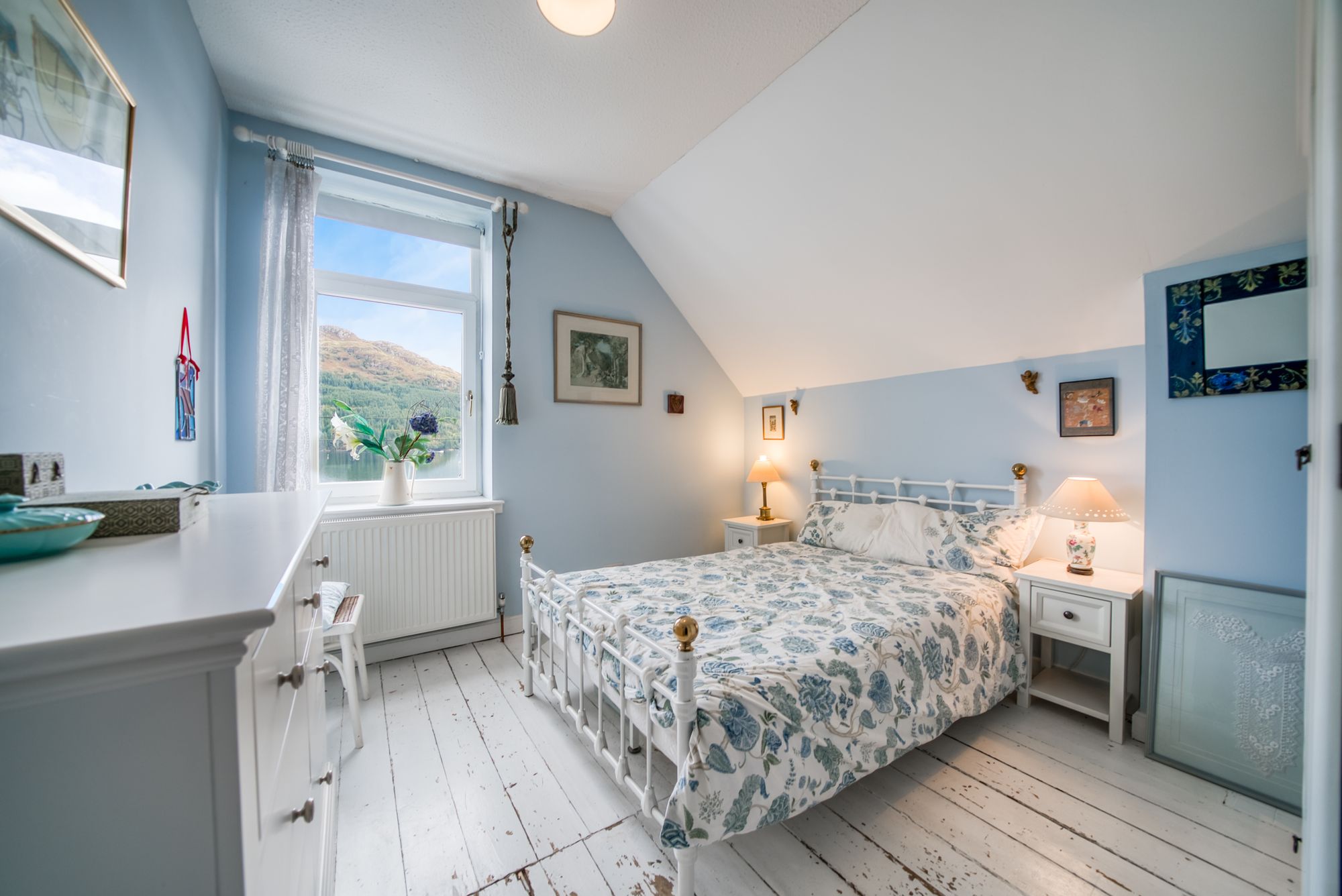 The upper floor continues with a generous landing leading to three thoughtfully arranged bedrooms and a spacious family bathroom. The master bedroom is a large and airy double, featuring original white-painted wooden floorboards and twin Velux windows positioned above the bed to maximise light and sky views. Across the hall, a second double bedroom boasts equally beautiful water views and a bright, neutral décor that enhances the sense of space and calm. The family bathroom is a standout feature, proportioned well and bathed in light thanks to a large picture window overlooking the loch. With a free-standing bath, vanity basin and wc, it offers the perfect spot to relax and unwind while taking in the scenery. A third bedroom, currently used as a single, provides excellent flexibility as a children’s room, nursery, or dedicated office space.