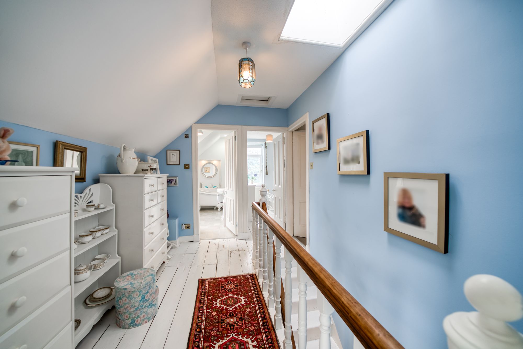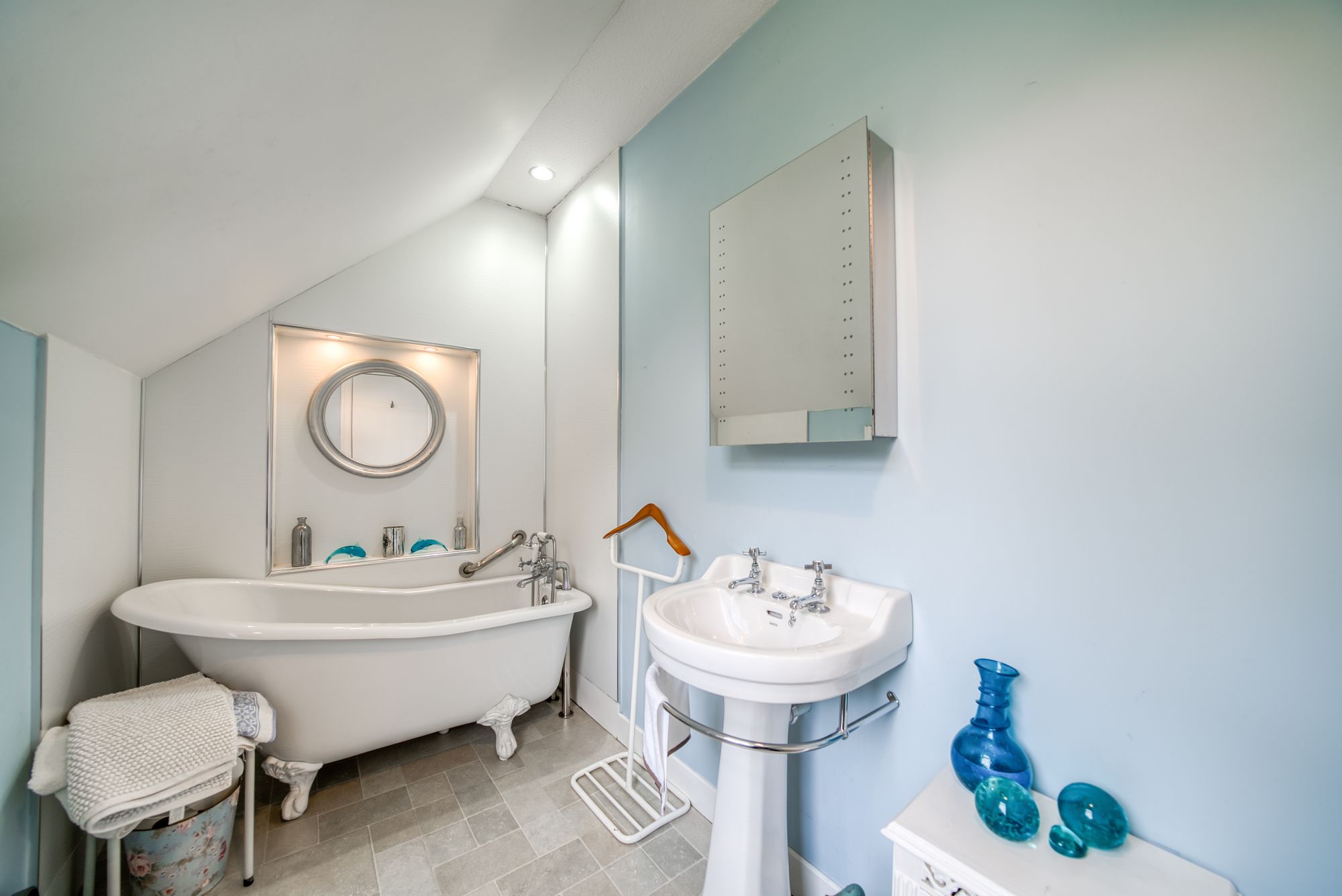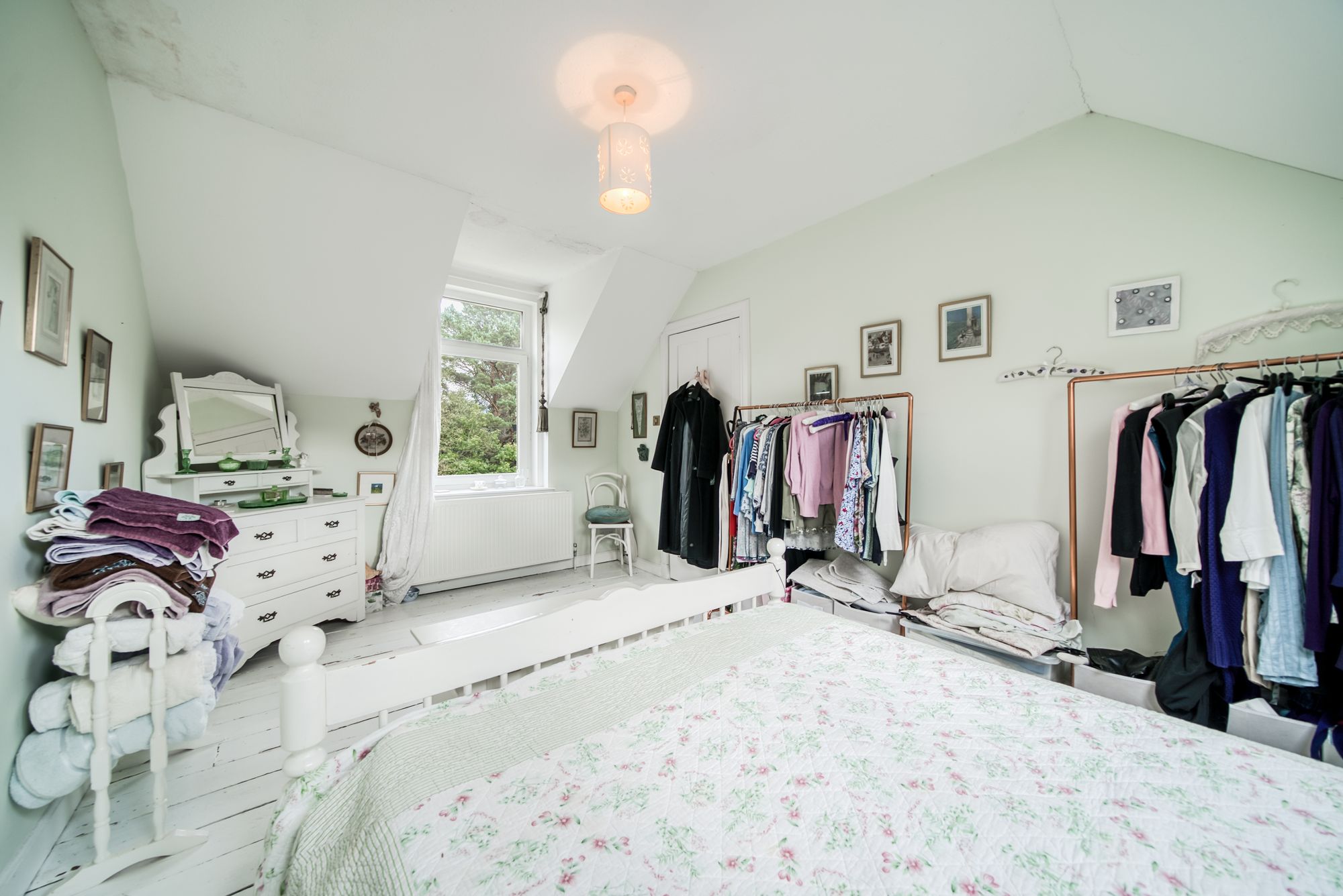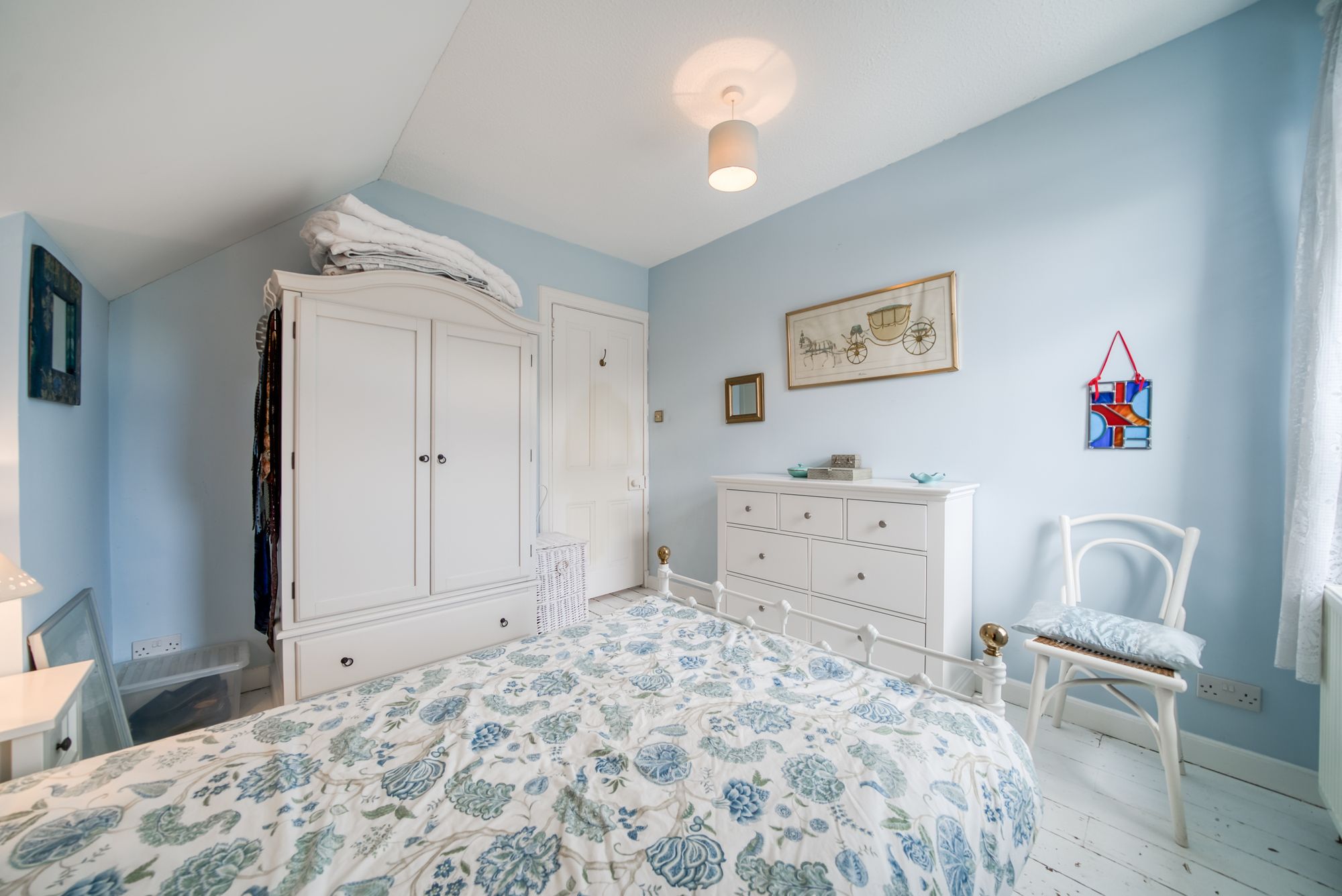 The upper floor continues with a generous landing leading to three thoughtfully arranged bedrooms and a spacious family bathroom. The master bedroom is a large and airy double, featuring original white-painted wooden floorboards and twin Velux windows positioned above the bed to maximise light and sky views. Across the hall, a second double bedroom boasts equally beautiful water views and a bright, neutral décor that enhances the sense of space and calm. The family bathroom is a standout feature, proportioned well and bathed in light thanks to a large picture window overlooking the loch. With a free-standing bath, vanity basin and wc, it offers the perfect spot to relax and unwind while taking in the scenery. A third bedroom, currently used as a single, provides excellent flexibility as a children’s room, nursery, or dedicated office space.
