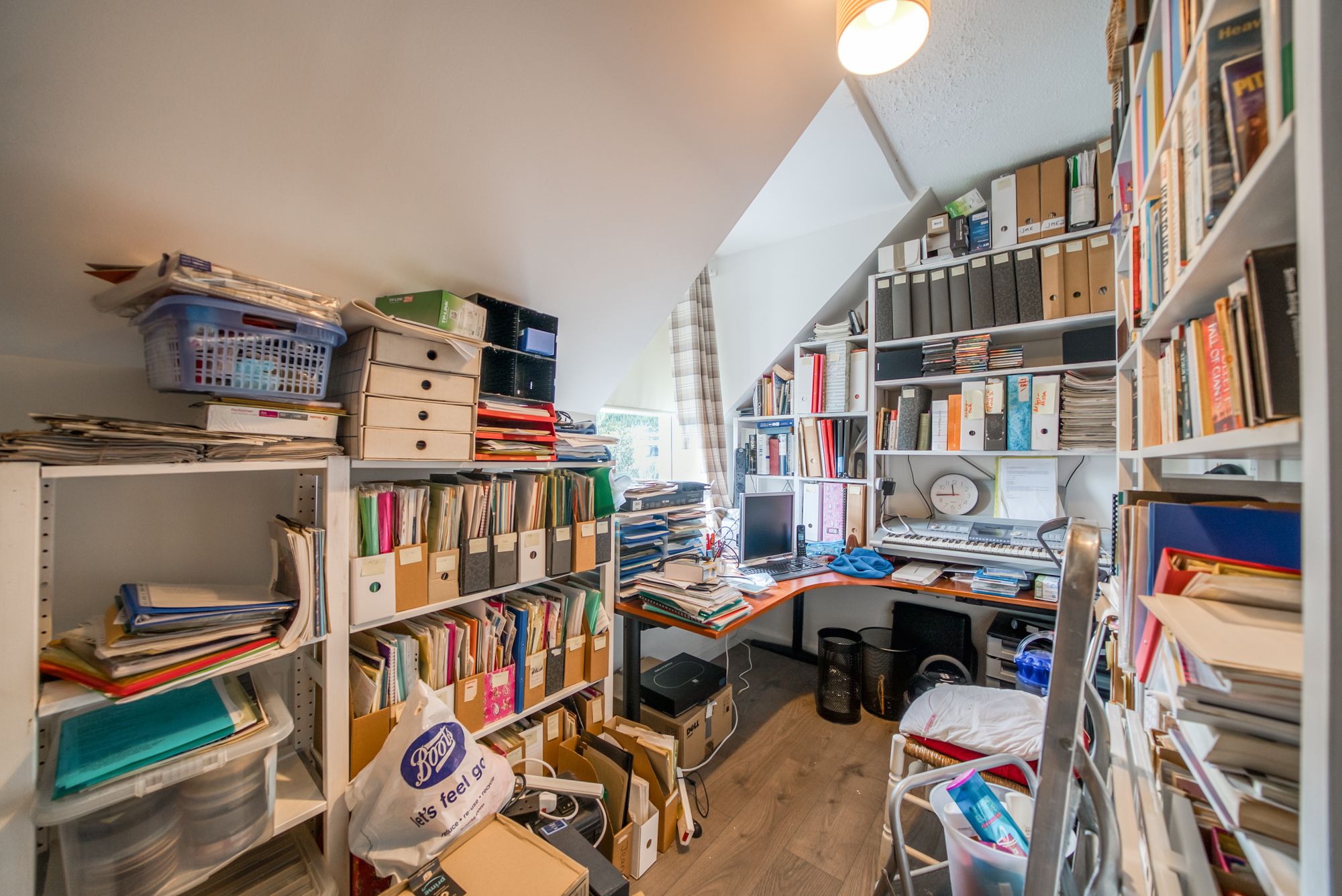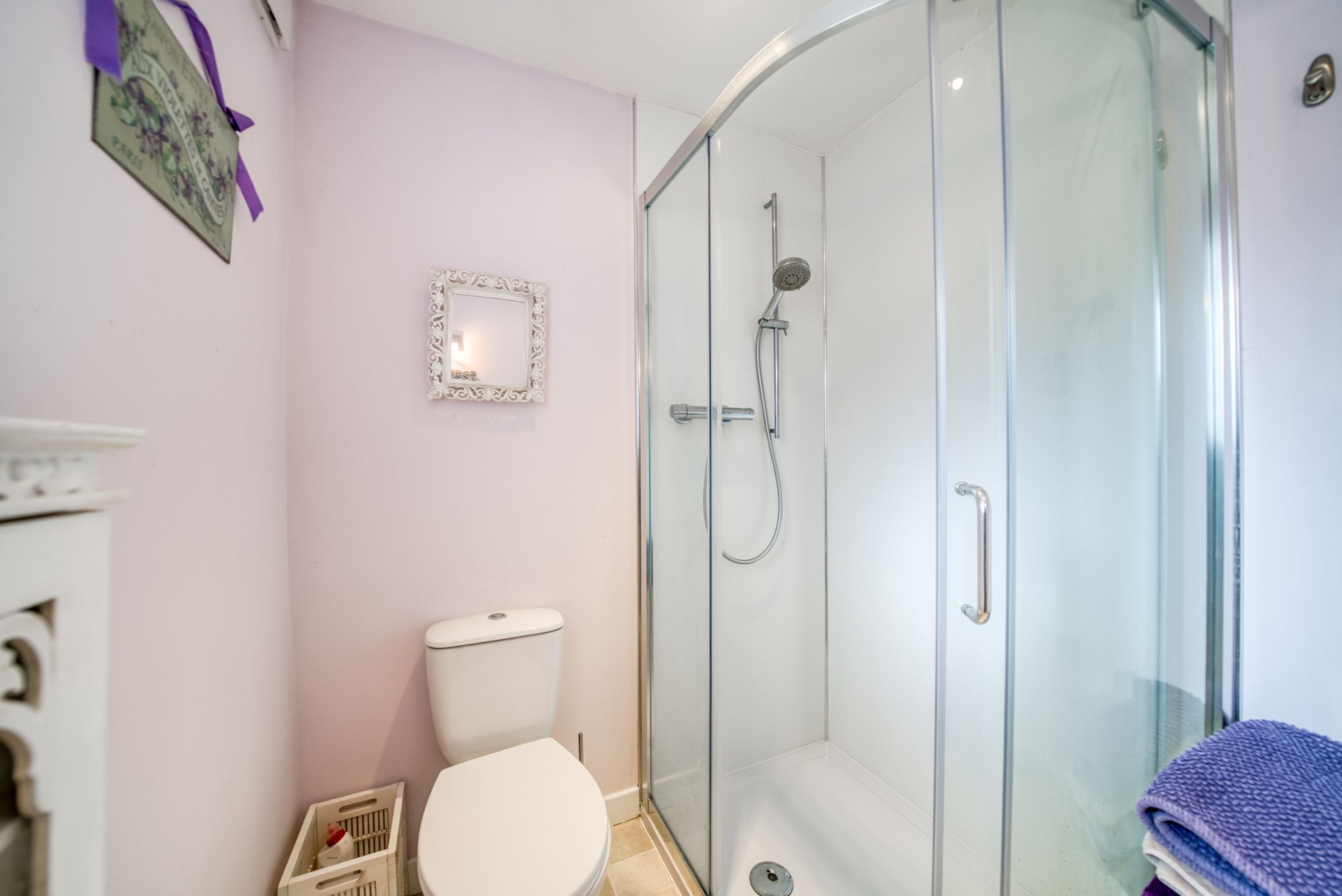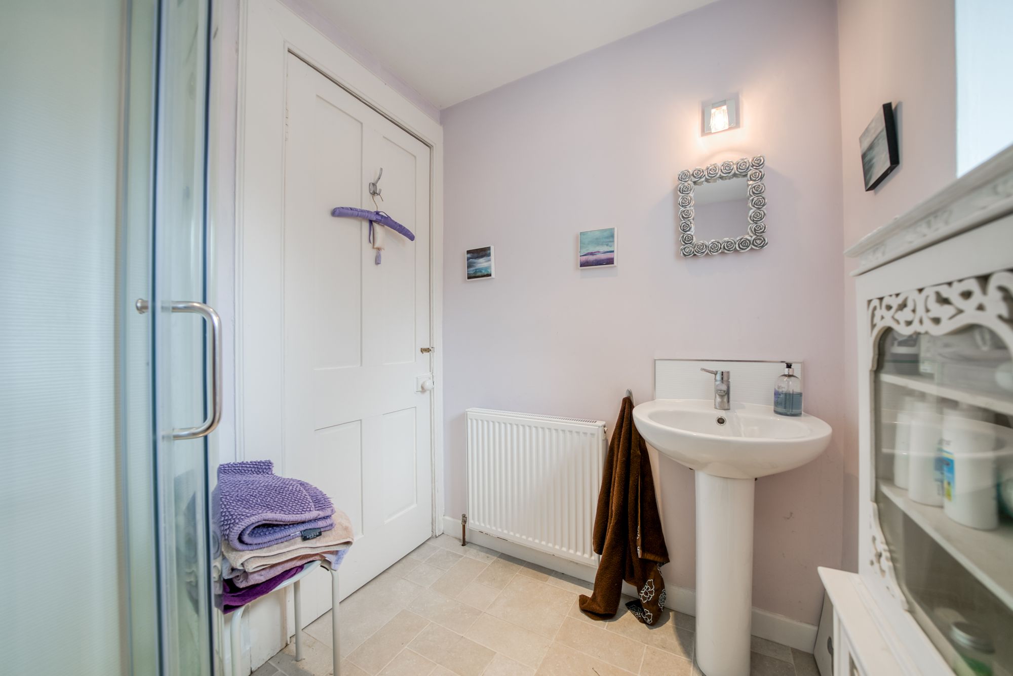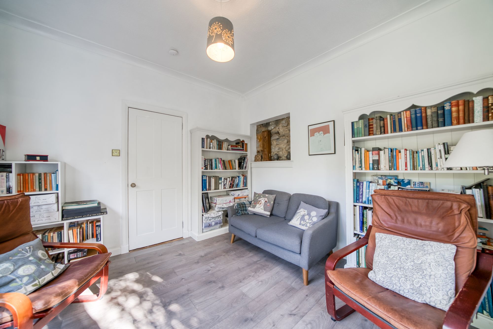 The upper floor continues with a generous landing leading to three thoughtfully arranged bedrooms and a spacious family bathroom. The master bedroom is a large and airy double, featuring original white-painted wooden floorboards and twin Velux windows positioned above the bed to maximise light and sky views. Across the hall, a second double bedroom boasts equally beautiful water views and a bright, neutral décor that enhances the sense of space and calm. The family bathroom is a standout feature, proportioned well and bathed in light thanks to a large picture window overlooking the loch. With a free-standing bath, vanity basin and wc, it offers the perfect spot to relax and unwind while taking in the scenery. A third bedroom, currently used as a single, provides excellent flexibility as a children’s room, nursery, or dedicated office space.