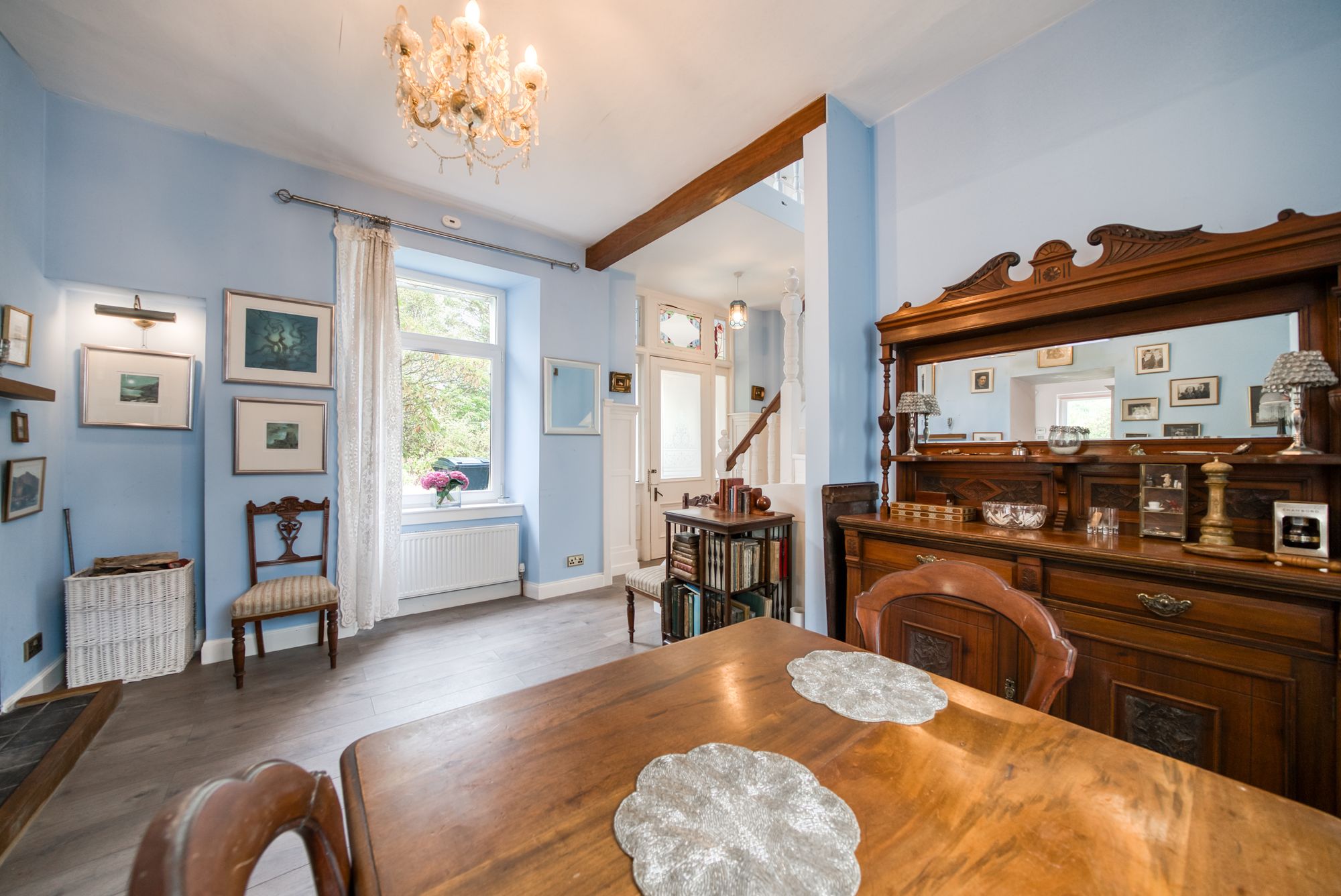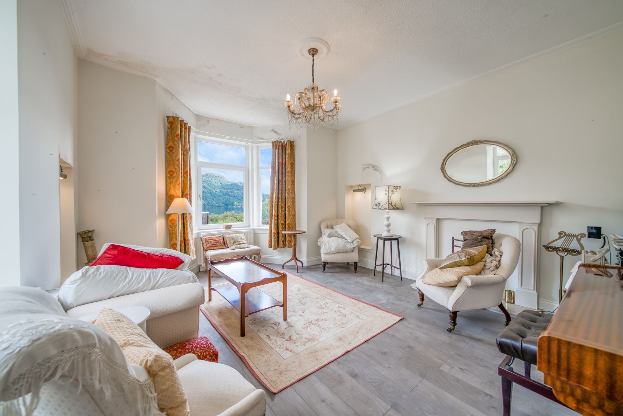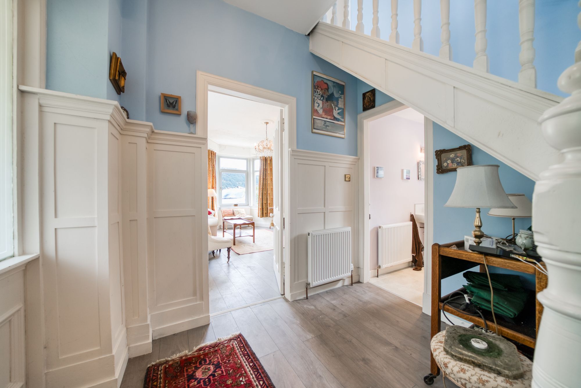 The ground floor opens with a welcoming entrance vestibule, leading into a bright and versatile dining hall. At its heart is a charming log-burning stove, creating a cosy focal point for family meals or gatherings with friends. This generous space easily accommodates a large dining table and, like the rest of the home, offers huge potential for modernisation, giving new owners the chance to truly make it their own. Continuing the ground floor, a spacious and beautifully bright drawing room features a large bay window with stunning views across the water over Loch Goil. This relaxing space is filled with natural light and would make an exceptional family sitting room or stylish retreat. To the rear of the house lies a well-sized family kitchen, fitted with a range of wall-mounted and counter-level units. From here, French doors provide direct access to the gardens ideal for alfresco dining or children to play in safety. Off the kitchen, a bright and inviting snug or home office enjoys patio doors that flood the space with natural light, creating a perfect work-from-home environment or cosy reading nook. Completing the ground floor is a well appointed shower room with a walk-in shower enclosure, wc, and wash hand basin.