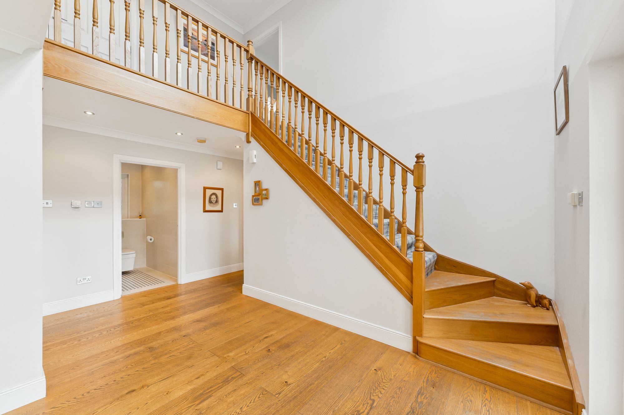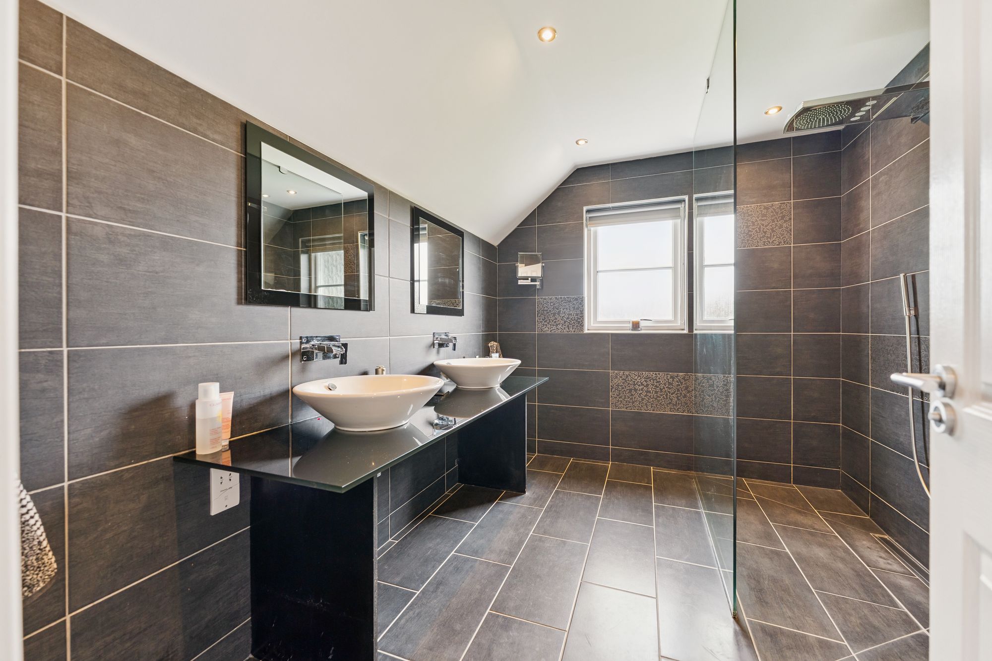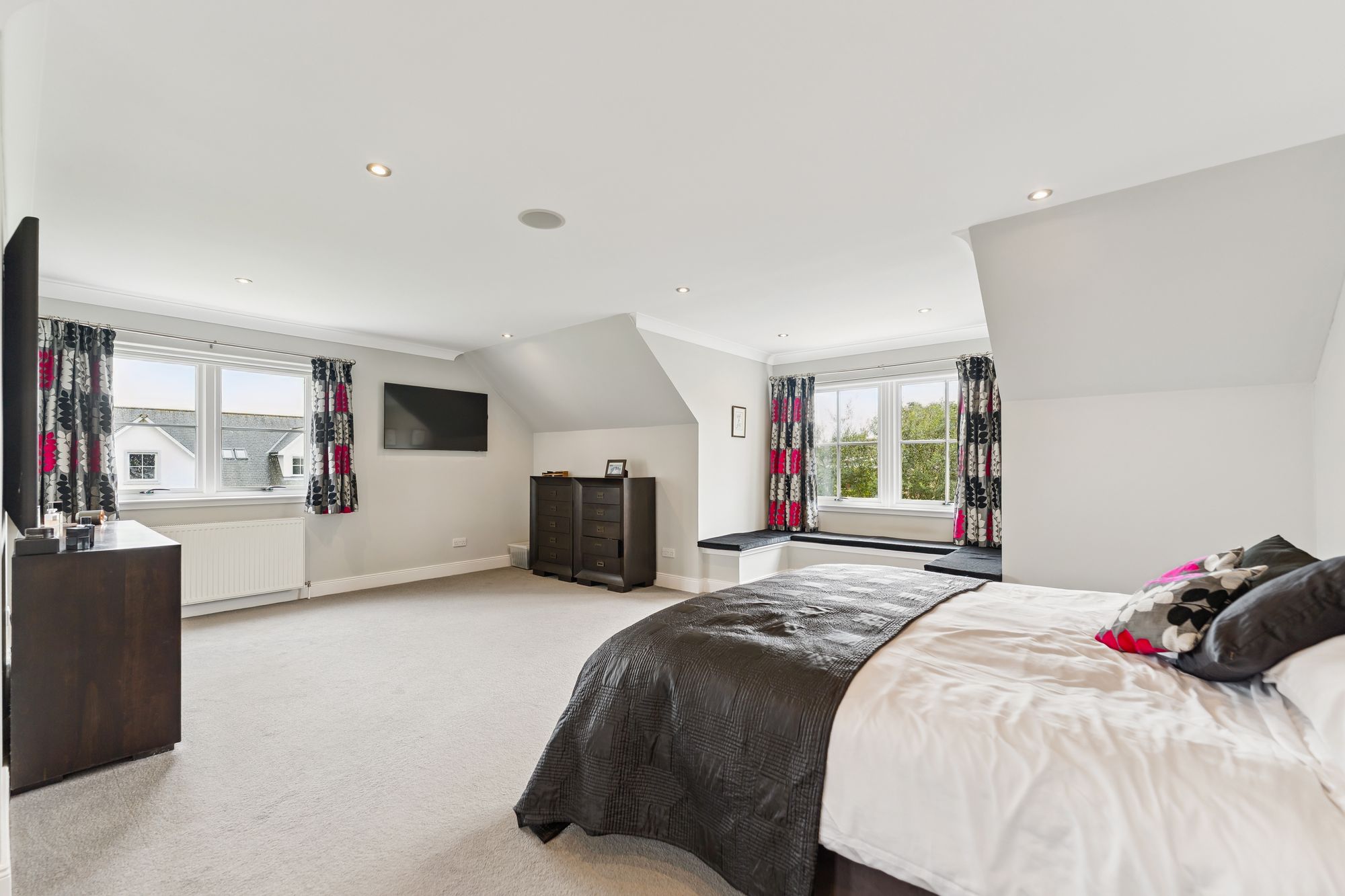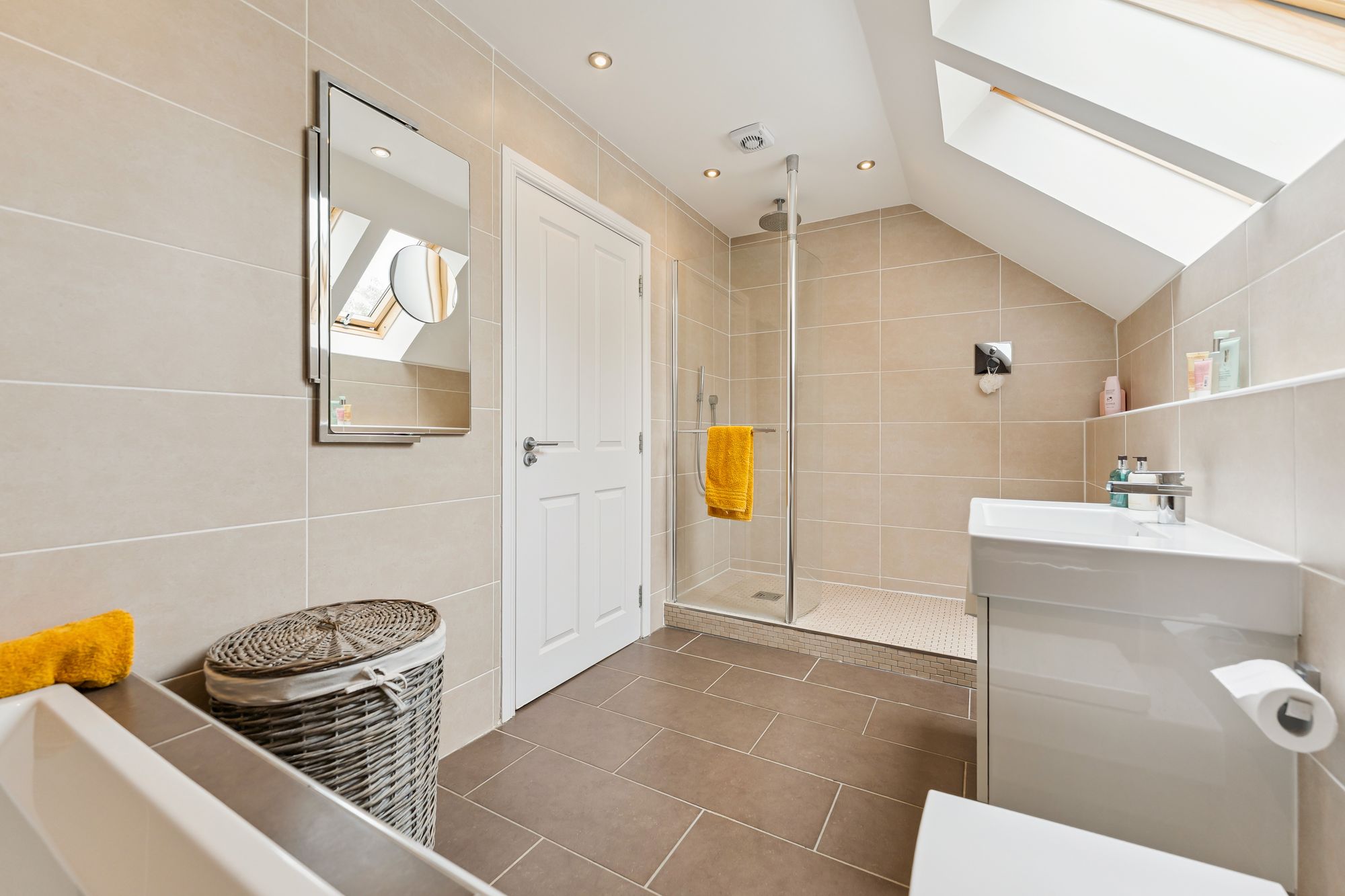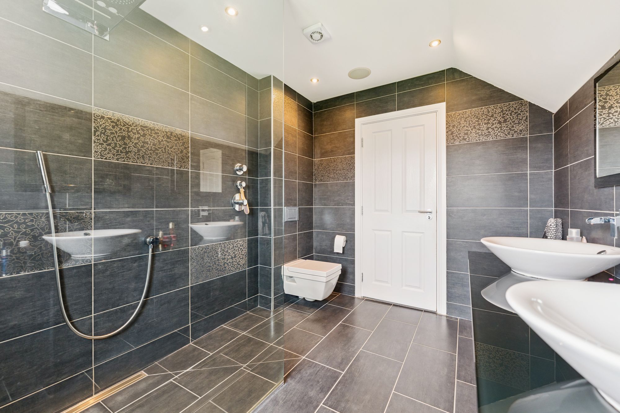 Upstairs, the property continues to impress with four generously sized double bedrooms, three of which feature built-in wardrobes. Bedroom two enjoys the added luxury of a private en suite shower room, while the principal suite is an expansive space, complete with a walk-in wardrobe and a large en suite bathroom featuring double sinks and a sleek, modern finish. A stylish main family bathroom with both a jacuzzi bath and separate shower serves the remaining bedrooms, completing the upper level.