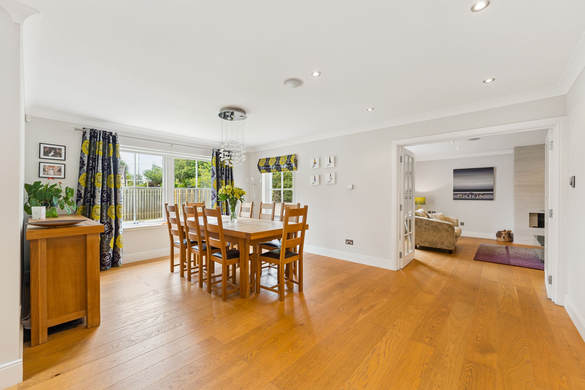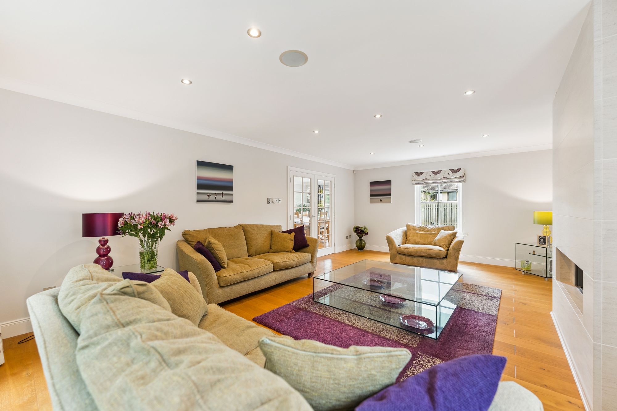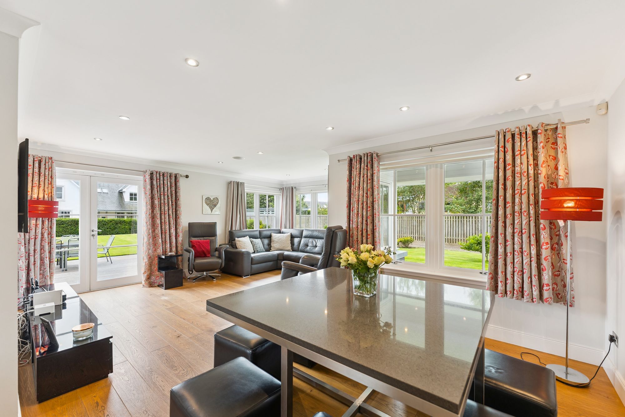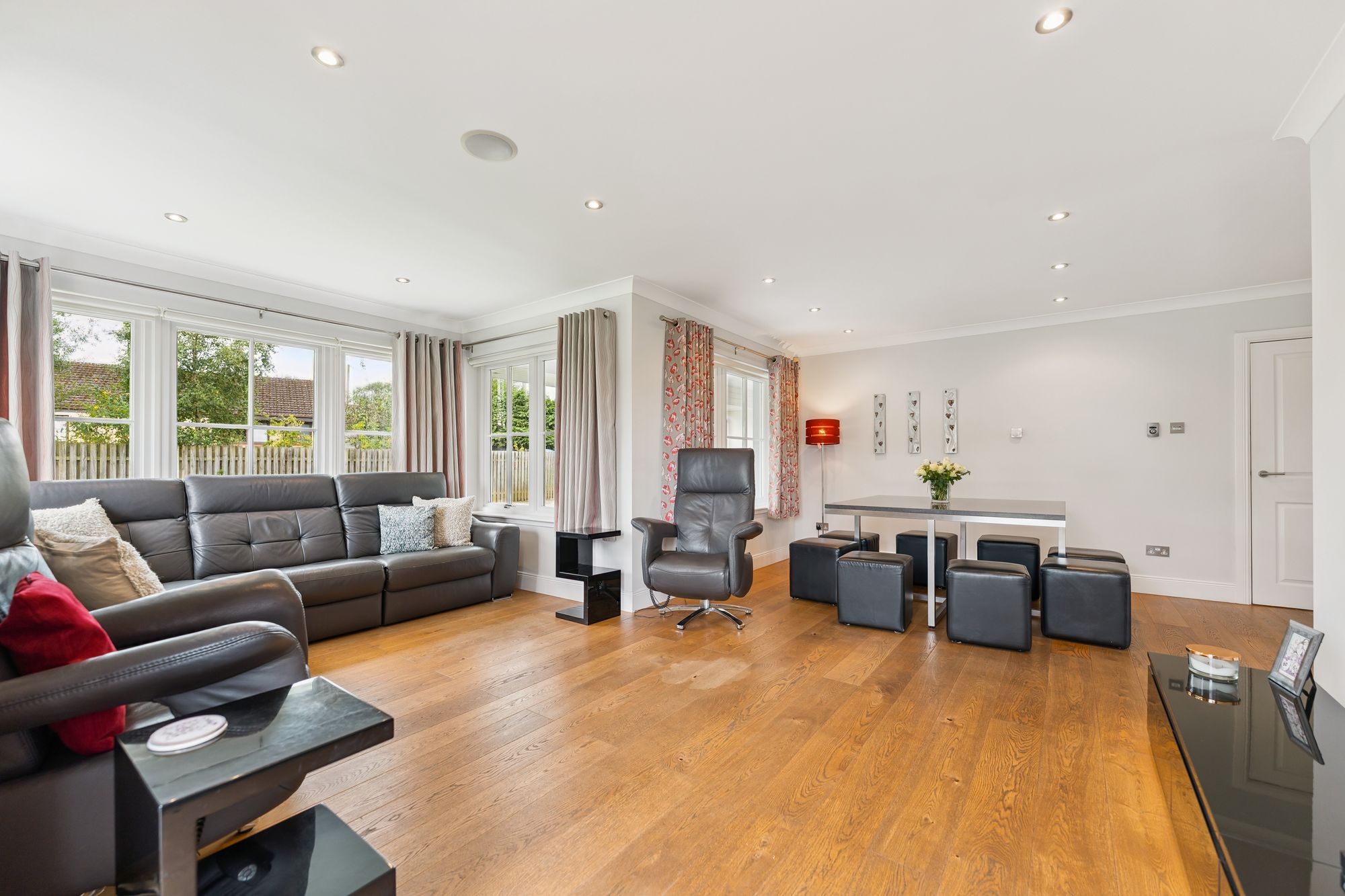 A striking, modern detached home situated in the sought-after village of Torrance, offering a superb blend of space, style, and versatility across two generous levels. Upon entry, you're welcomed by a large, bright hallway that sets the tone for the rest of the property, with a dedicated dining area just off the main space, perfect for entertaining or family gatherings. The formal living room is flooded with natural light thanks to its double-aspect windows and is centred around a contemporary gas fireplace, creating a warm and inviting focal point.