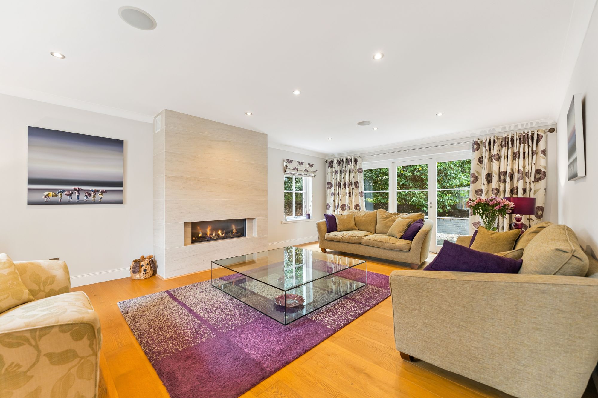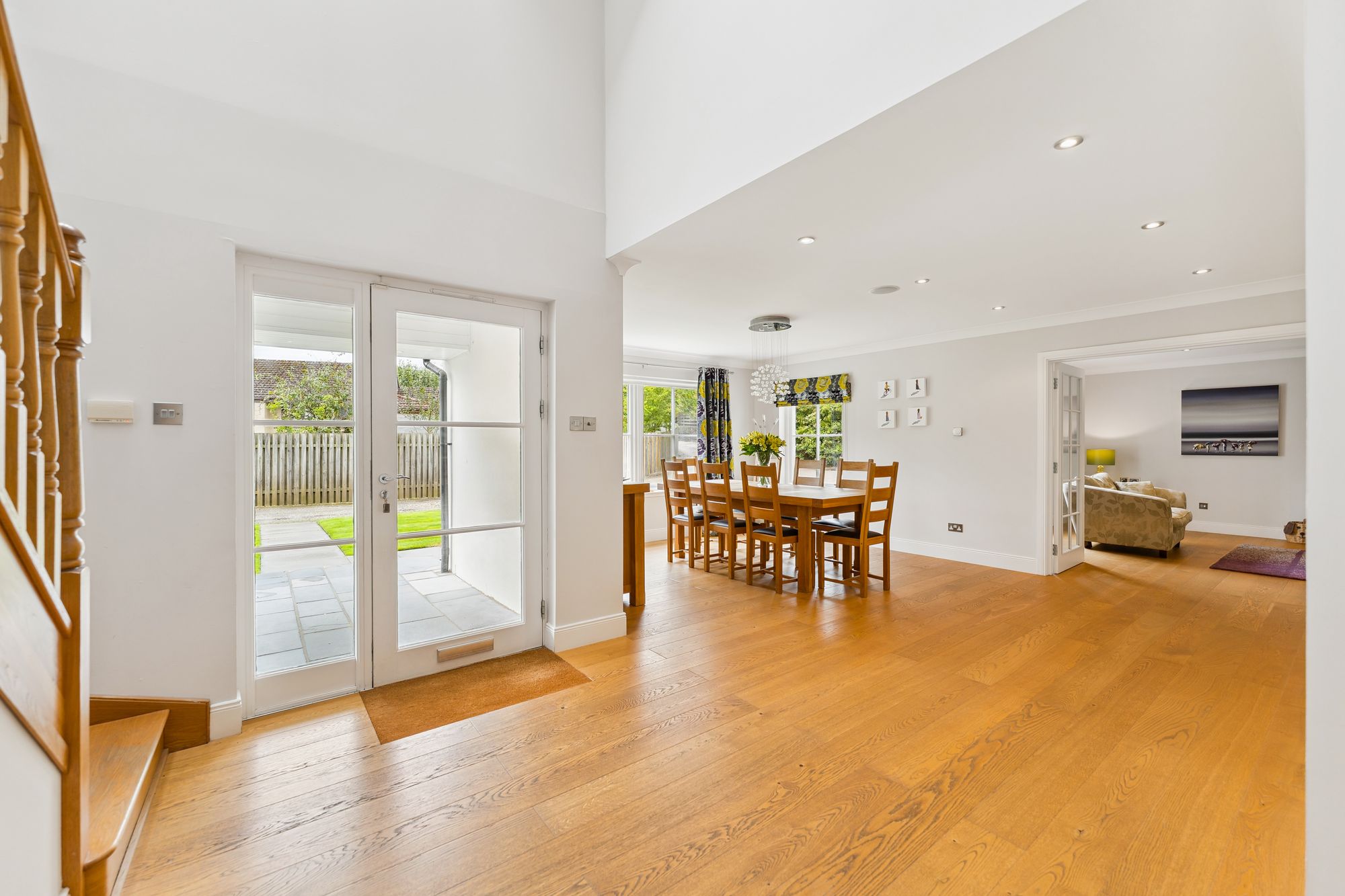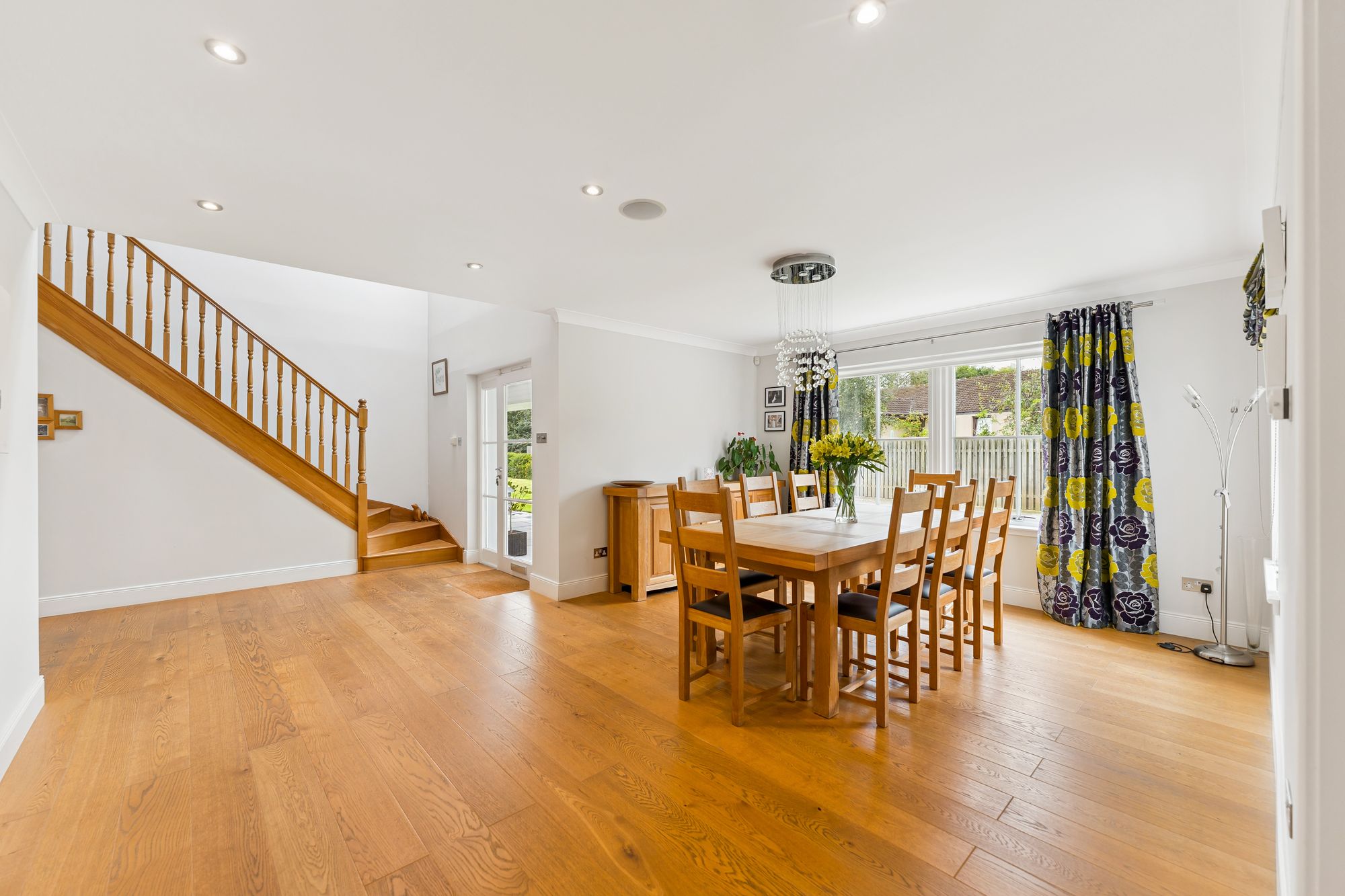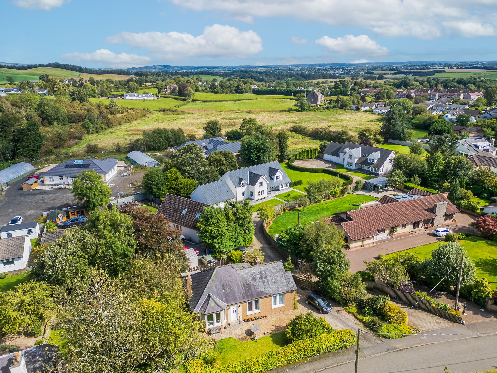 A striking, modern detached home situated in the sought-after village of Torrance, offering a superb blend of space, style, and versatility across two generous levels. Upon entry, you're welcomed by a large, bright hallway that sets the tone for the rest of the property, with a dedicated dining area just off the main space, perfect for entertaining or family gatherings. The formal living room is flooded with natural light thanks to its double-aspect windows and is centred around a contemporary gas fireplace, creating a warm and inviting focal point.