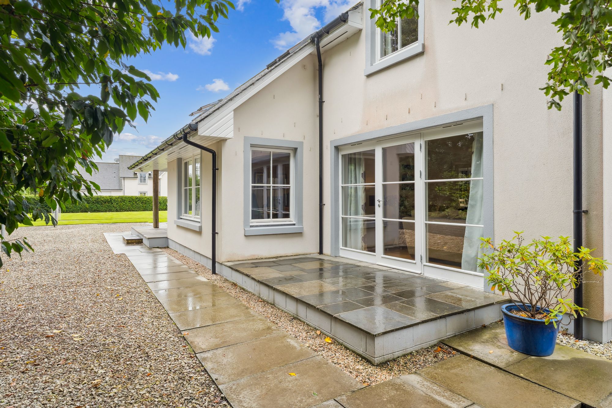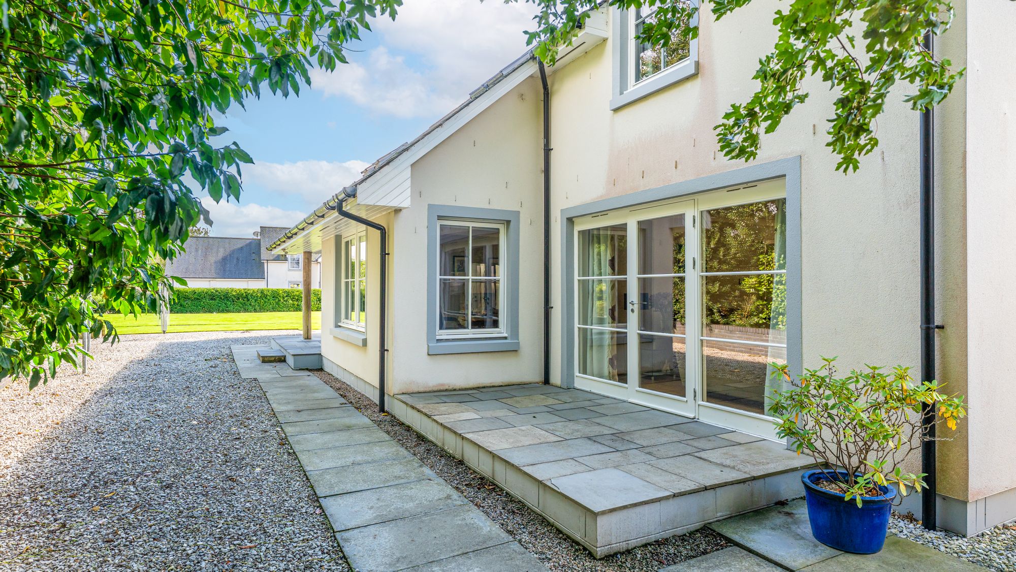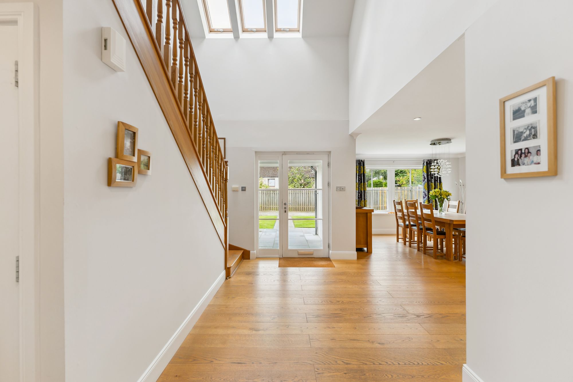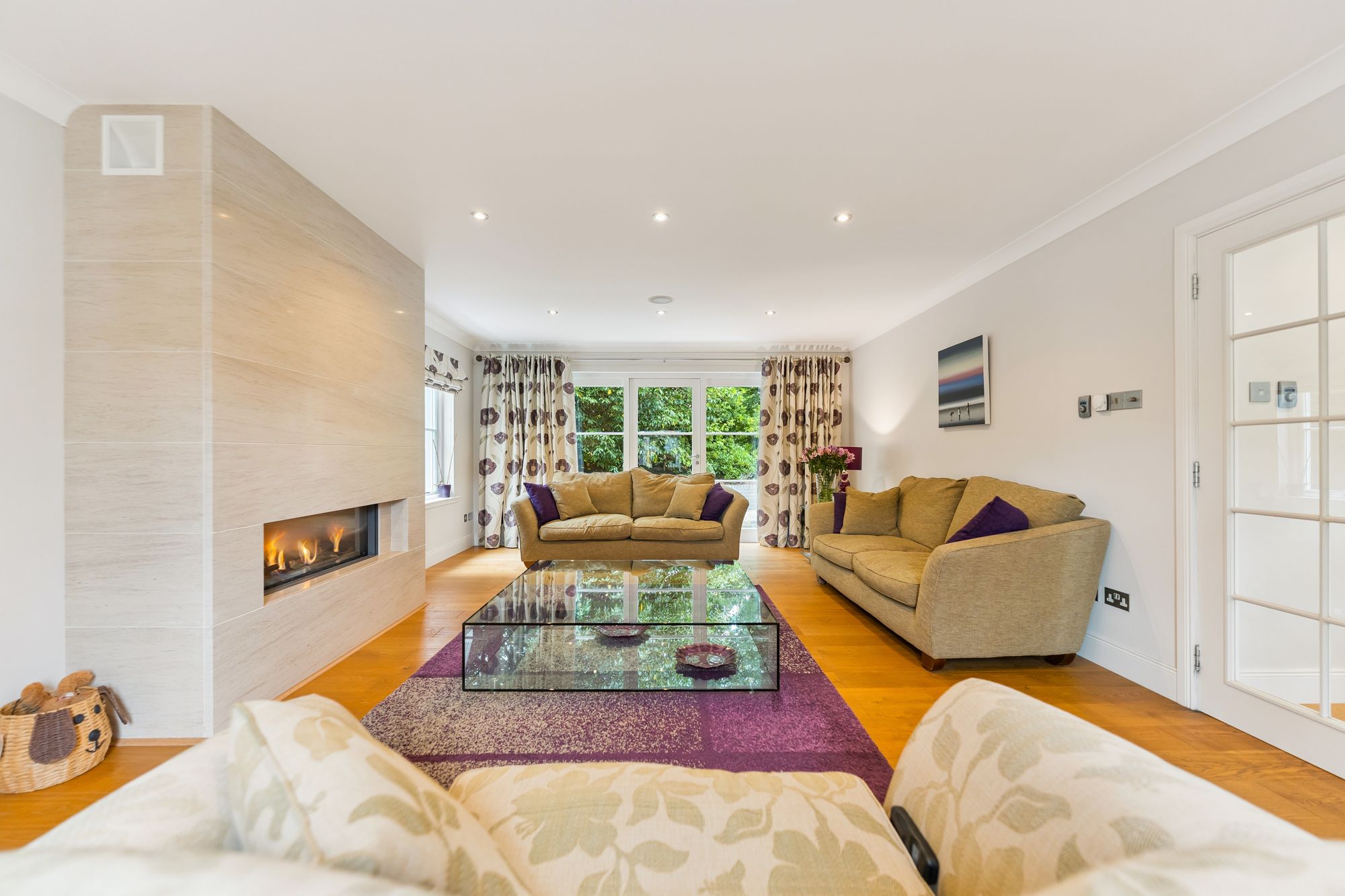 A striking, modern detached home situated in the sought-after village of Torrance, offering a superb blend of space, style, and versatility across two generous levels. Upon entry, you're welcomed by a large, bright hallway that sets the tone for the rest of the property, with a dedicated dining area just off the main space, perfect for entertaining or family gatherings. The formal living room is flooded with natural light thanks to its double-aspect windows and is centred around a contemporary gas fireplace, creating a warm and inviting focal point.
