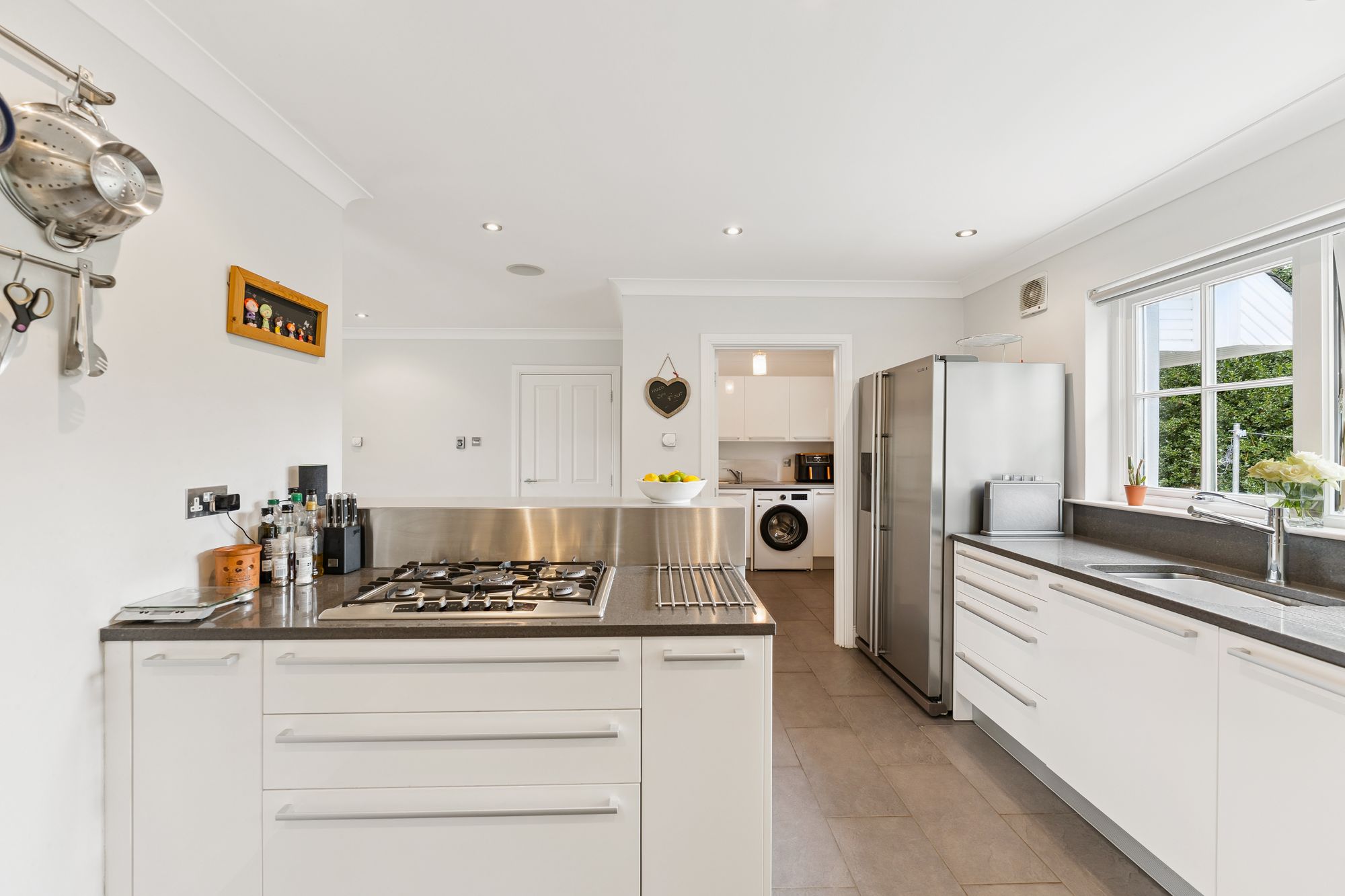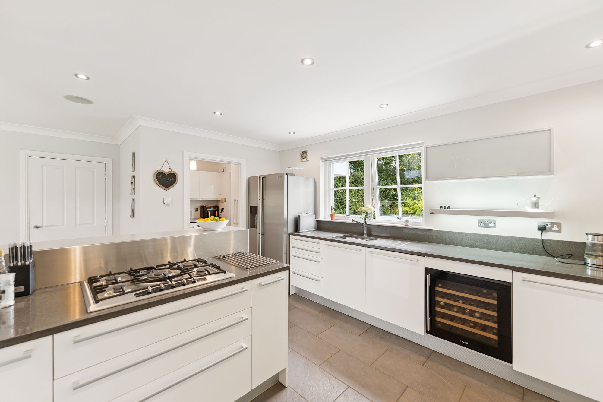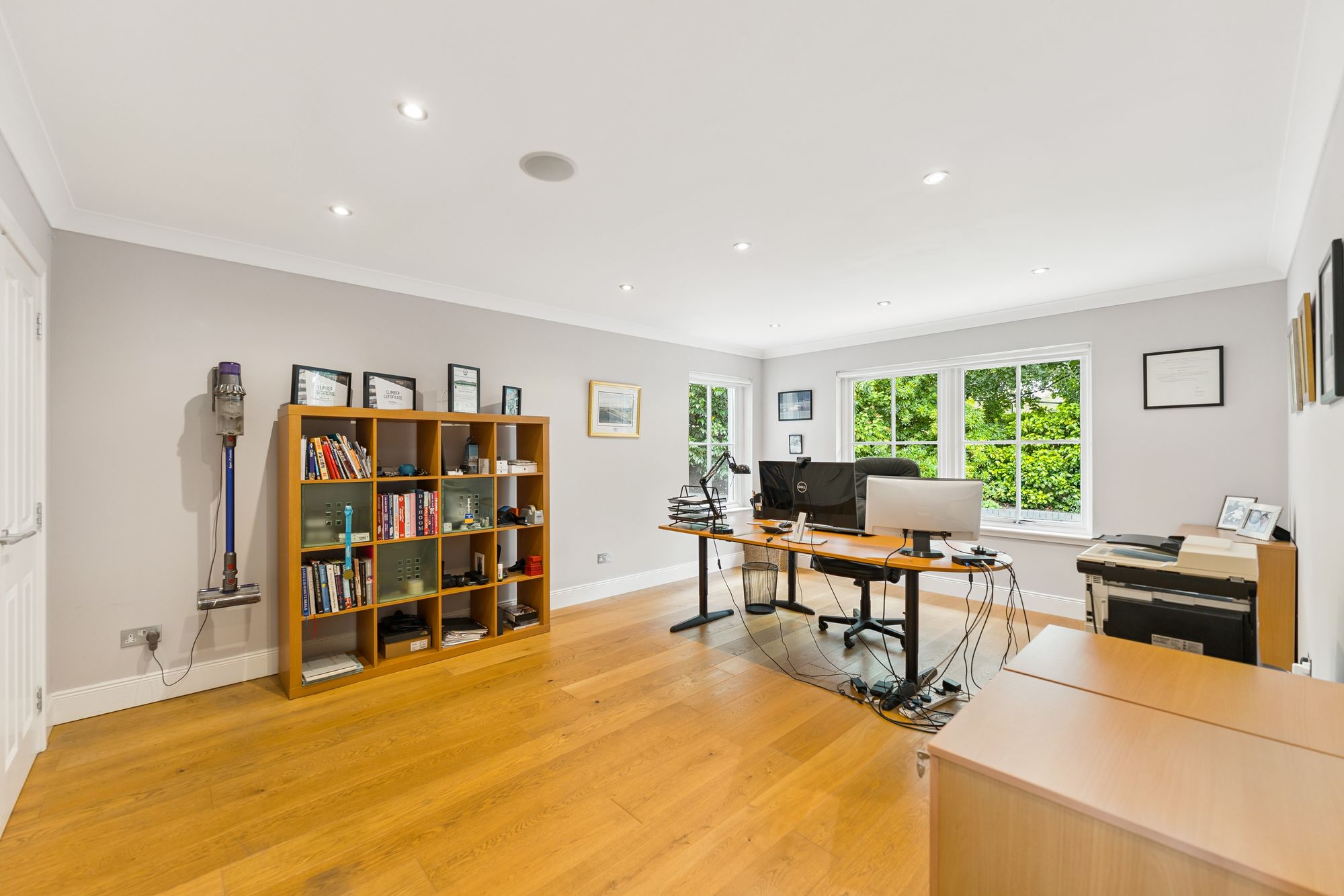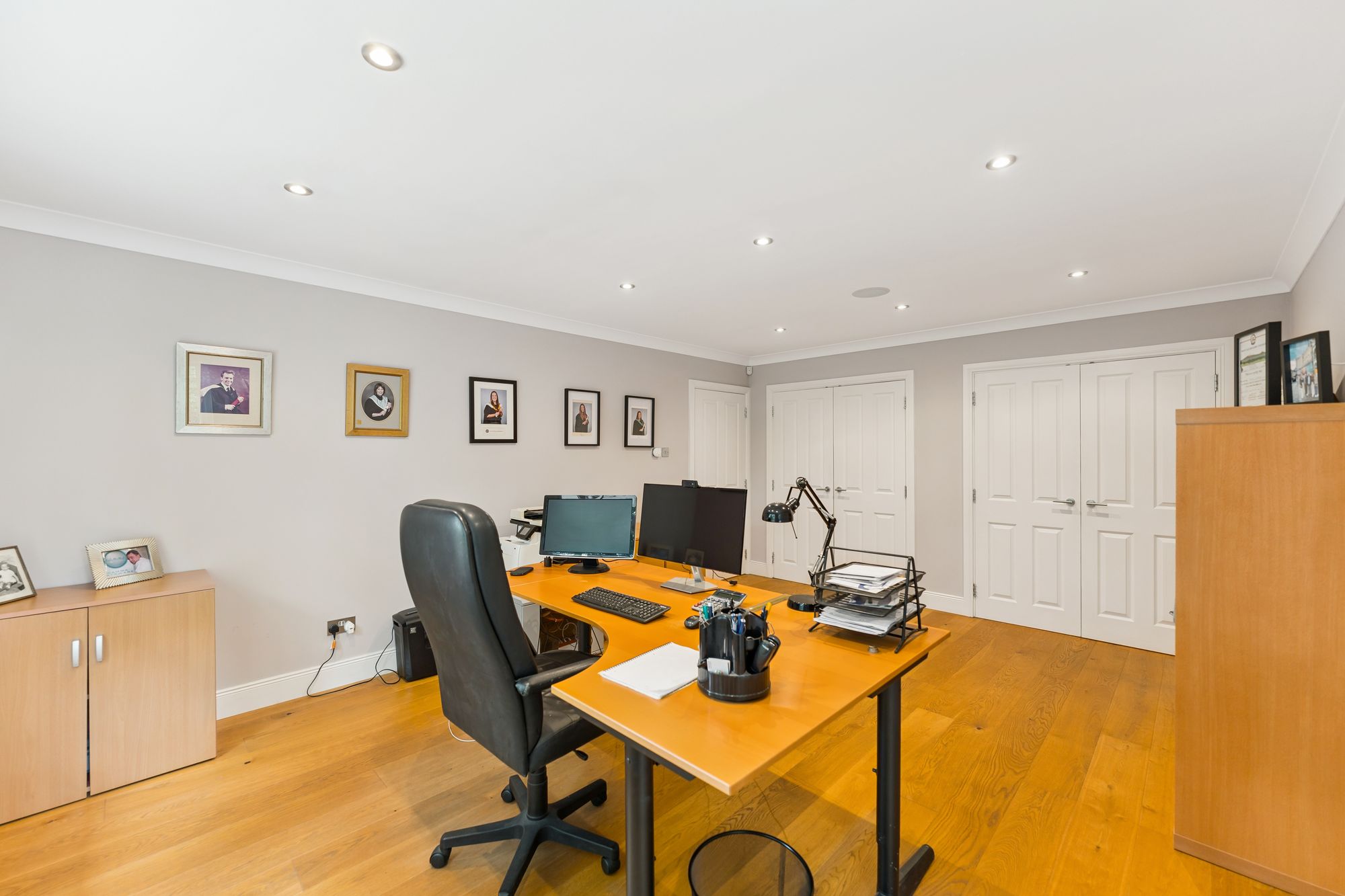 The ground floor also features a spacious home office, complete with built-in storage, which offers the flexibility to be used as a fifth bedroom if desired. The fully tiled downstairs WC adds practicality, while the heart of the home lies in the expansive open-plan family room and kitchen. This light-filled space boasts multiple aspect windows and French doors that open directly onto the impressive rear gardens, ideal for indoor-outdoor living. The well-appointed kitchen also benefits from an adjoining laundry room, offering convenient everyday functionality.