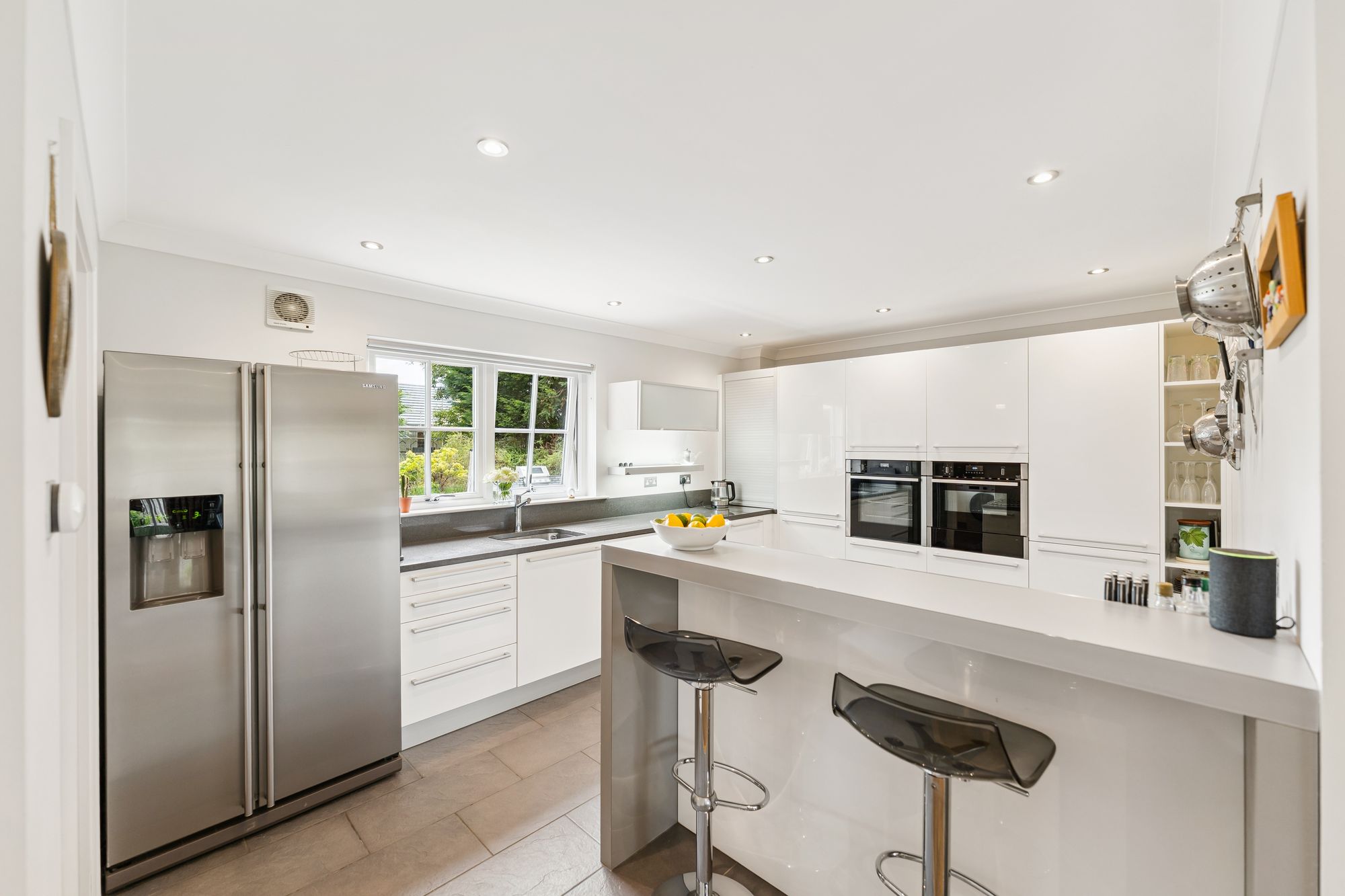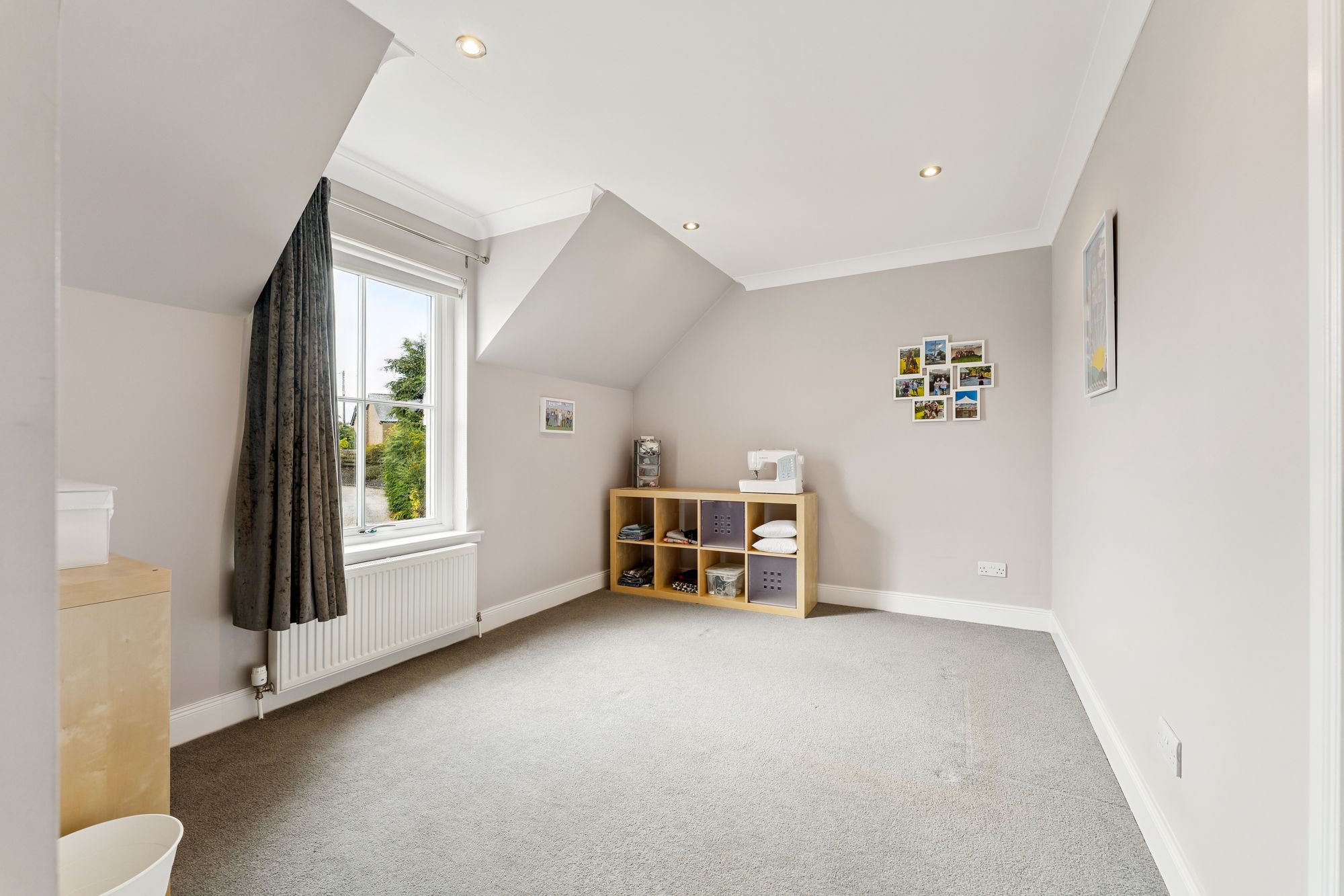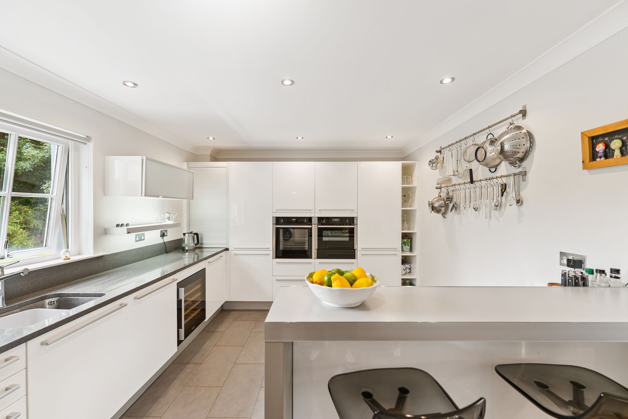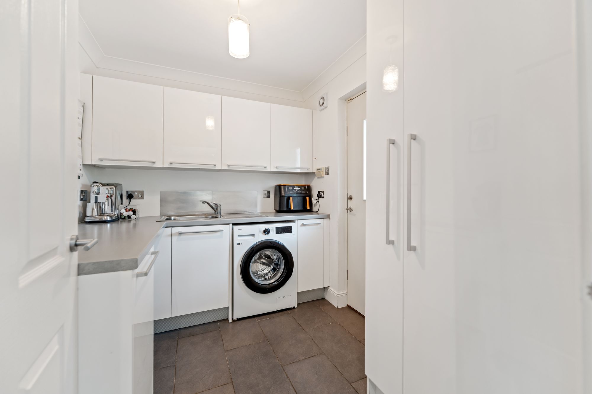 The ground floor also features a spacious home office, complete with built-in storage, which offers the flexibility to be used as a fifth bedroom if desired. The fully tiled downstairs WC adds practicality, while the heart of the home lies in the expansive open-plan family room and kitchen. This light-filled space boasts multiple aspect windows and French doors that open directly onto the impressive rear gardens, ideal for indoor-outdoor living. The well-appointed kitchen also benefits from an adjoining laundry room, offering convenient everyday functionality.