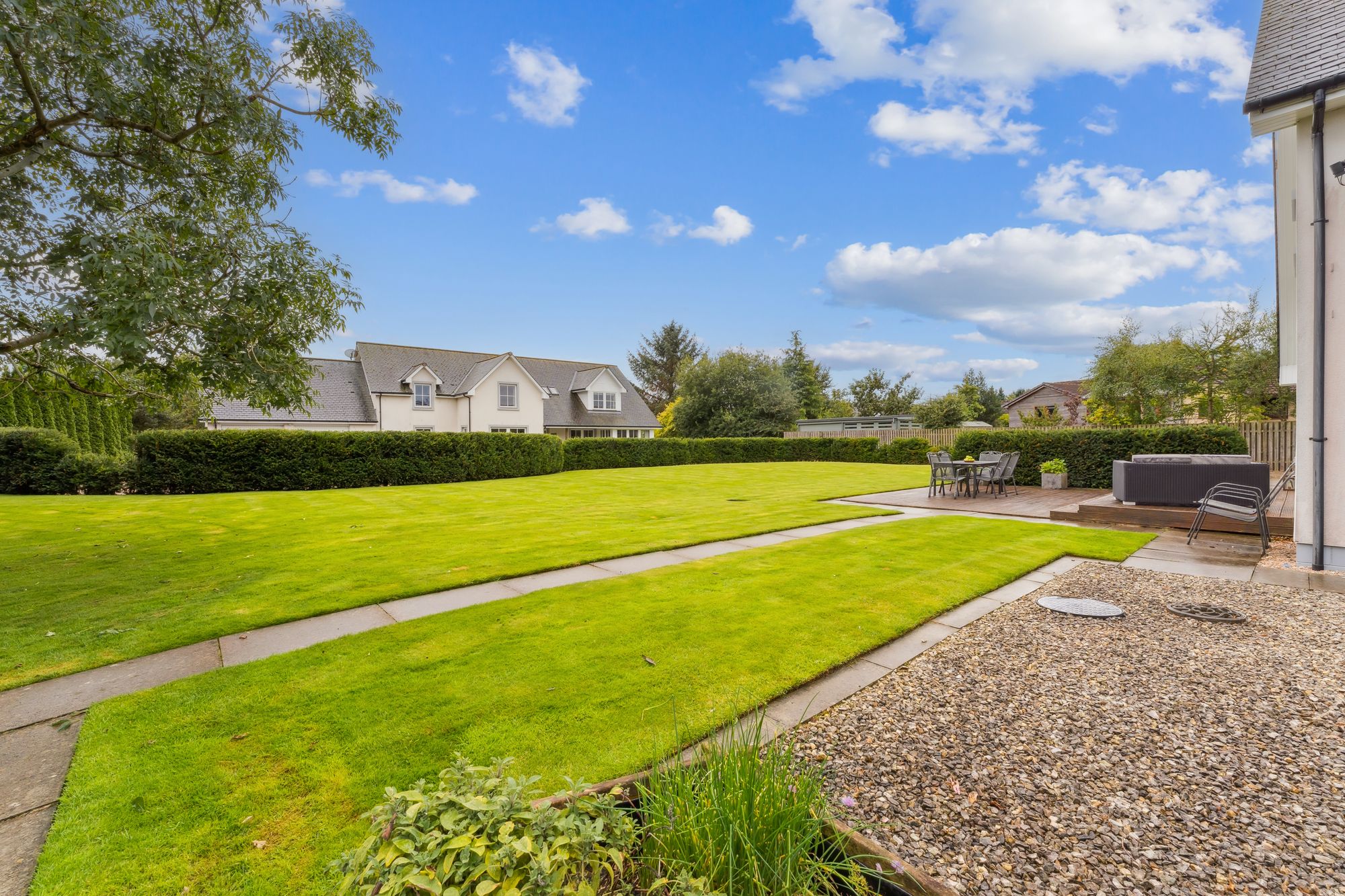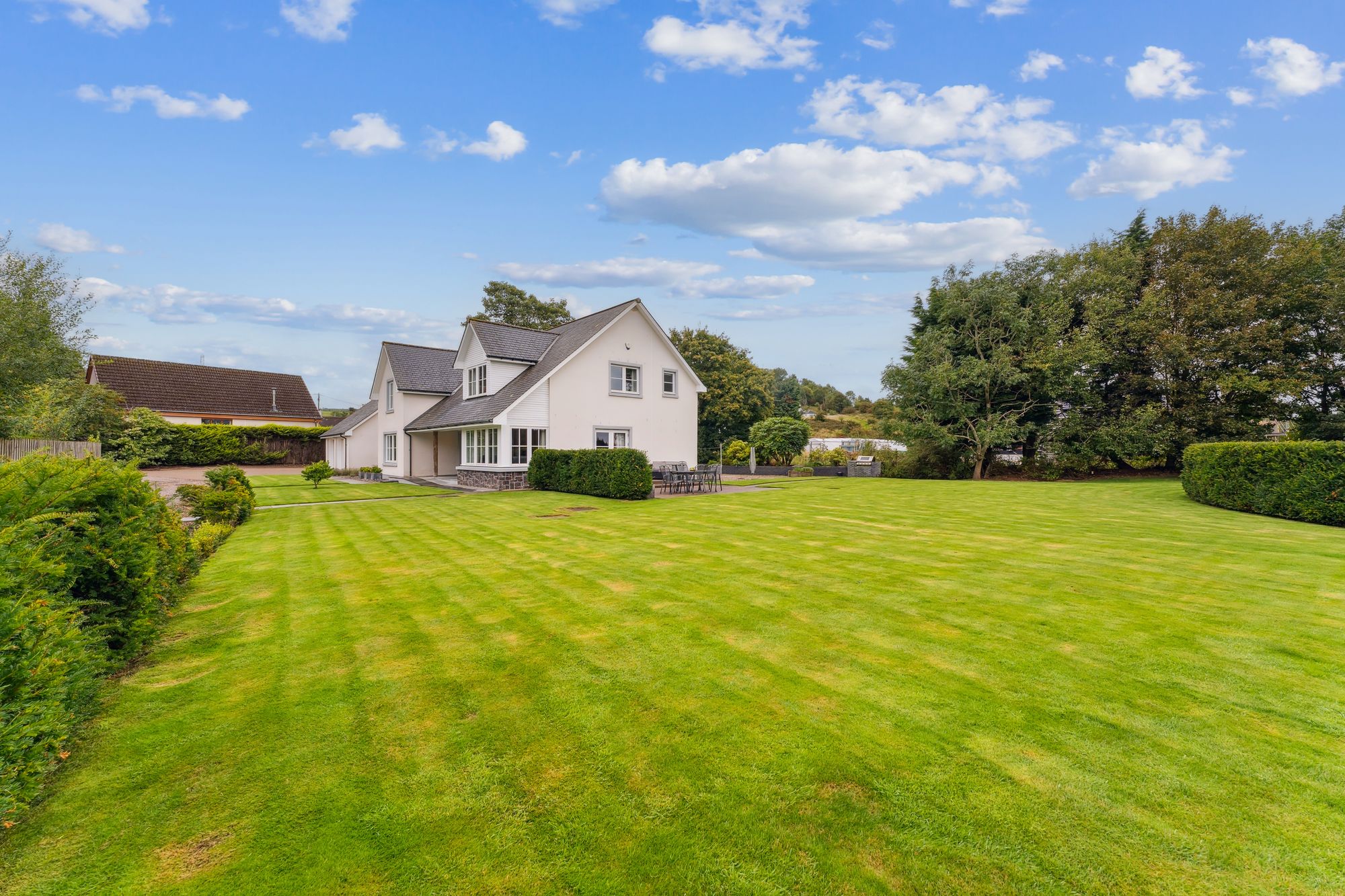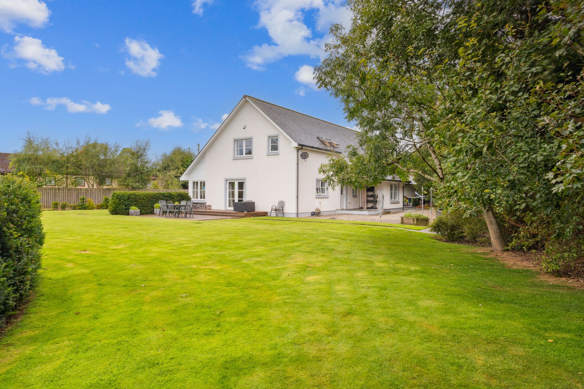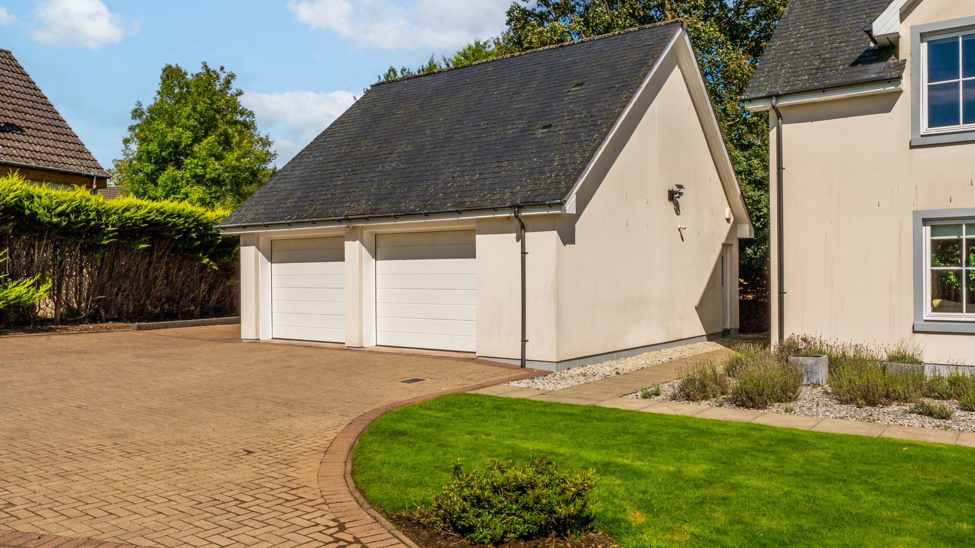Externally, the property occupies a substantial plot, with expansive areas of level lawn to the side, all enclosed by mature hedgerows that offer excellent privacy. A large decked area provides the perfect setting for outdoor dining and entertaining, while the garden wraps around the property and features hard landscaping to the rear, ideal for low-maintenance enjoyment. To the side of the house is a generous detached double garage with electric roller doors, an electric vehicle charging point, and a superb self-contained annex above. Currently used as a gym with a w/c, this multifunctional space could easily adapt to a home office, studio, or guest accommodation.