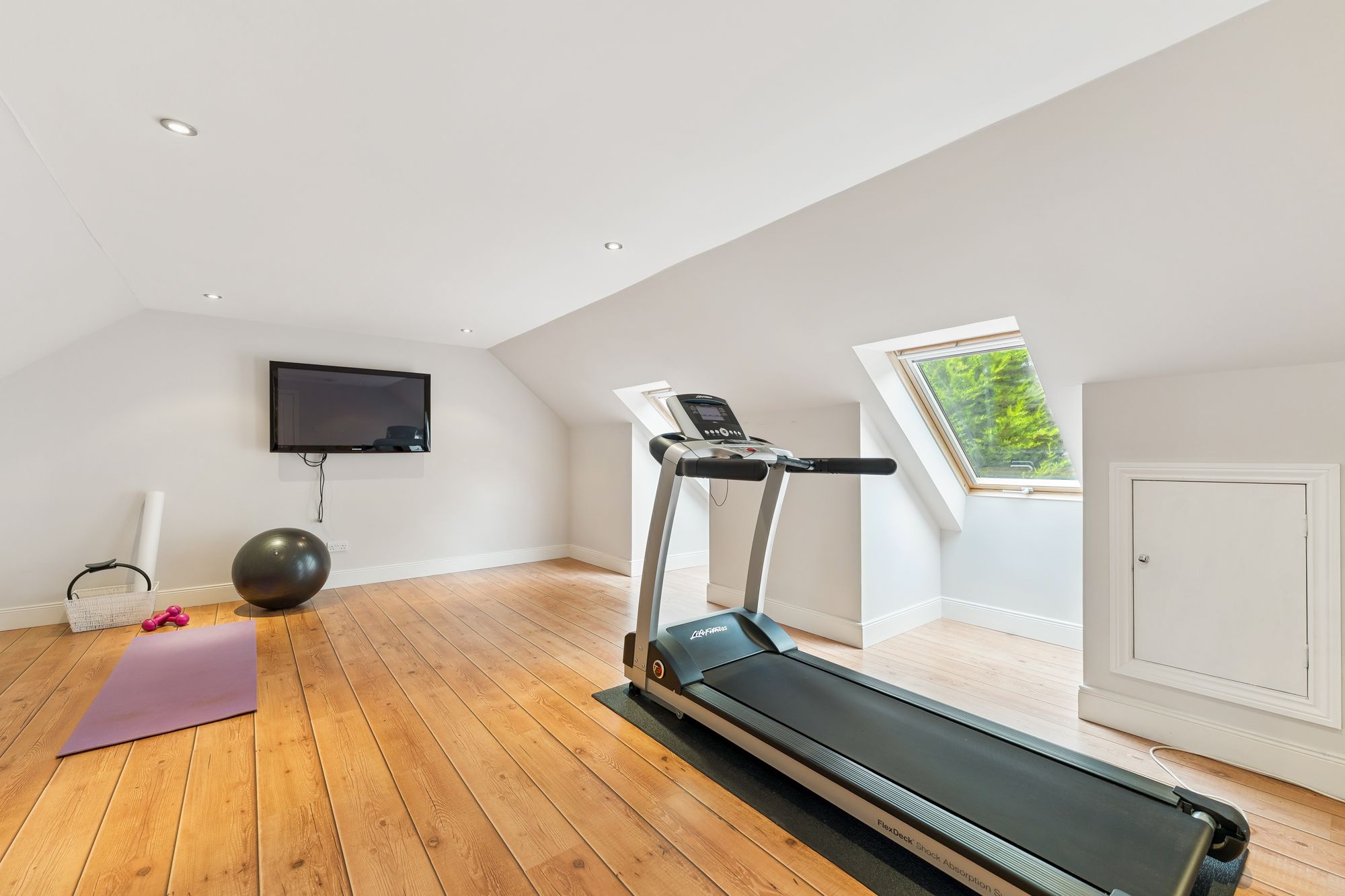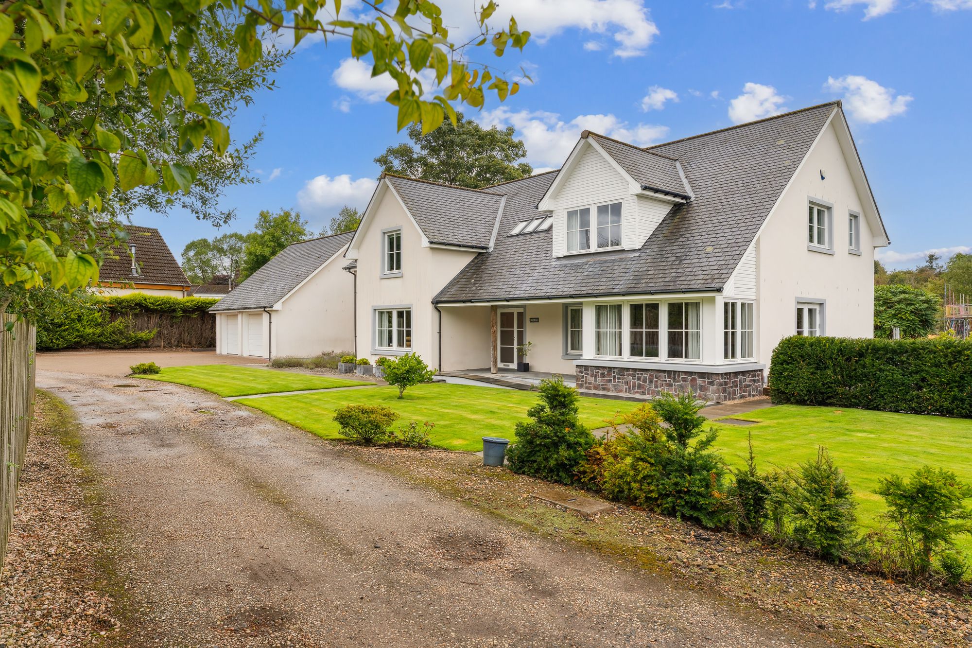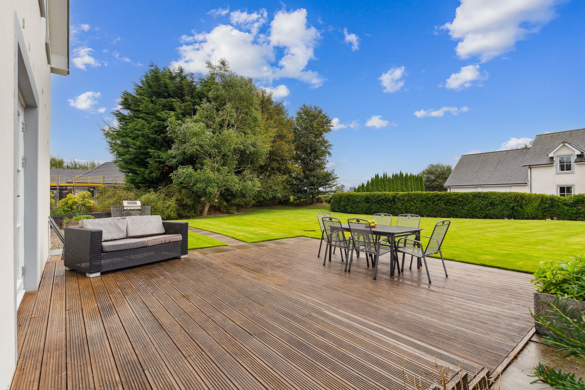 Externally, the property occupies a substantial plot, with expansive areas of level lawn to the side, all enclosed by mature hedgerows that offer excellent privacy. A large decked area provides the perfect setting for outdoor dining and entertaining, while the garden wraps around the property and features hard landscaping to the rear, ideal for low-maintenance enjoyment. To the side of the house is a generous detached double garage with electric roller doors, an electric vehicle charging point, and a superb self-contained annex above. Currently used as a gym with a w/c, this multifunctional space could easily adapt to a home office, studio, or guest accommodation.