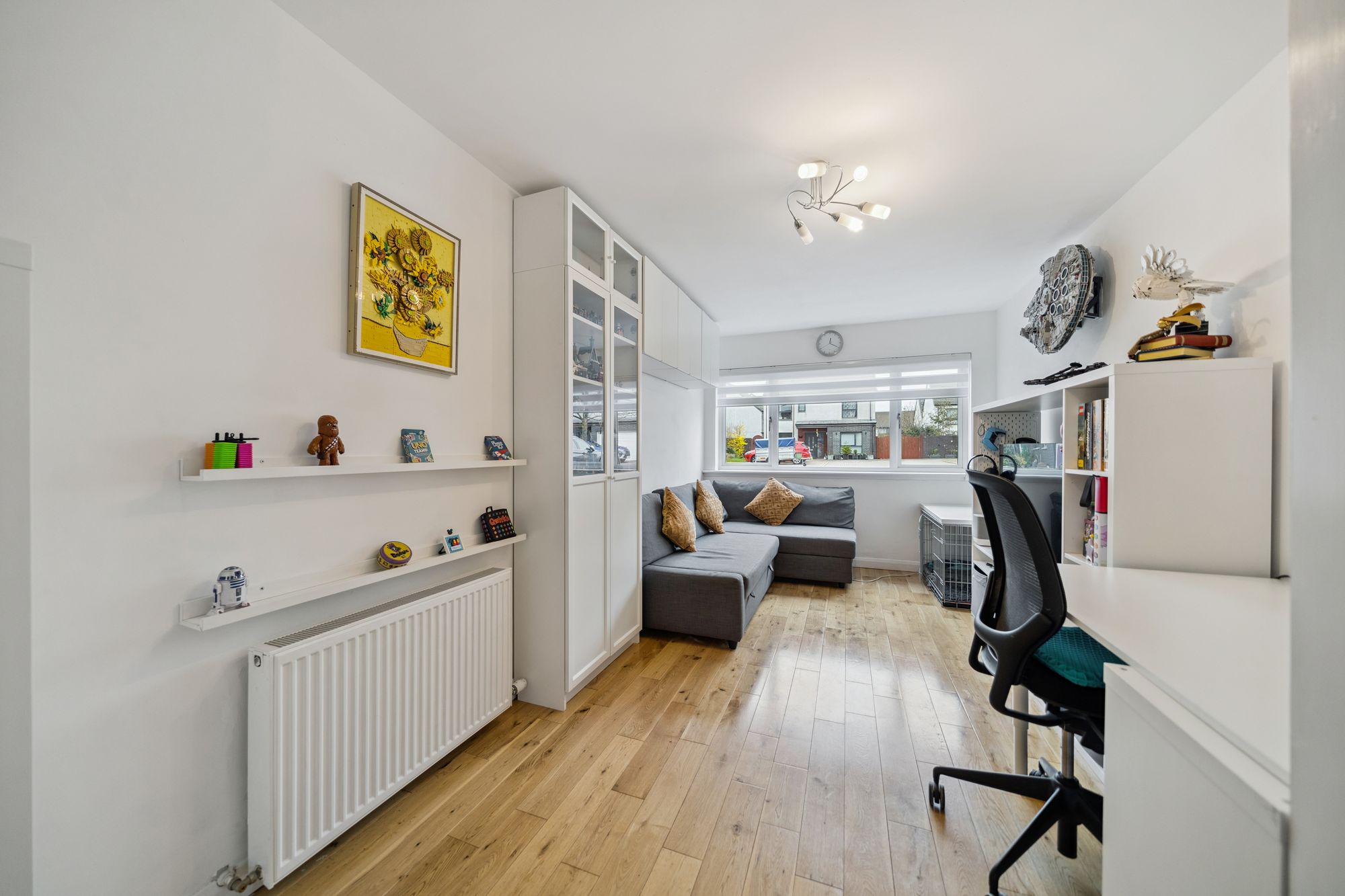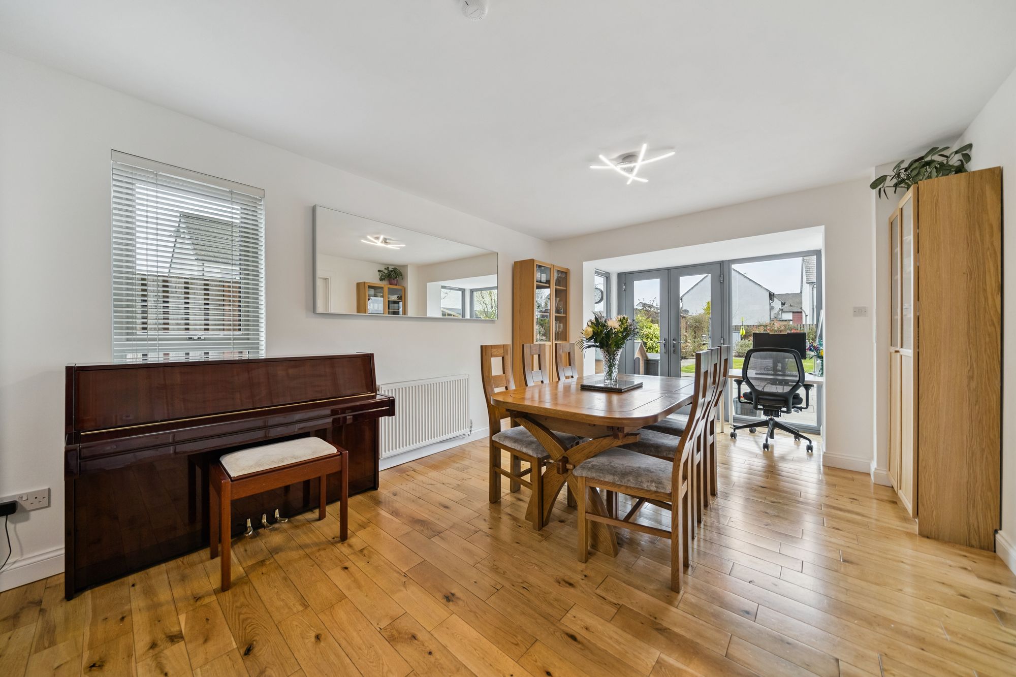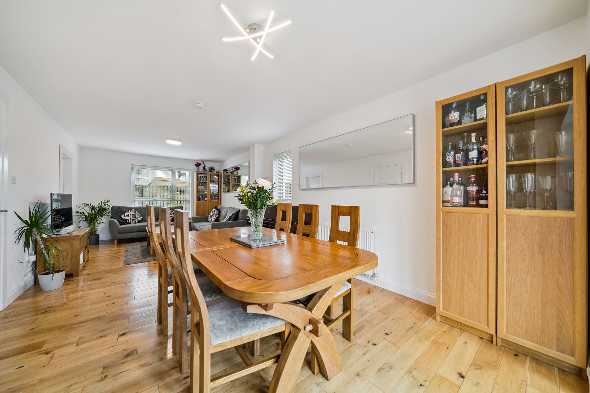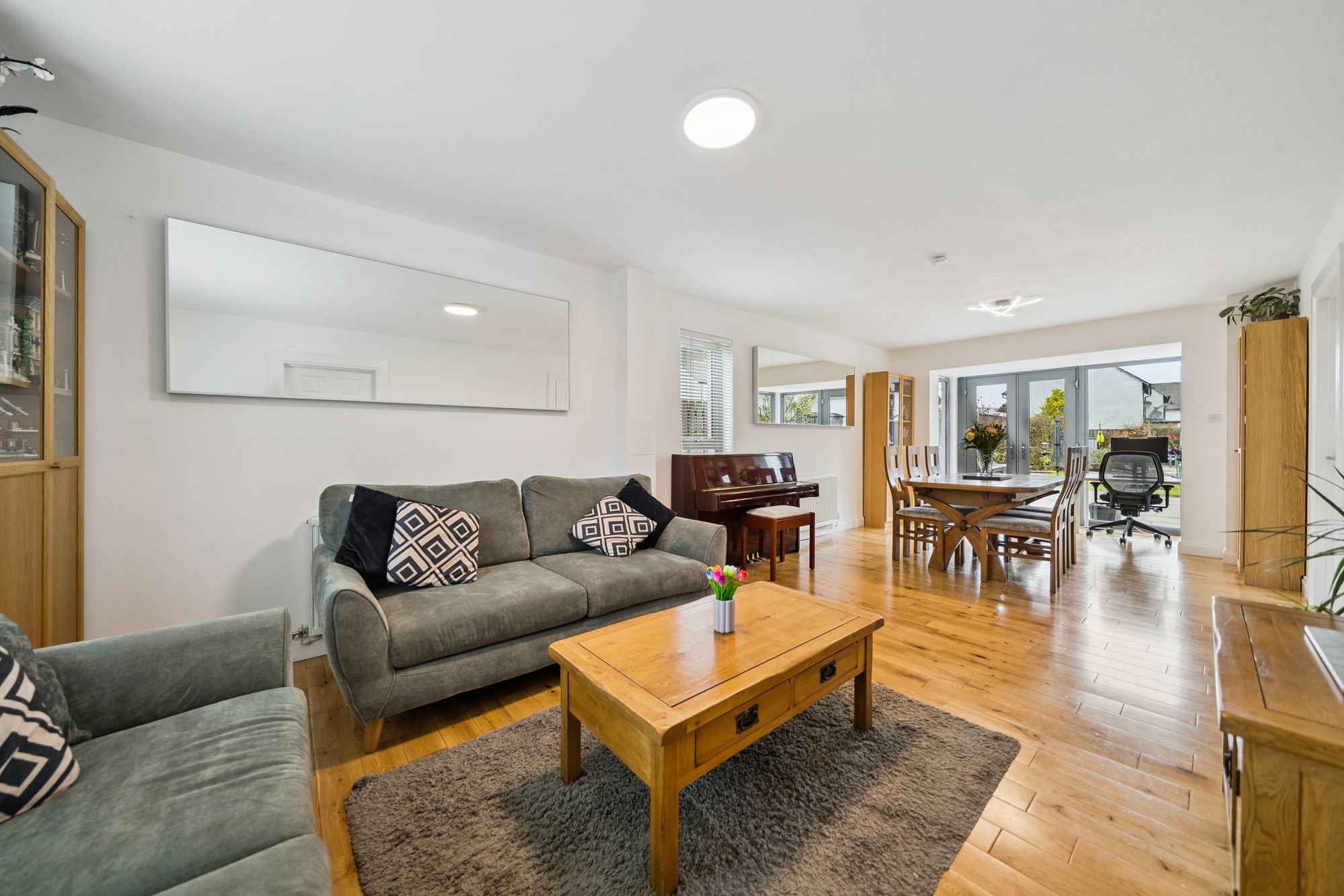The ground floor accommodation is both spacious and well laid out, centred around a bright and contemporary open plan lounge and dining area. This impressive space is enhanced by modern finishes, warm wood flooring, and ample natural light from the rear aspect, creating an inviting setting for both everyday living and entertaining. The dining area comfortably accommodates a full-sized table, while the lounge offers a relaxed and stylish environment. A separate sitting room provides additional flexibility as a family room, home office, or playroom, and the kitchen is well-appointed with generous storage and workspace. A convenient ground floor toilet completes the lower level.