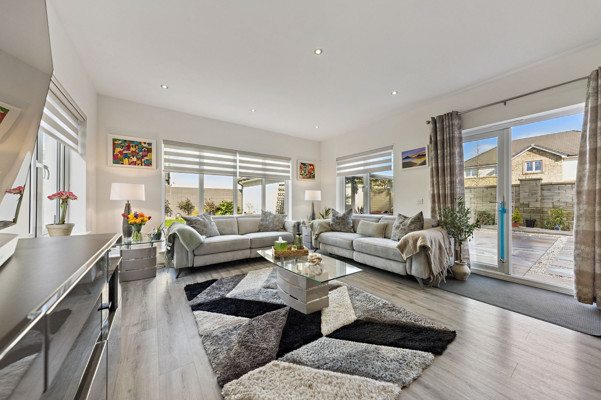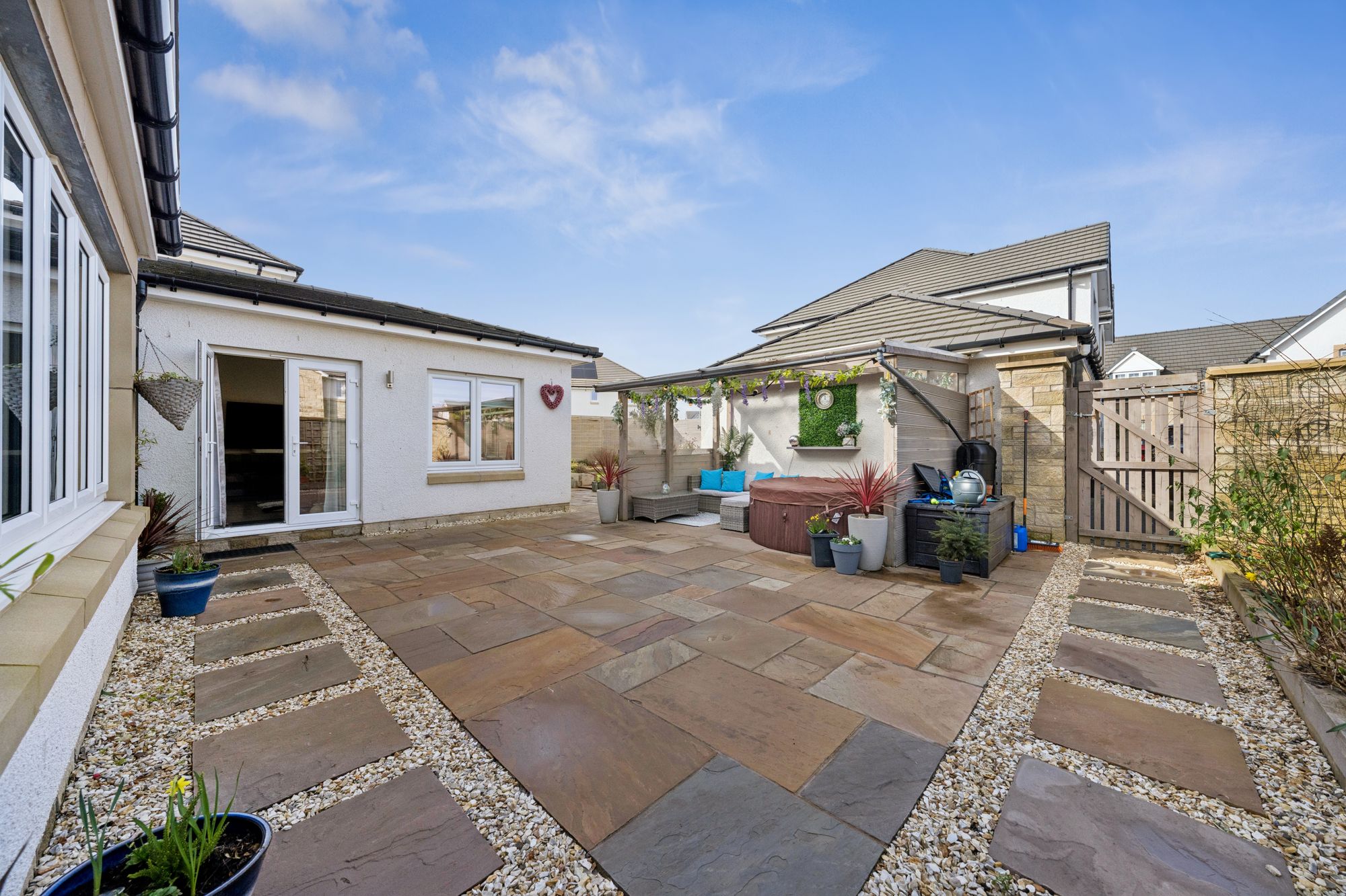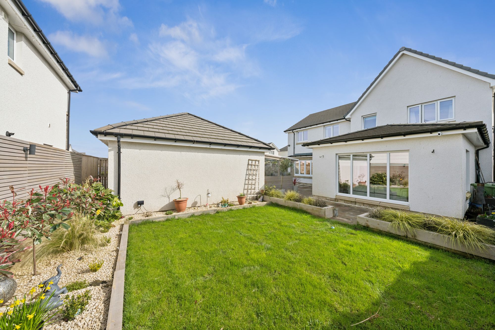 The property commands a level, corner plot accompanied by a double garage and monobloc parking for two vehicles. The rear garden is fully enclosed, landscaped and particularly private comprising of a manicured area of lawn bordered by well stocked display beds and a covered patio area which is perfect for outside entertaining.