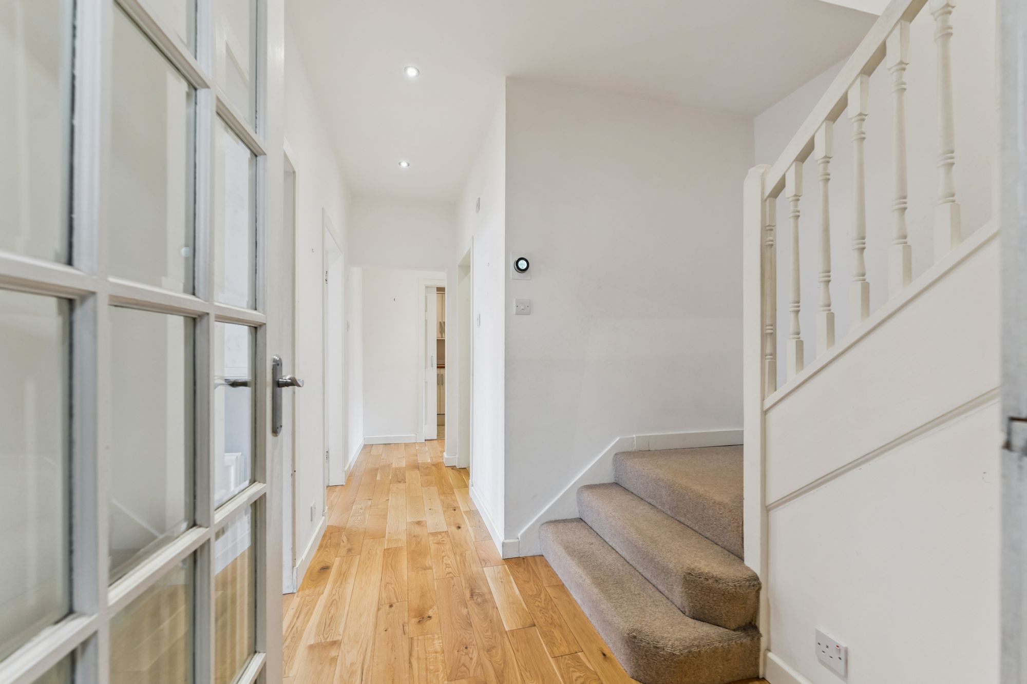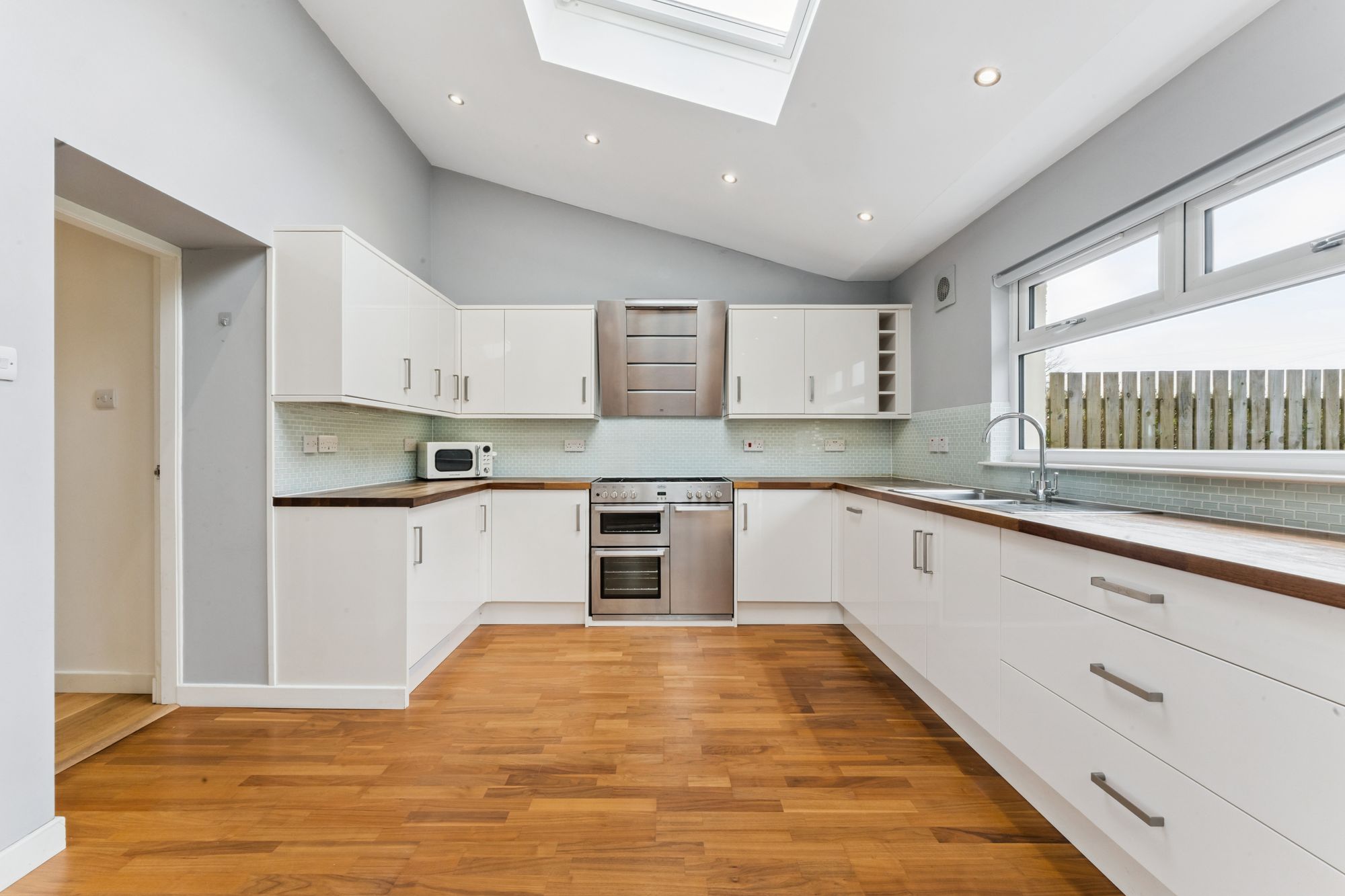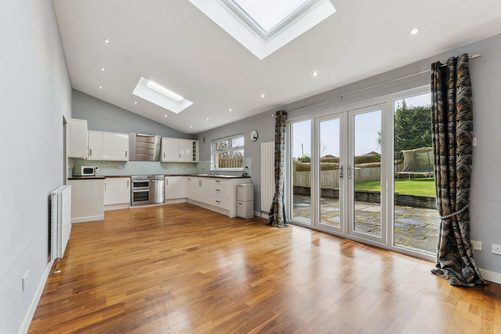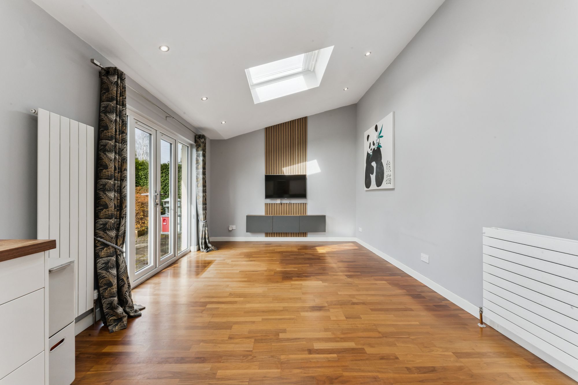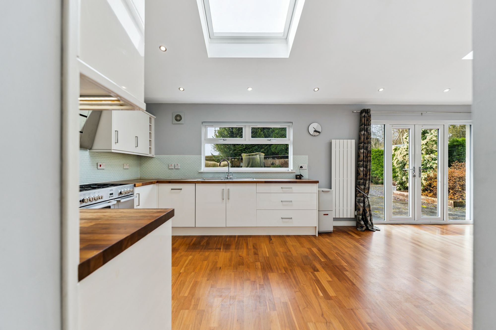The accommodation extends to a welcoming reception hallway with staircase and useful storage, a bright and spacious bay-windowed lounge, a generous double bedroom, and a well-proportioned utility room. To the rear, a superb extension forms an impressive open-plan kitchen and dining space, flooded with natural light from Velux windows and French doors leading directly to the garden. The contemporary kitchen is finished with matte white cabinetry, wooden worktops, and a range of integrated appliances including a gas hob, oven, and extractor hood. A stylish modern shower room completes the ground floor.