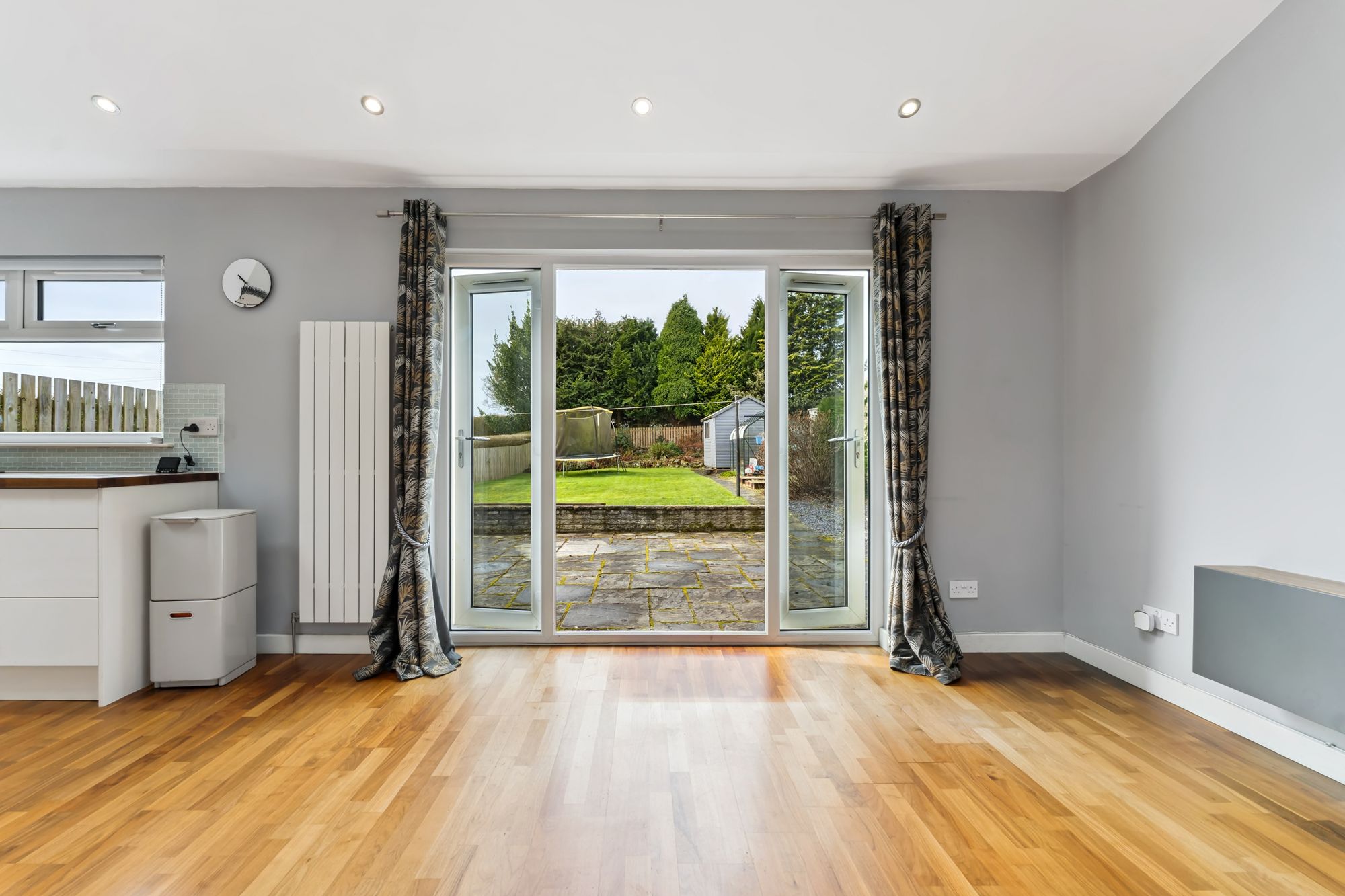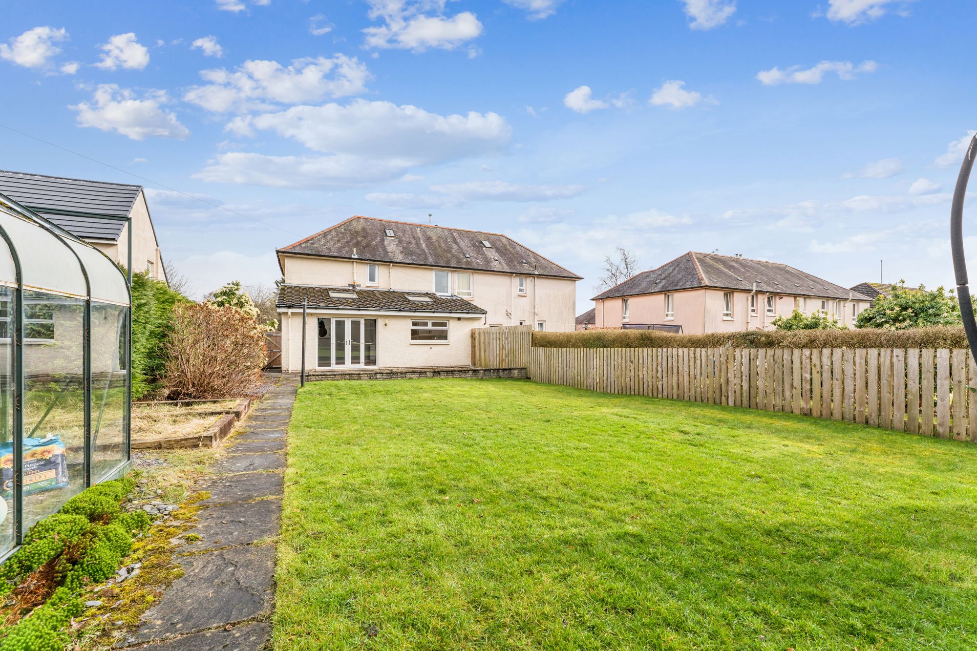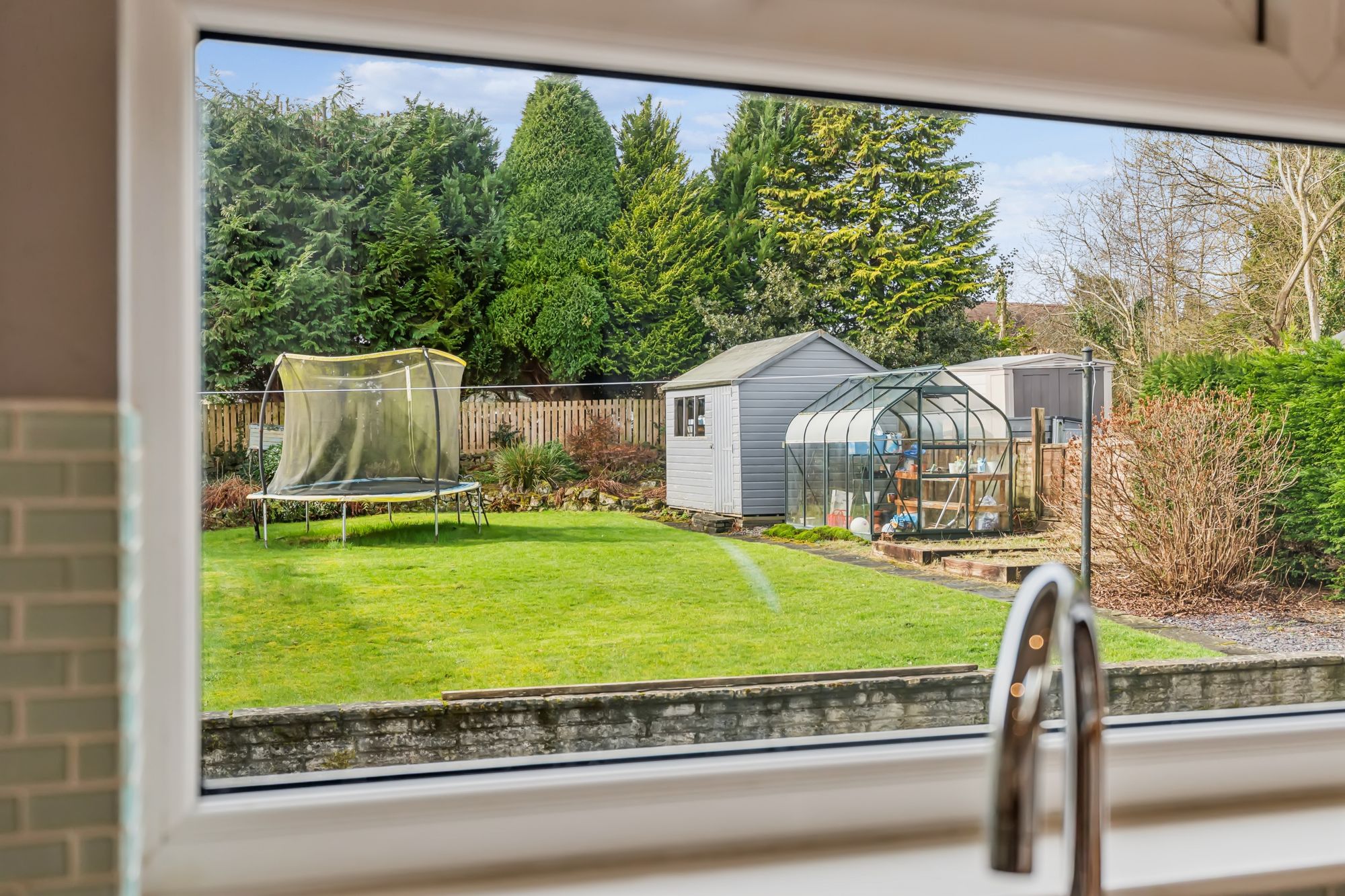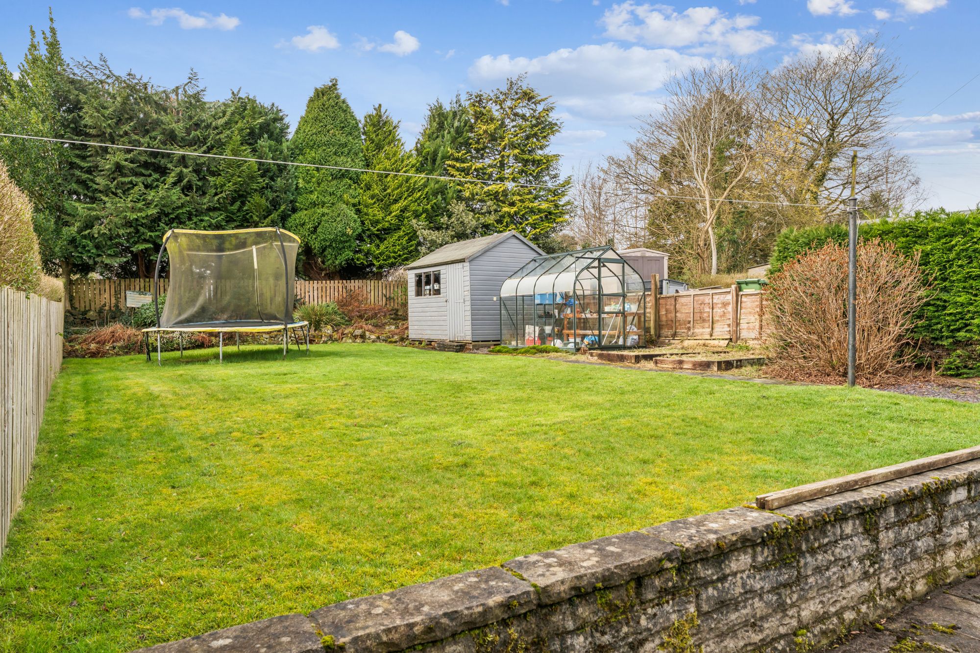 Externally, the property enjoys generous garden grounds. The front features a monoblocked driveway and a neat lawn bordered by hedging, while the rear garden is particularly impressive—large, private, and fully enclosed, with a lawn, timber fencing, and a peaceful tree-lined outlook. A garden shed and greenhouse are also included.
