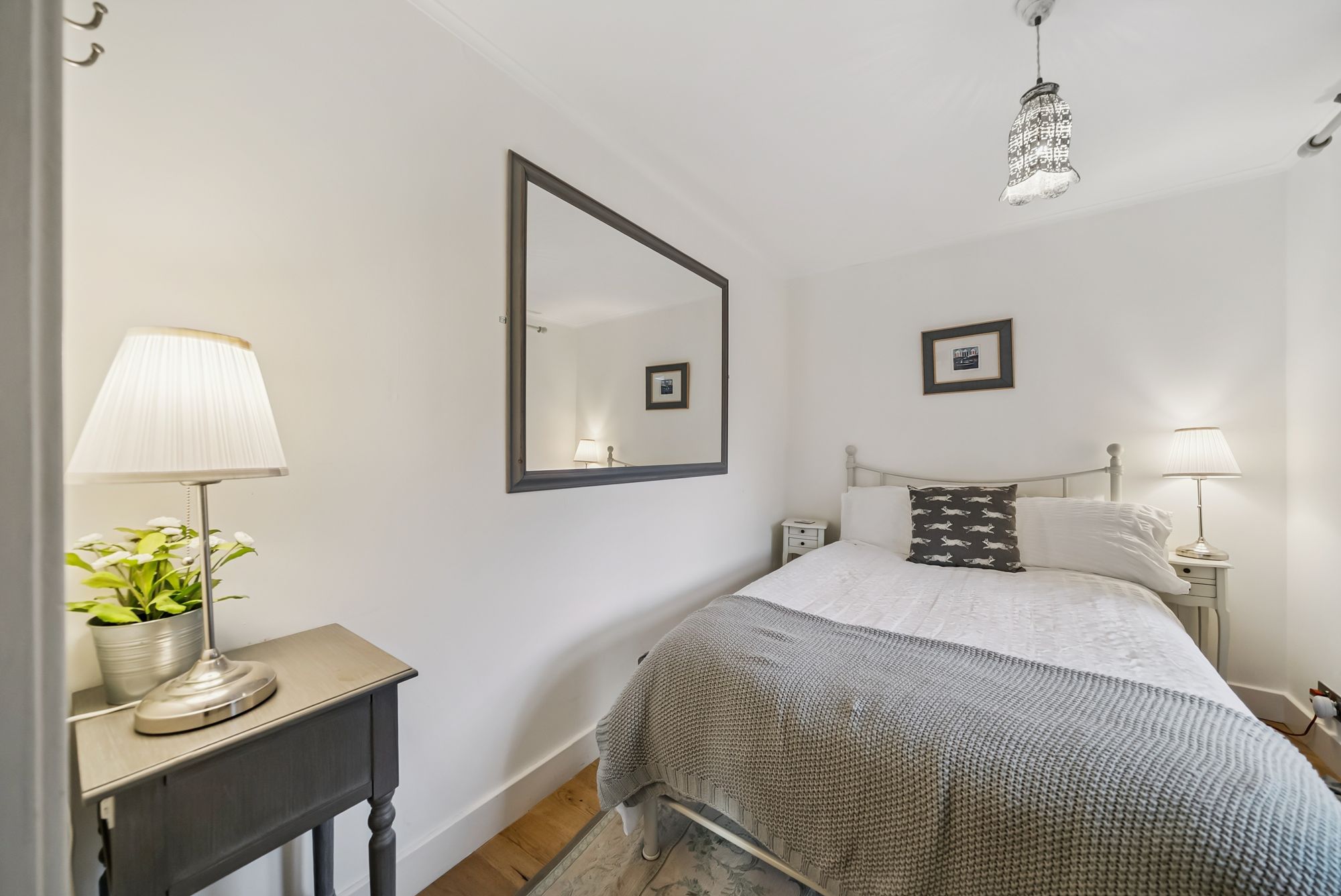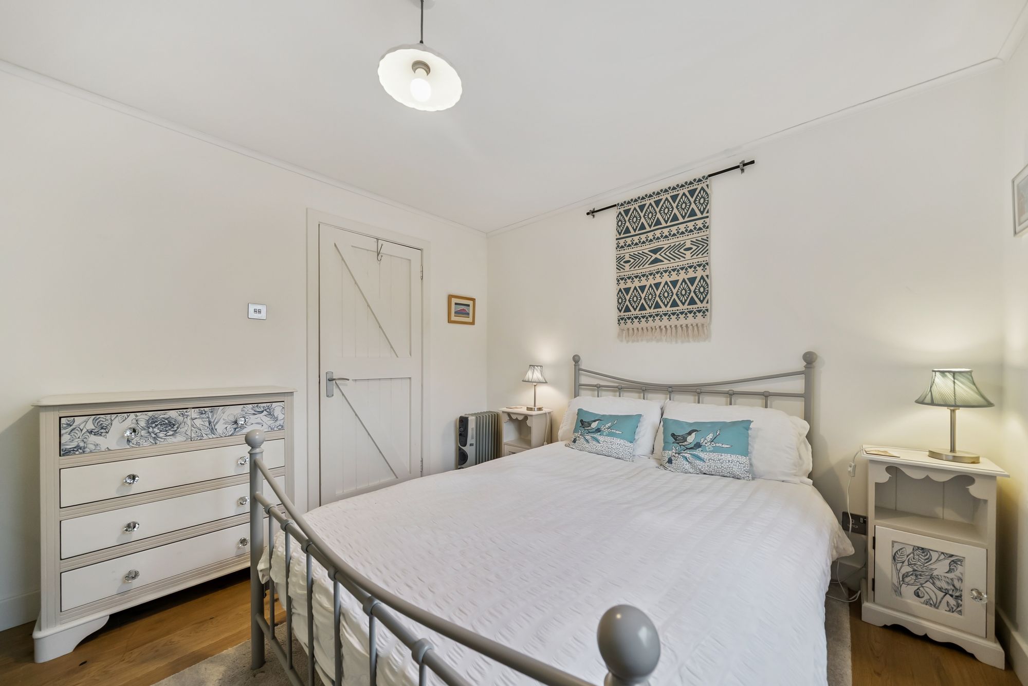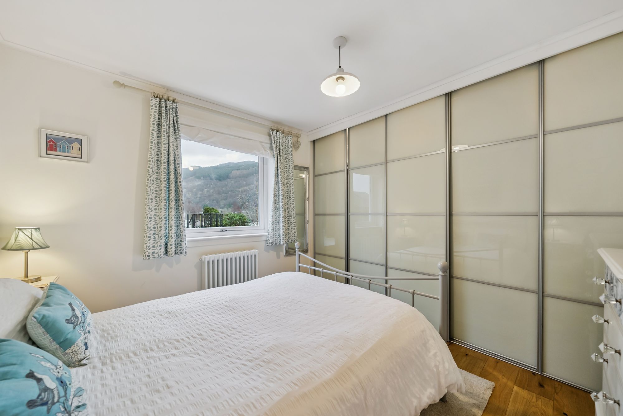 At the heart of the home is a generous dining kitchen, providing ample space for food preparation and informal dining. With direct access to the side of the property, it is perfectly suited to both everyday living and entertaining. Across the hallway lies the large and airy principal bedroom, which enjoys attractive views towards the surrounding hills and features built-in wardrobes.