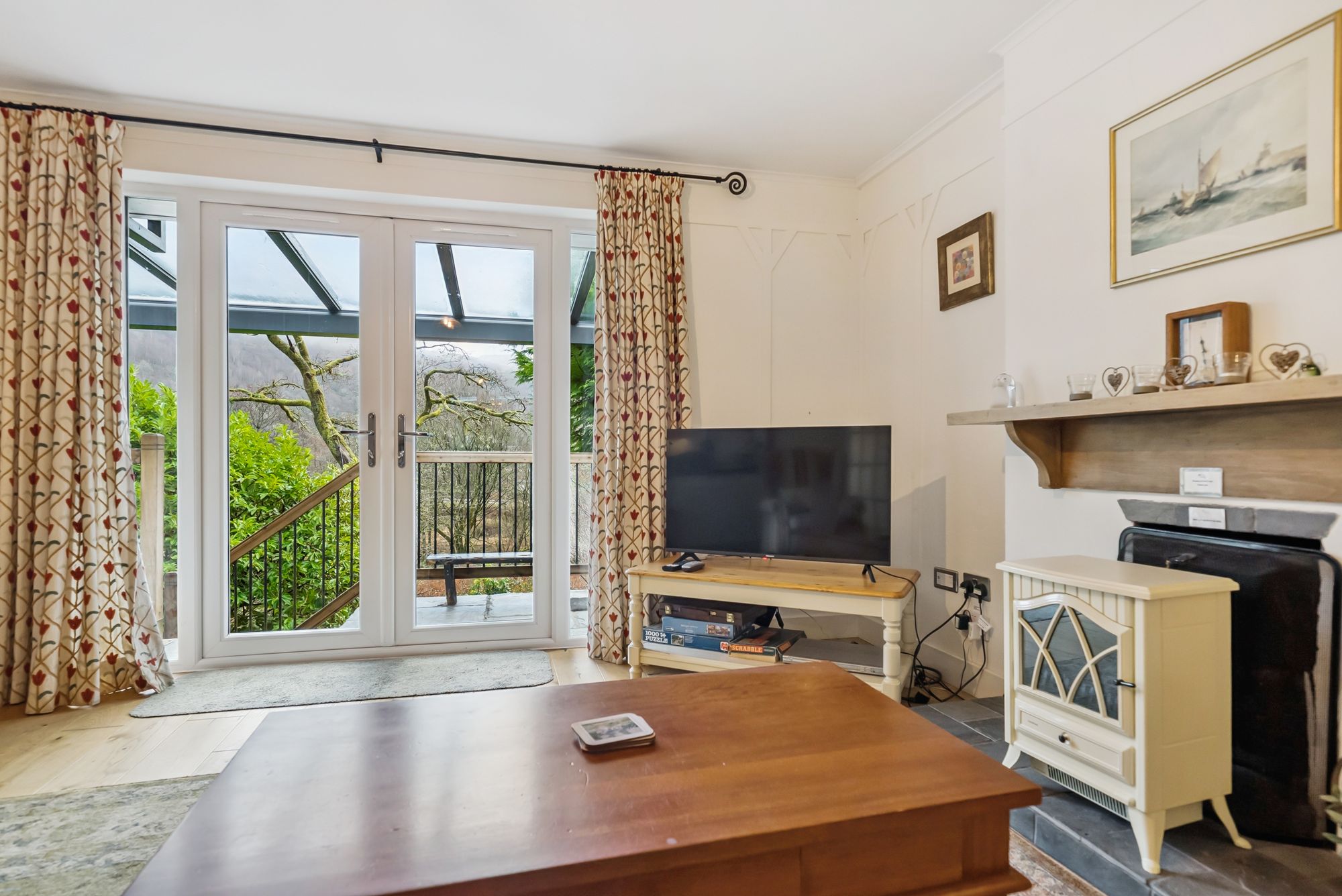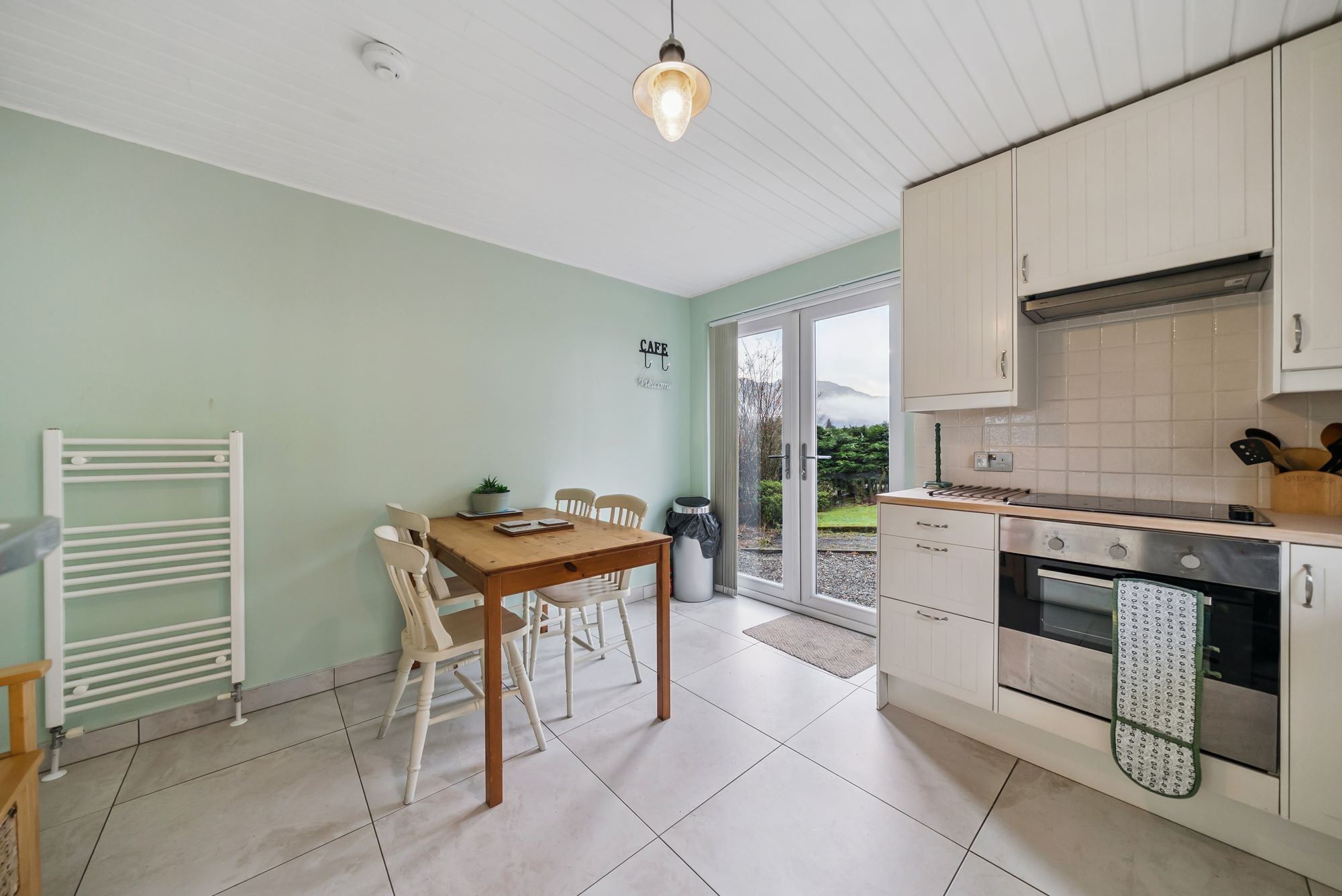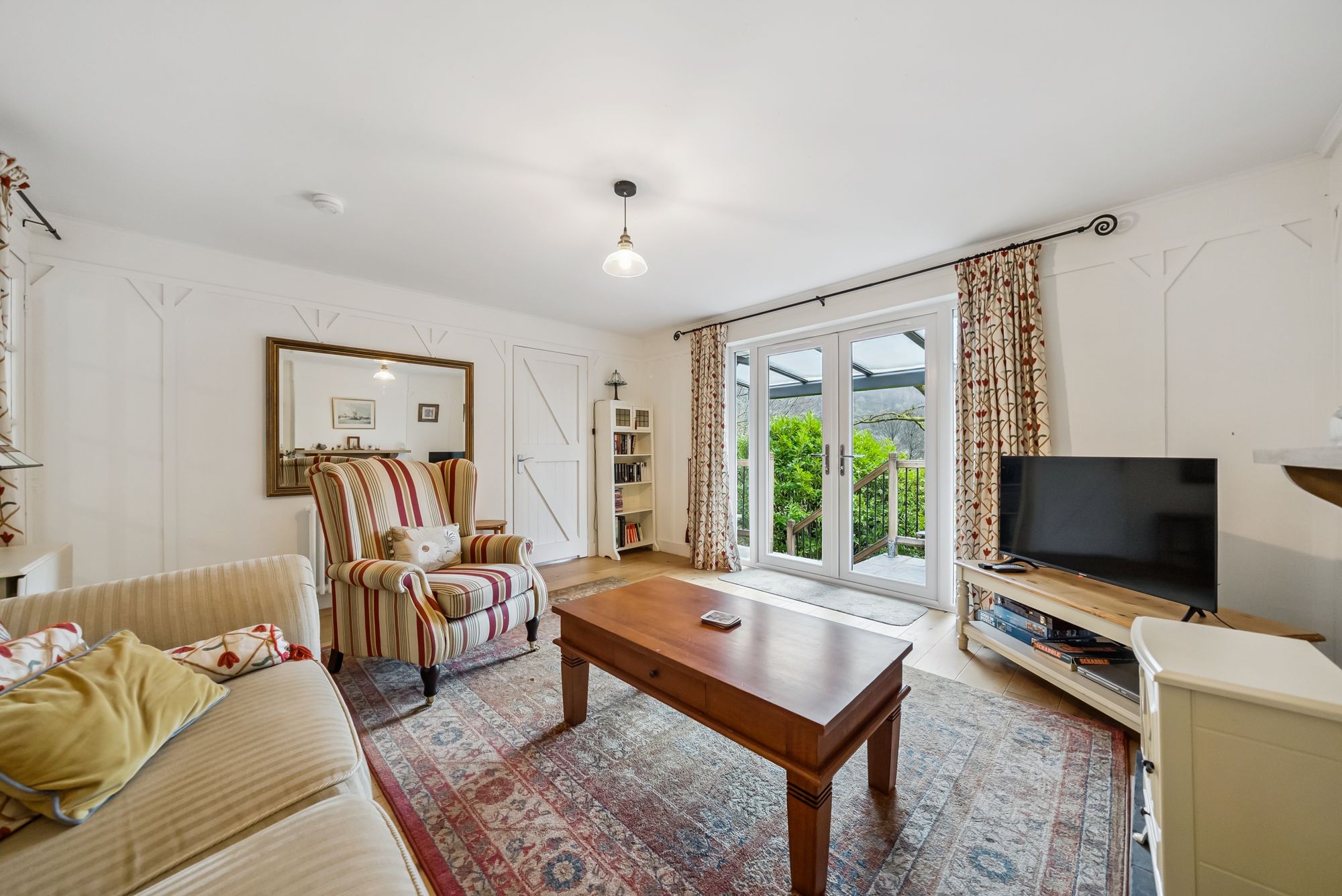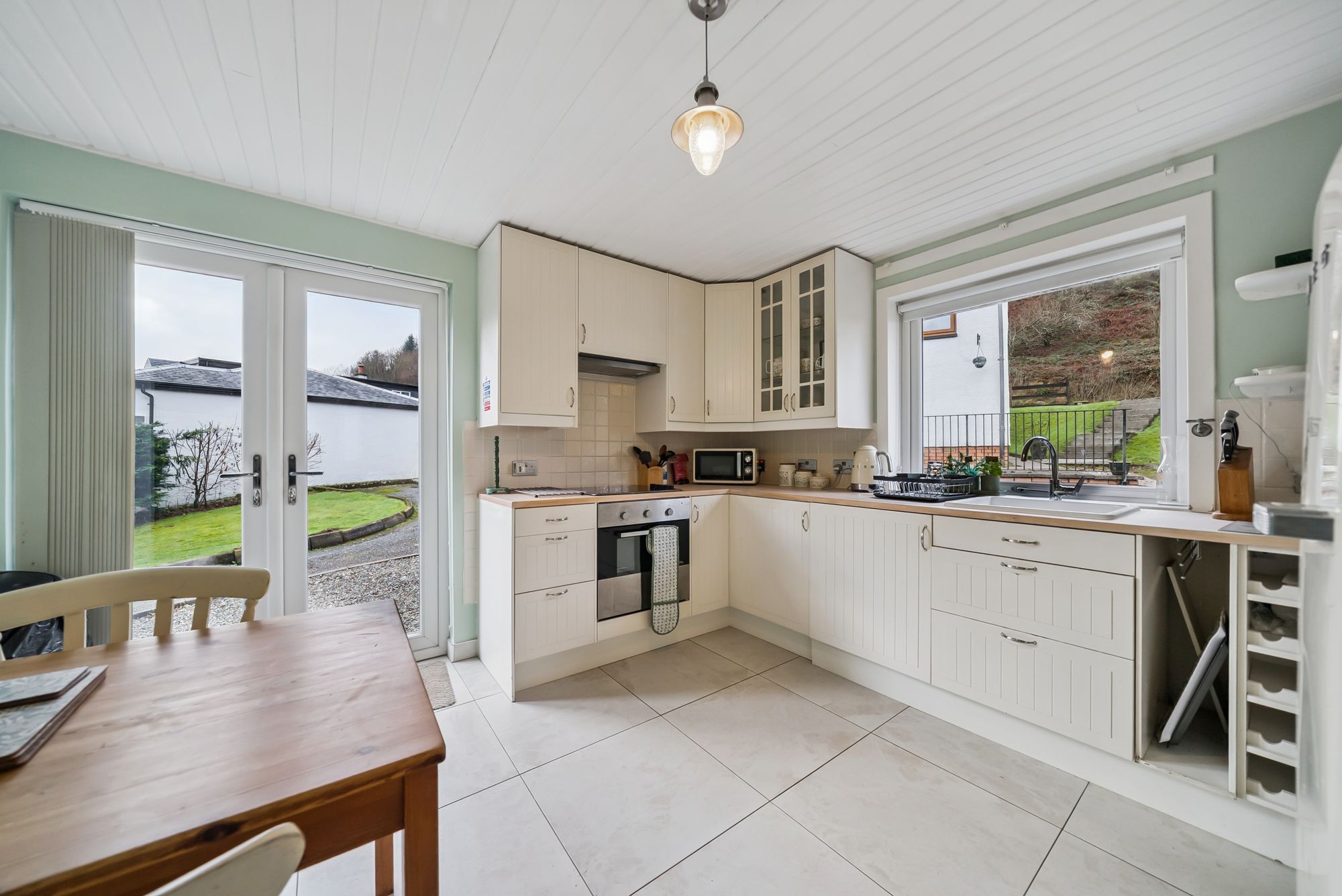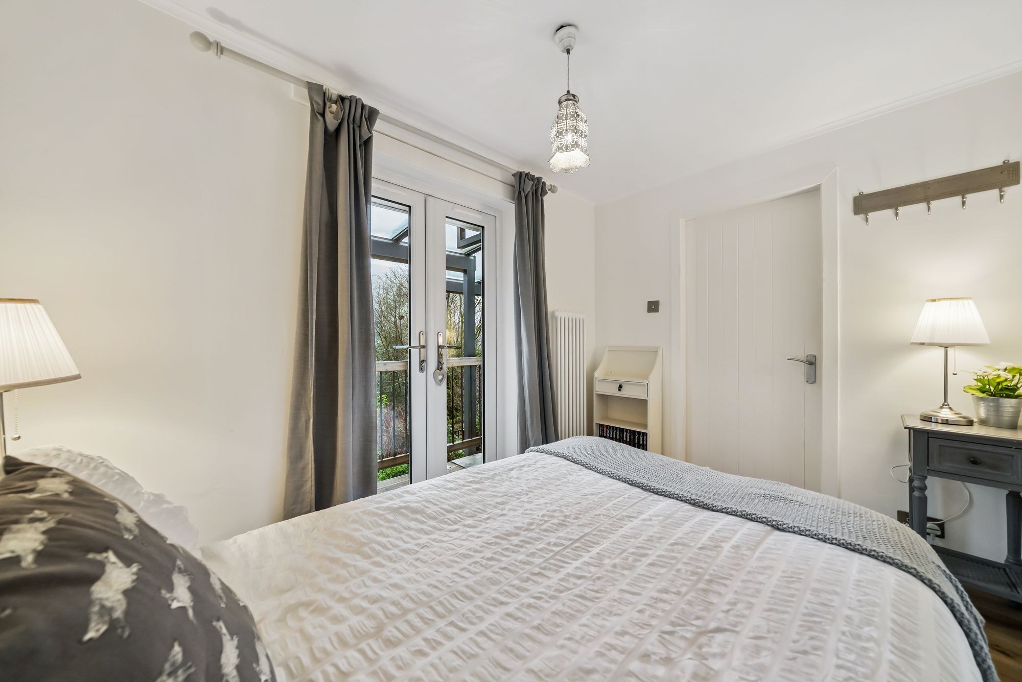 The accommodation is arranged entirely on one level and begins with a welcoming entrance hallway providing access to the principal living areas. The bright and spacious lounge benefits from excellent natural light and offers direct access to a second bedroom, creating a flexible layout suitable for guest accommodation, home working, or hobby space. Both rooms feature double doors opening onto a scenic patio area, seamlessly connecting the interior with the outdoors.