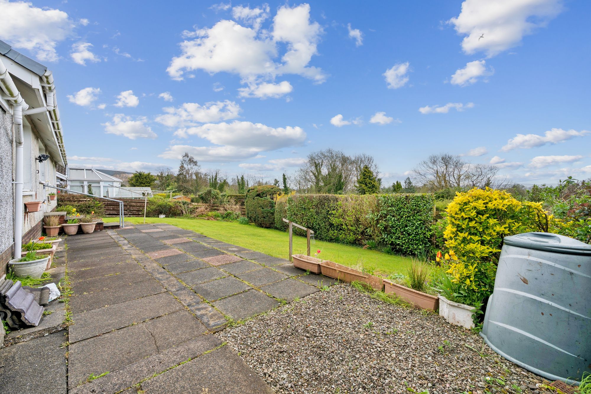 Externally, the front garden is laid mainly to lawn with surrounding borders, while the rear garden is generously proportioned, enclosed, and designed for ease of maintenance. It features a raised paved patio area, ideal for outdoor entertaining, alongside a variety of mature and young plants, trees, and shrubs, all enclosed by timber fencing.