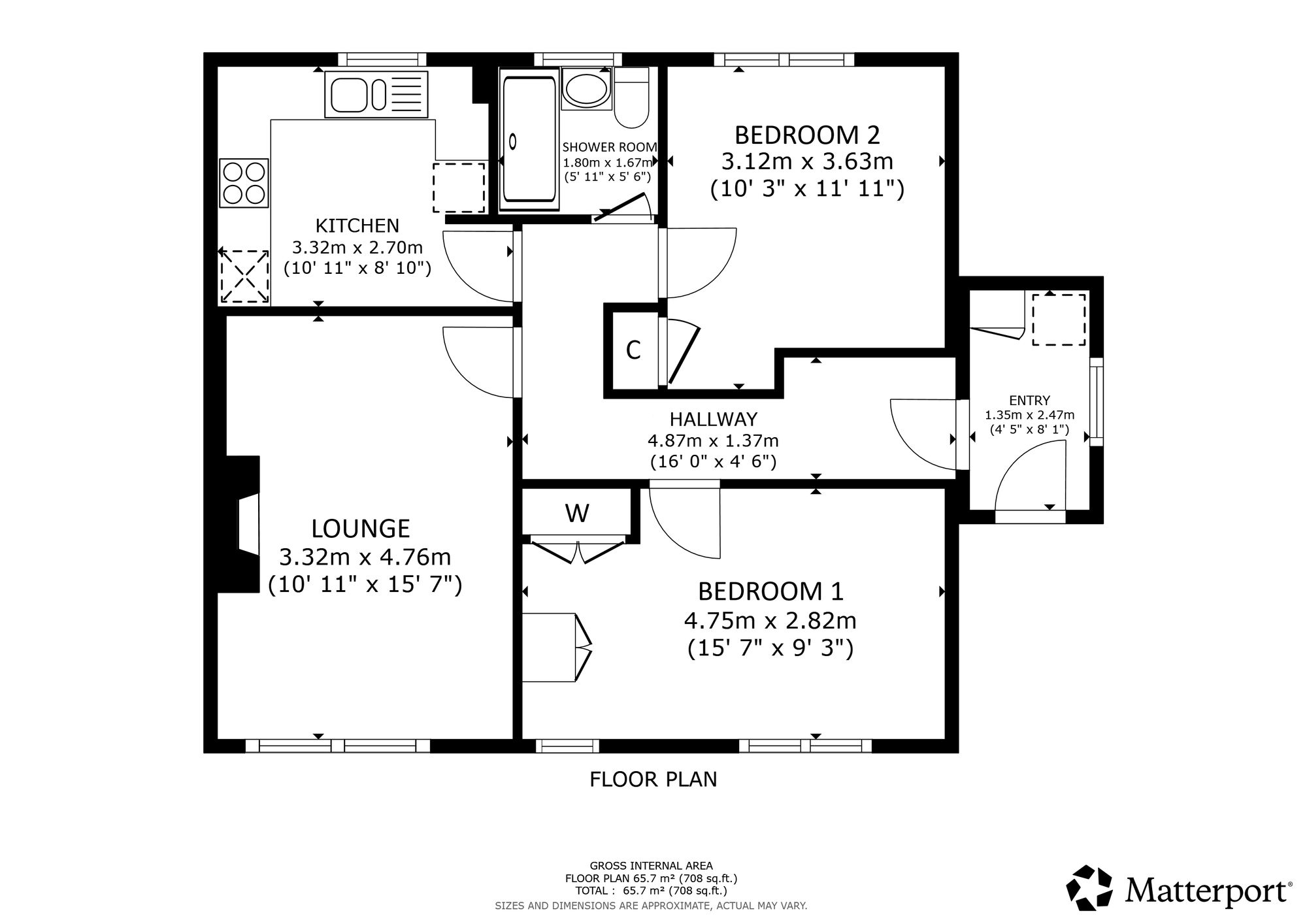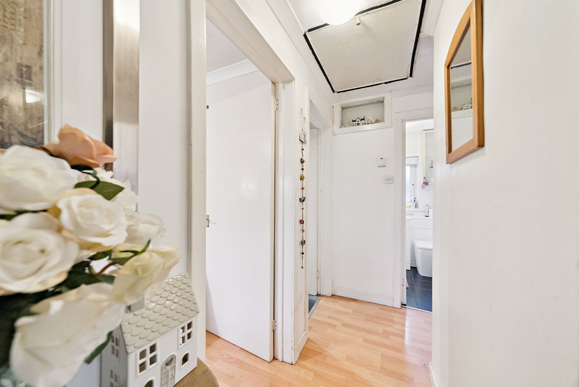 The flat features a welcoming entrance porch leading into a bright and airy hallway. The lounge is generous in size and fitted with modern windows, providing an abundance of natural light. The kitchen is well-appointed with wall and floor units, a one-and-a-half bowl stainless-steel sink, and thoughtfully tiled walls, creating a functional and stylish cooking space. Two comfortable bedrooms with built-in wardrobes offer ample storage, while the shower room is modern, with a combination of tiled and panelled walls for a clean, contemporary look. Additional interior features include a convenient under stair storage cupboard and internal PVC doors throughout.
