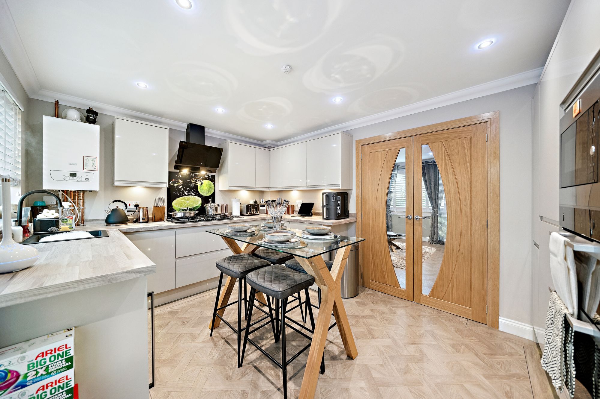 The accommodation begins with a welcoming entrance vestibule leading into a bright and spacious living room, flooded with natural light from a wide front-facing window. The room provides a versatile layout, comfortably accommodating a variety of freestanding lounge furniture. The entire ground floor is finished with beautiful basket-weave Amtico flooring, enhancing both the style and practicality of the space.