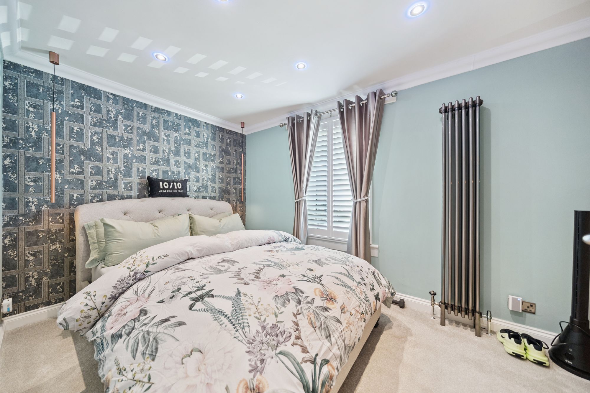 To the rear, the modern dining kitchen offers generous space for a table and chairs and is fitted with an attractive range of floor and wall-mounted units with integrated appliances, including a double oven, dishwasher, washer/dryer, microwave and wine chiller. French doors open directly onto the enclosed, south-facing garden, creating an excellent indoor-outdoor connection and an ideal setting for entertaining or family life.