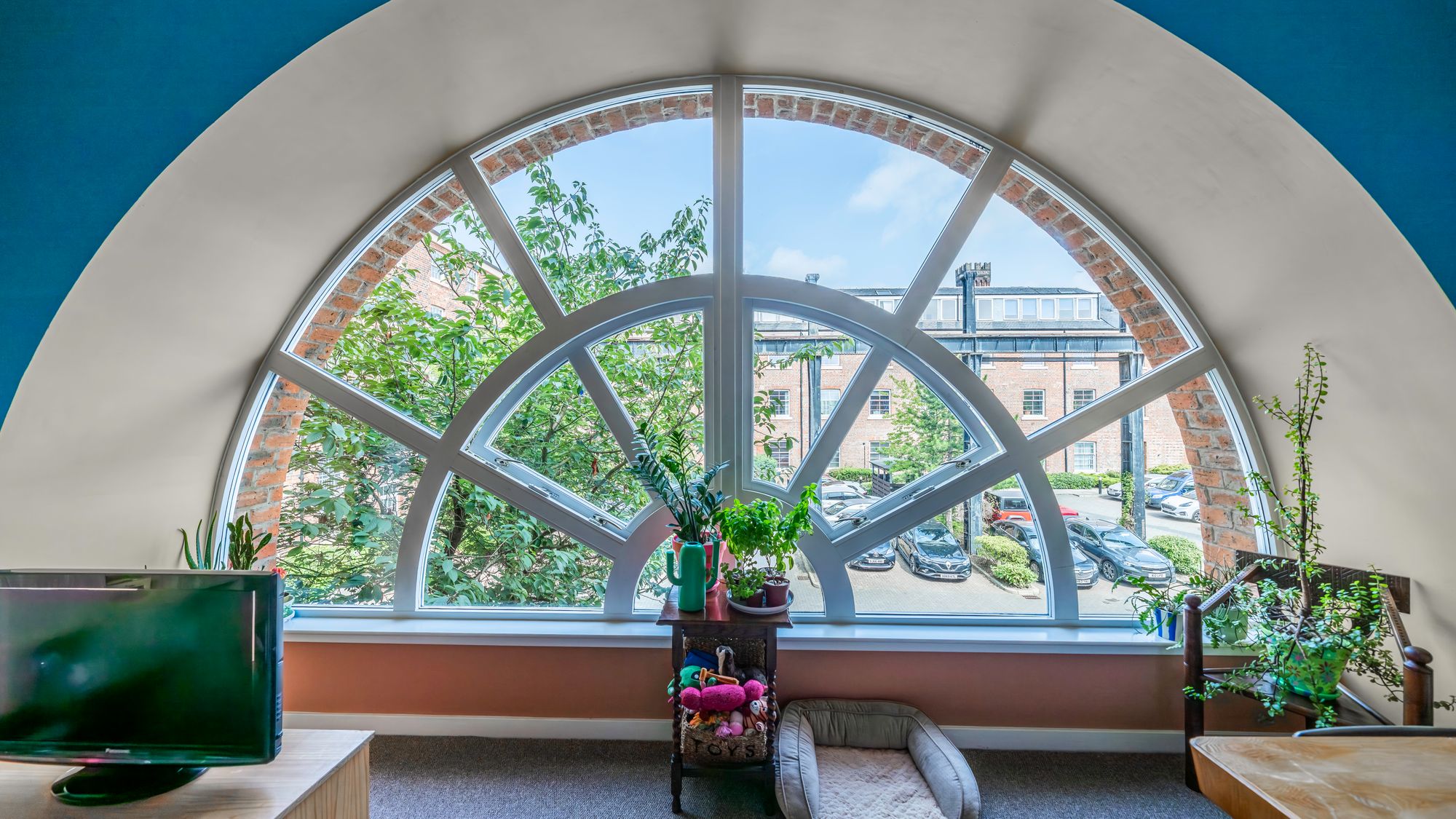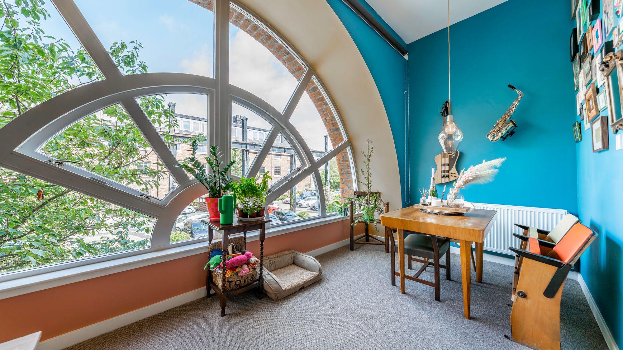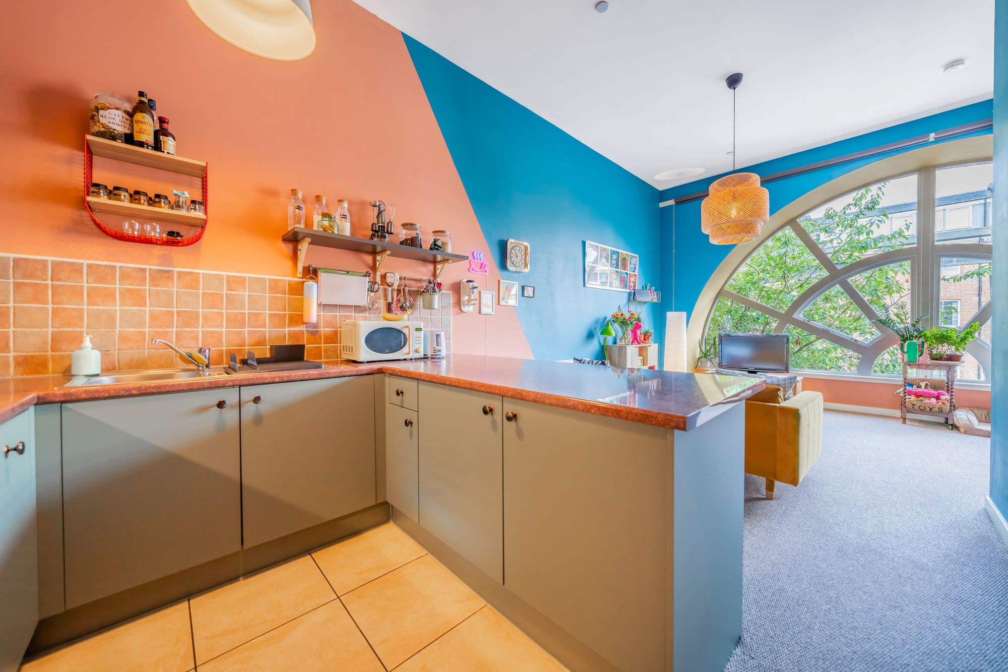 Internally, the property comprises a welcoming entrance hall with built-in storage, a generously proportioned lounge highlighted by a unique arched window, fitted kitchen with island, fully integrated appliances and a stylish tiled splashback. There are two spacious double bedrooms and a well-appointed family bathroom with shower over bath.