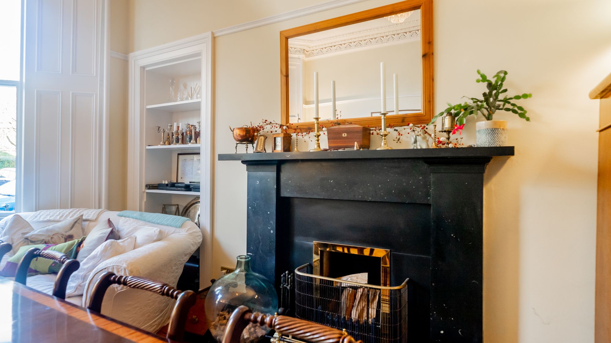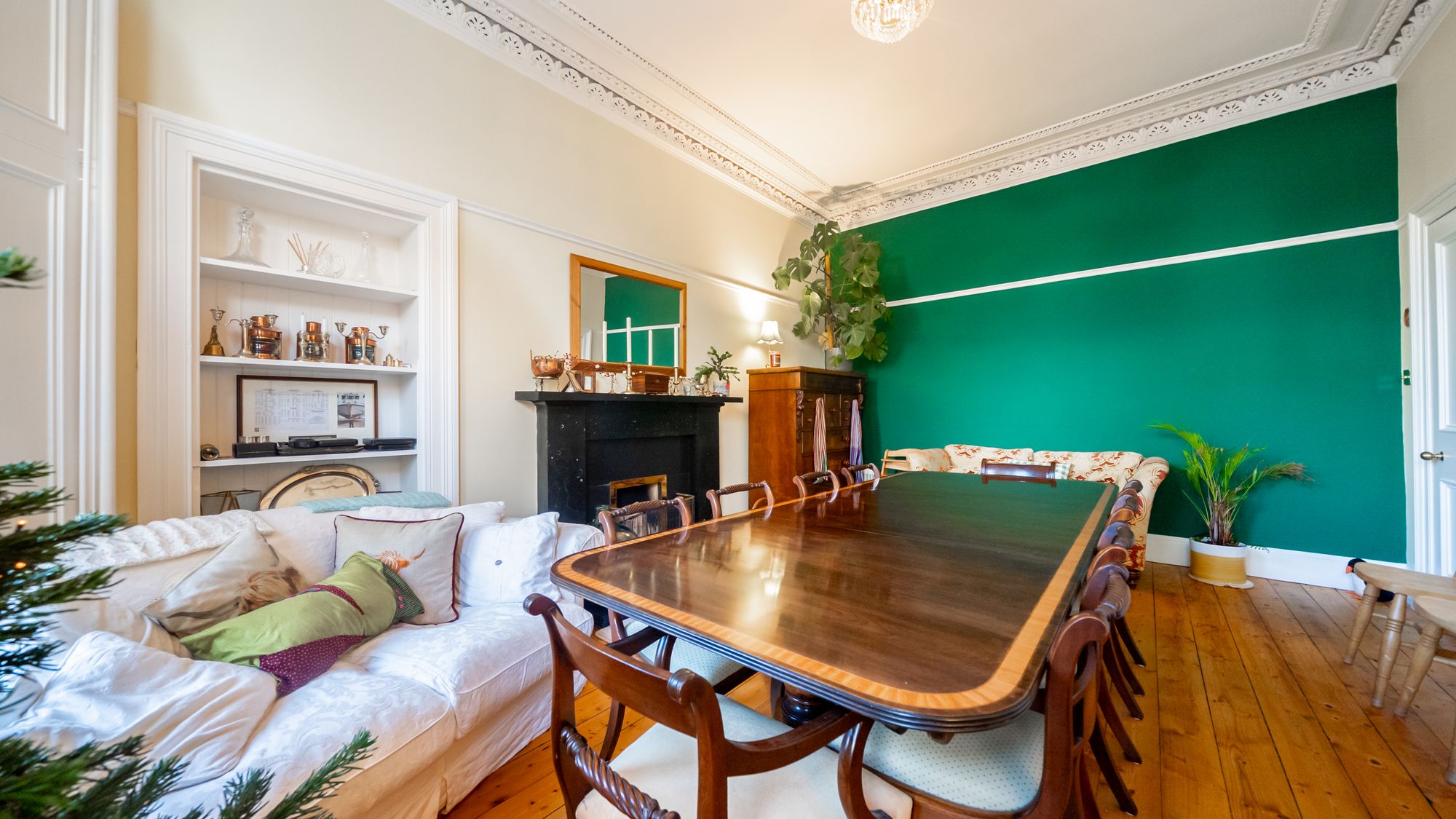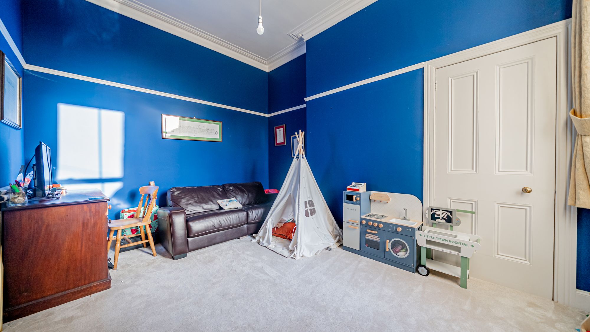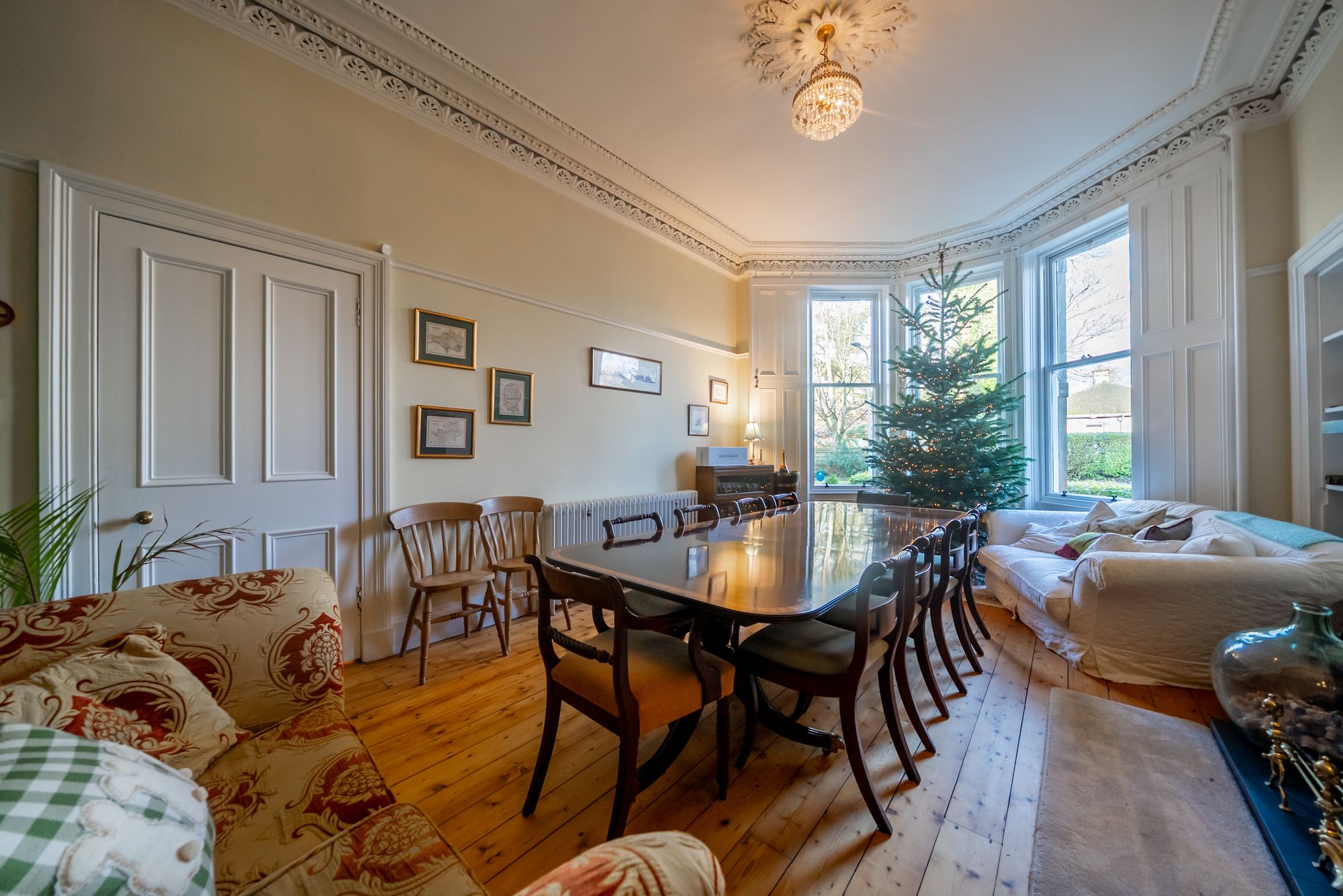 The first floor hosts an impressive and wonderfully proportioned formal lounge, truly a standout feature of the home. High ceilings, intricate original cornicing and a stunning bay window combine to create a room of exceptional scale and character. A wood-burning stove provides a warm focal point, ideal for cosy evenings. Also on this level is a generous double bedroom with inbuilt storage and picturesque views across the water. Continuing upward, another spacious double bedroom awaits, complete with tall sash windows and classic period detailing.
