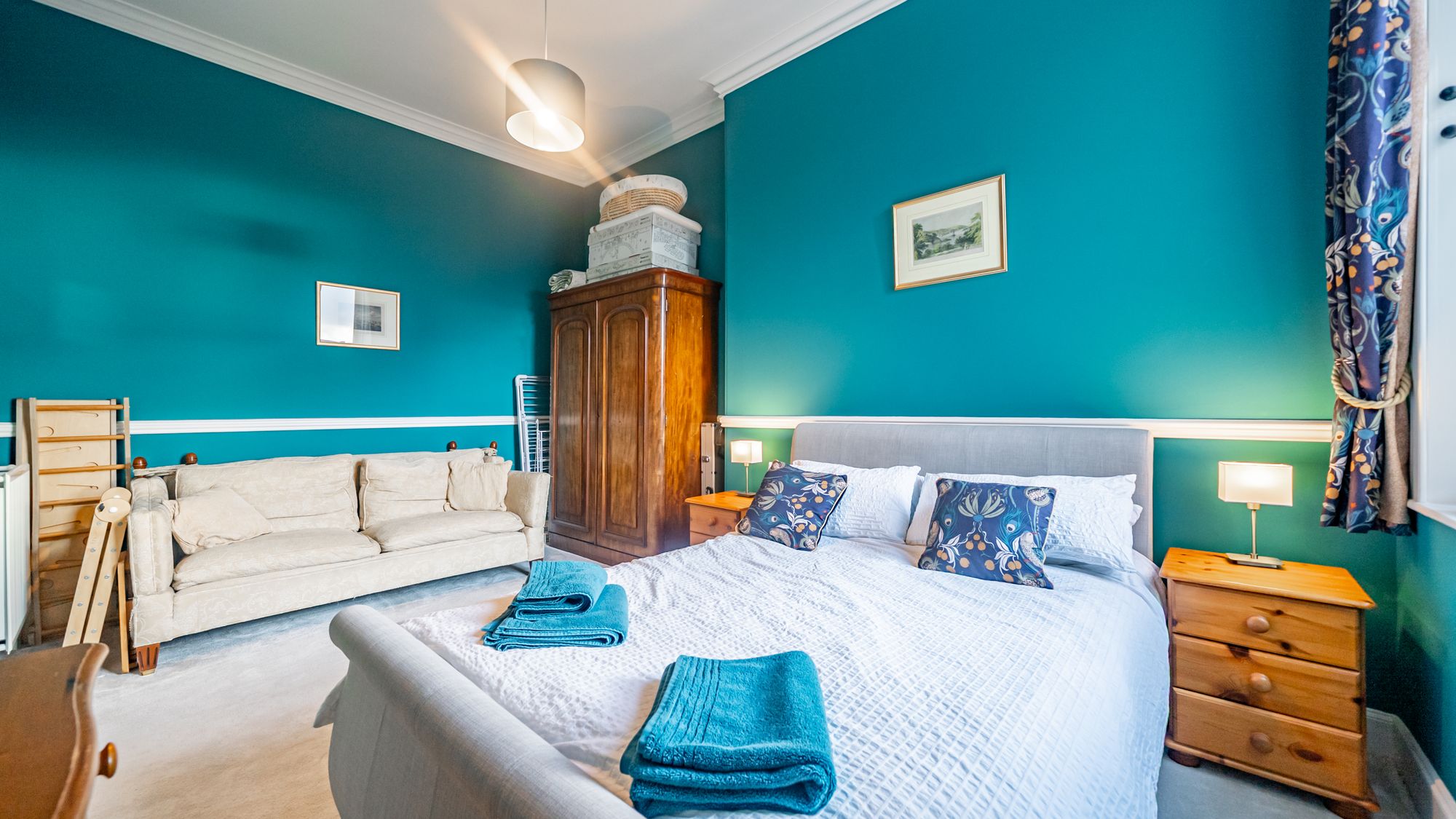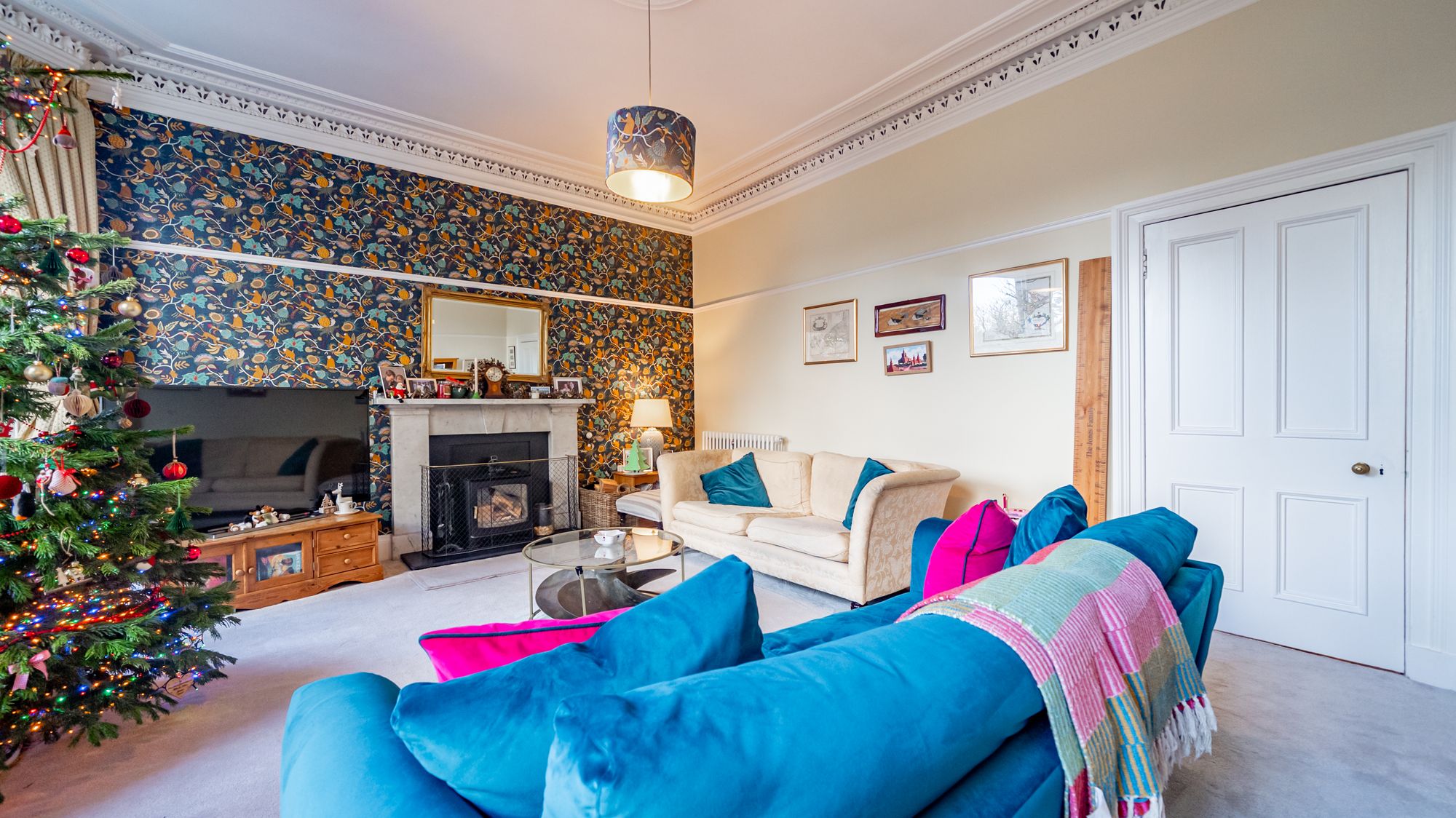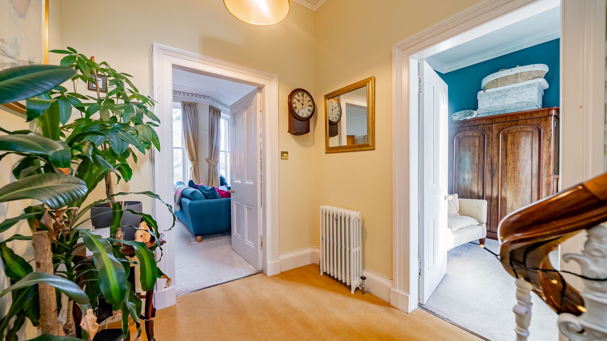 The first floor hosts an impressive and wonderfully proportioned formal lounge, truly a standout feature of the home. High ceilings, intricate original cornicing and a stunning bay window combine to create a room of exceptional scale and character. A wood-burning stove provides a warm focal point, ideal for cosy evenings. Also on this level is a generous double bedroom with inbuilt storage and picturesque views across the water. Continuing upward, another spacious double bedroom awaits, complete with tall sash windows and classic period detailing.
