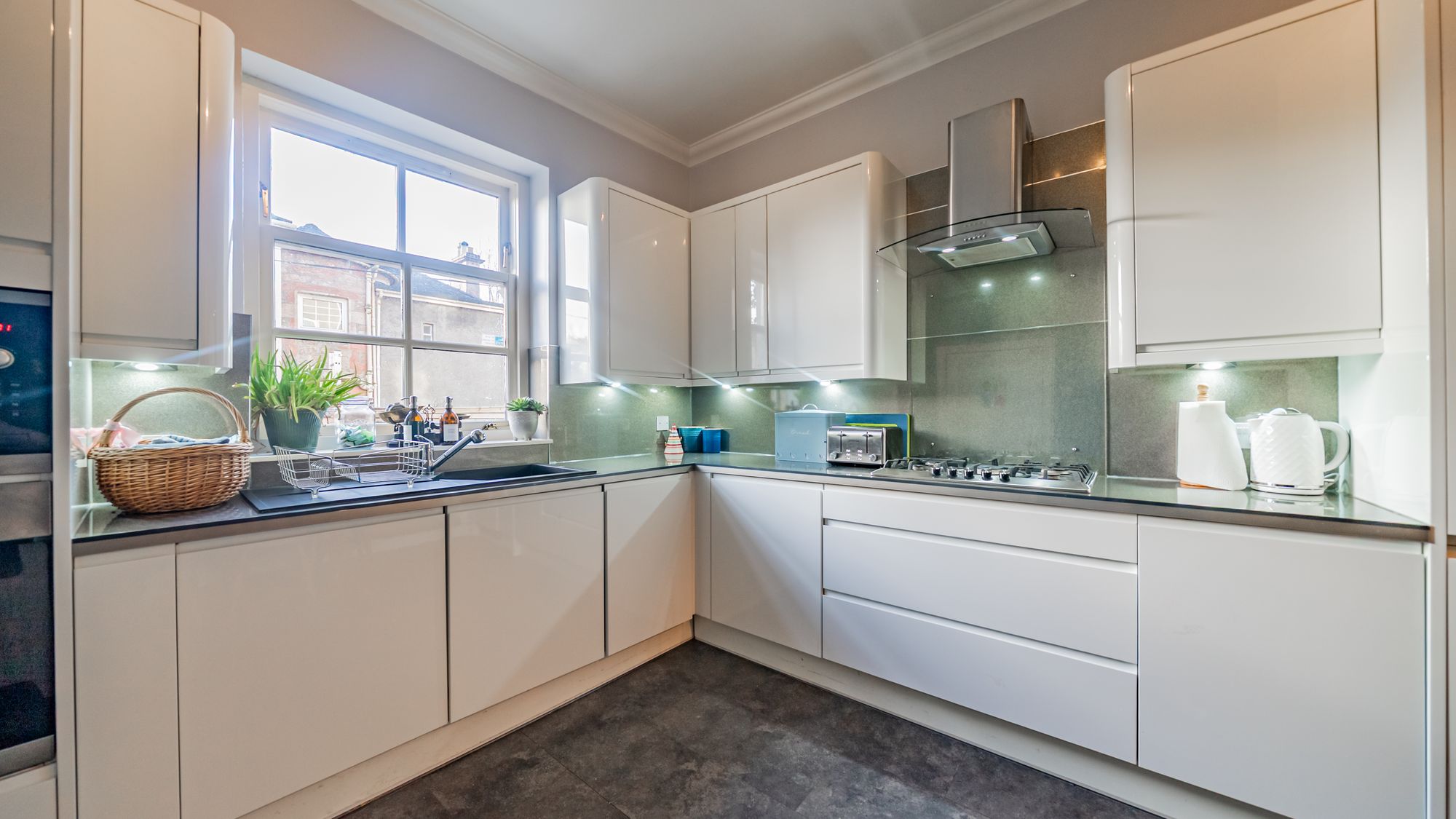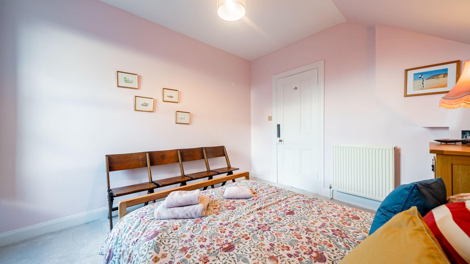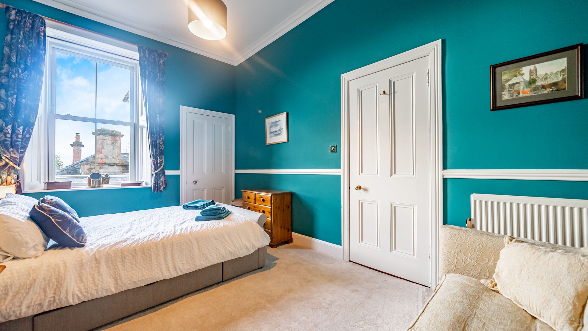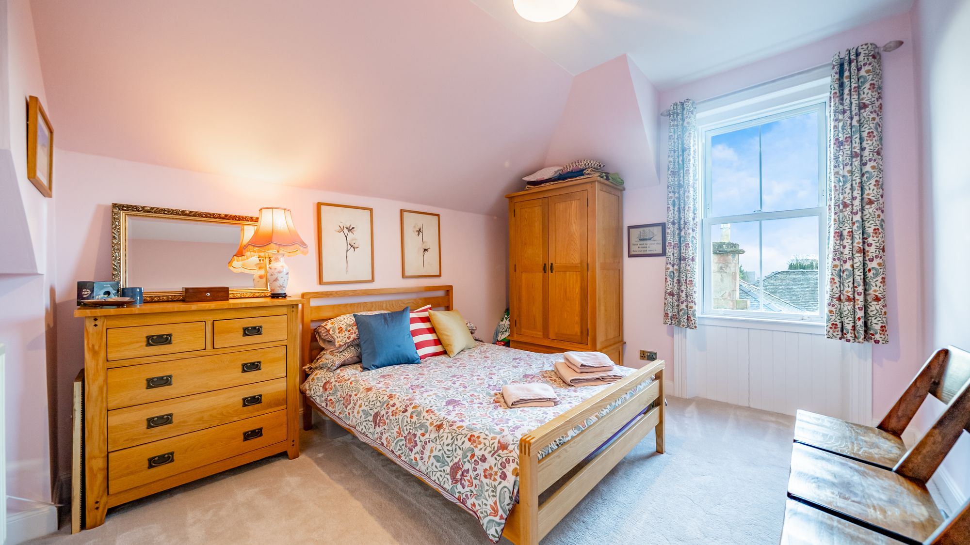 The first floor hosts an impressive and wonderfully proportioned formal lounge, truly a standout feature of the home. High ceilings, intricate original cornicing and a stunning bay window combine to create a room of exceptional scale and character. A wood-burning stove provides a warm focal point, ideal for cosy evenings. Also on this level is a generous double bedroom with inbuilt storage and picturesque views across the water. Continuing upward, another spacious double bedroom awaits, complete with tall sash windows and classic period detailing.