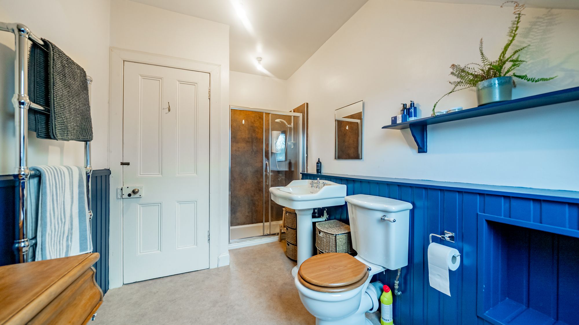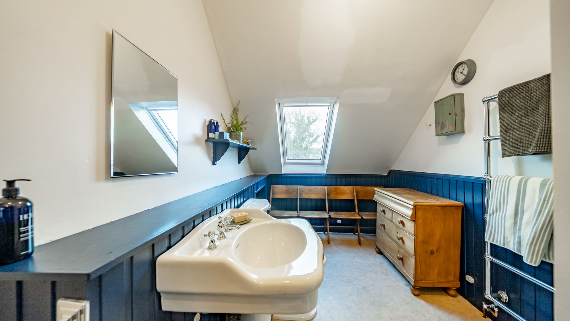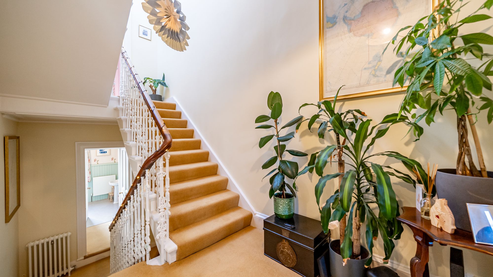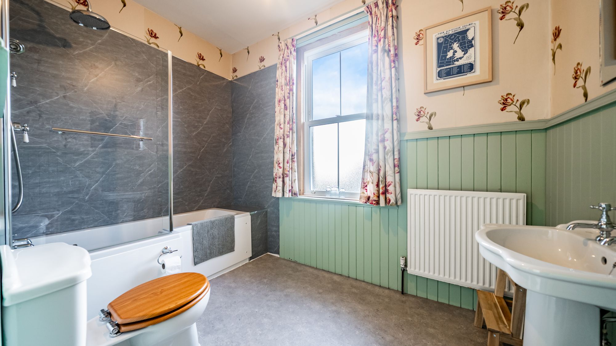The half landing presents a beautifully appointed family bathroom, featuring a bath with overhead shower, wc and wash-hand basin, all finished in elegant, neutral tones. A useful boiler cupboard is also located here.