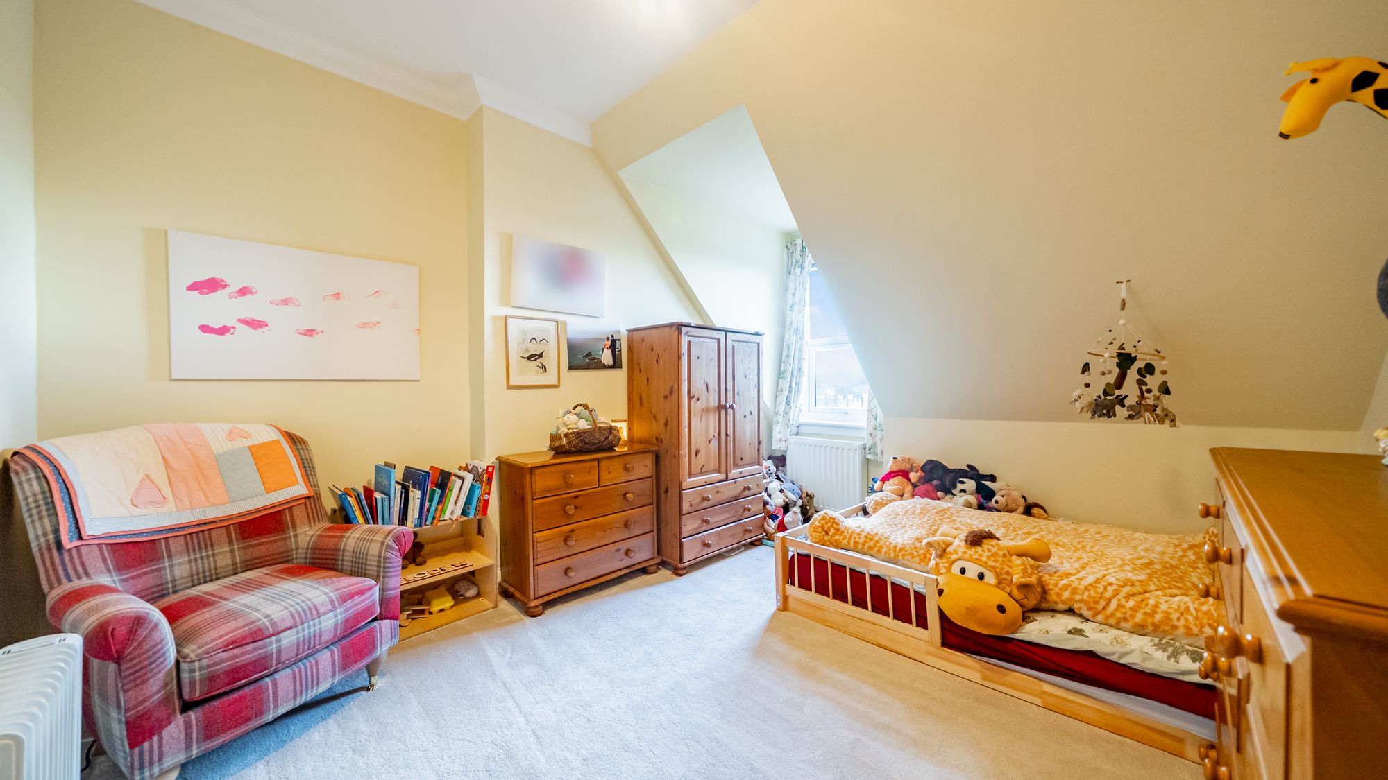 The top floor offers yet more excellent accommodation. A bright bedroom, currently arranged as a child’s room, provides ample space for a double bed and free-standing furniture. The beautifully decorated master bedroom sits to the front, featuring another elegant bay window and generous proportions that enhance its serene, airy feel. Completing the upper level is a stylish and modern family shower room with Velux window, large walk-in shower, traditional wash-hand basin and wc. Additional storage is also available on the landing. The property retains a wealth of original features including sash and casement windows, high ceilings and period detailing, all complemented by tasteful modern upgrades. Some windows have been sympathetically replaced with double glazing, and the home benefits from gas-fired central heating.