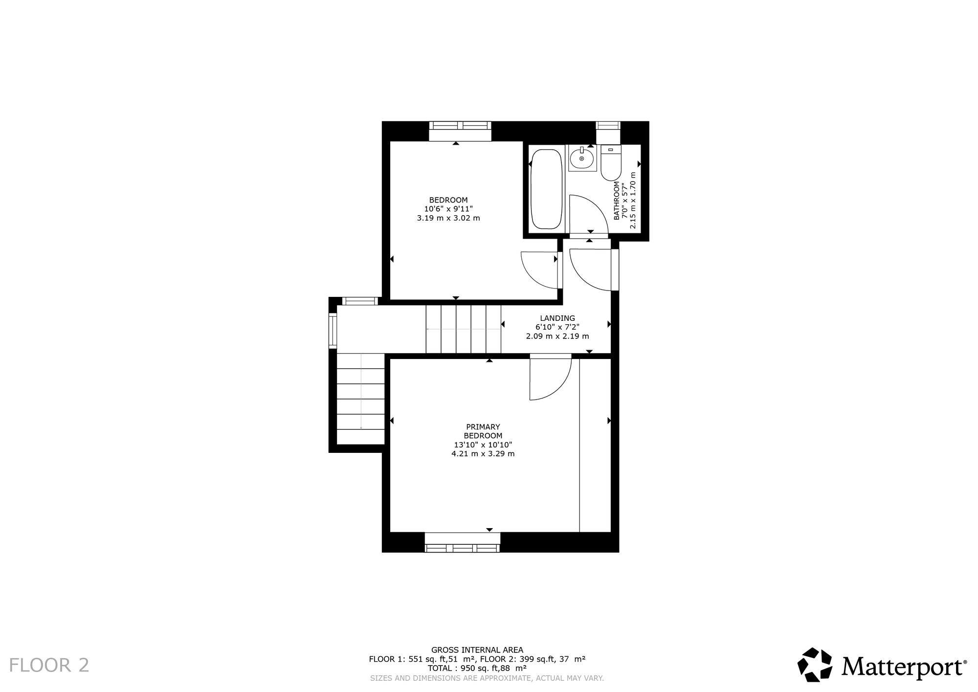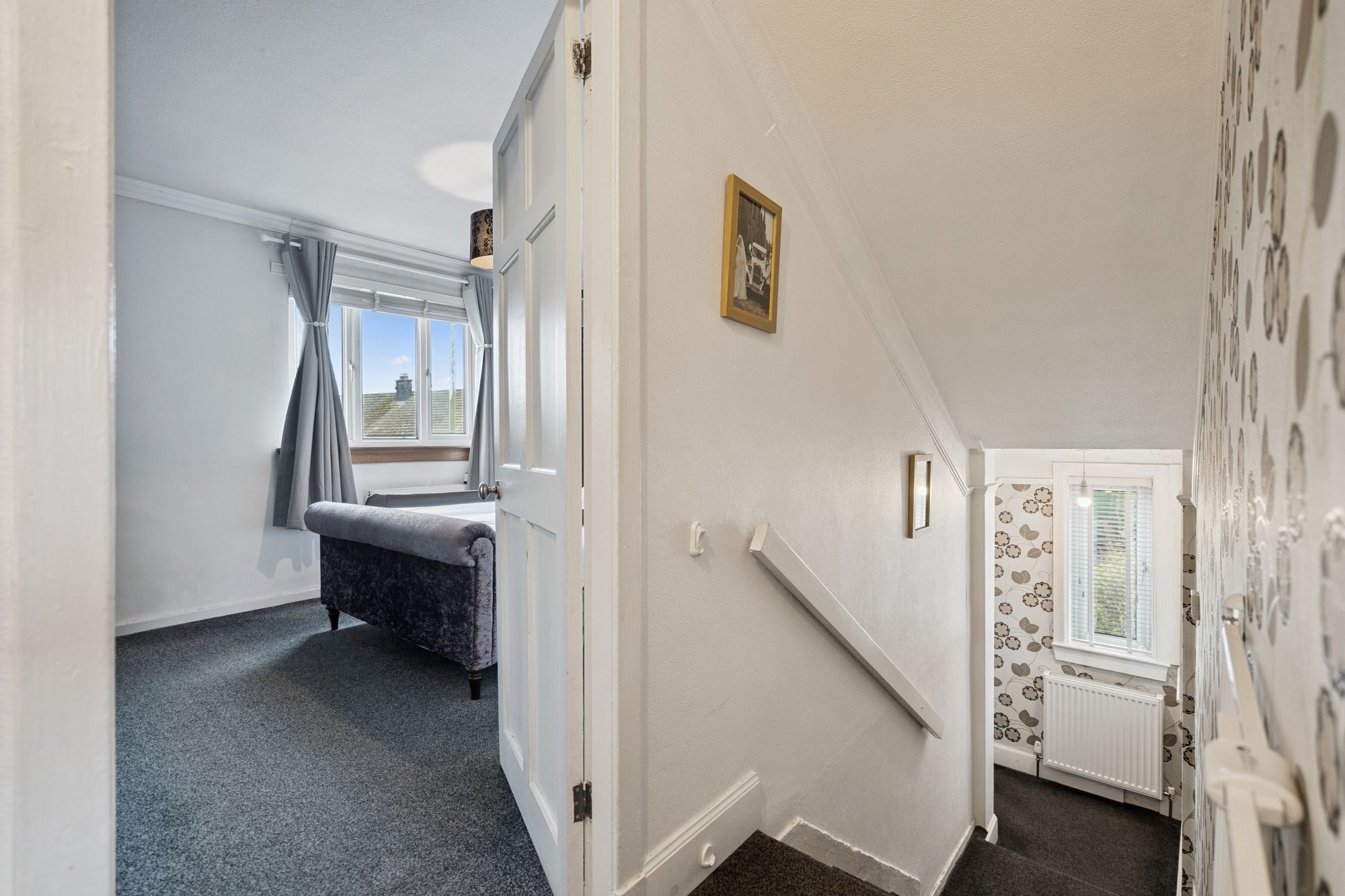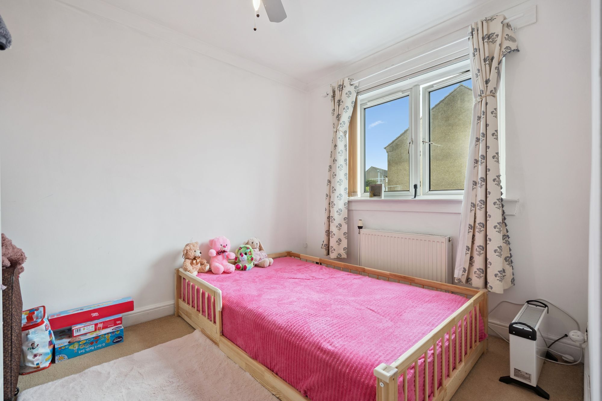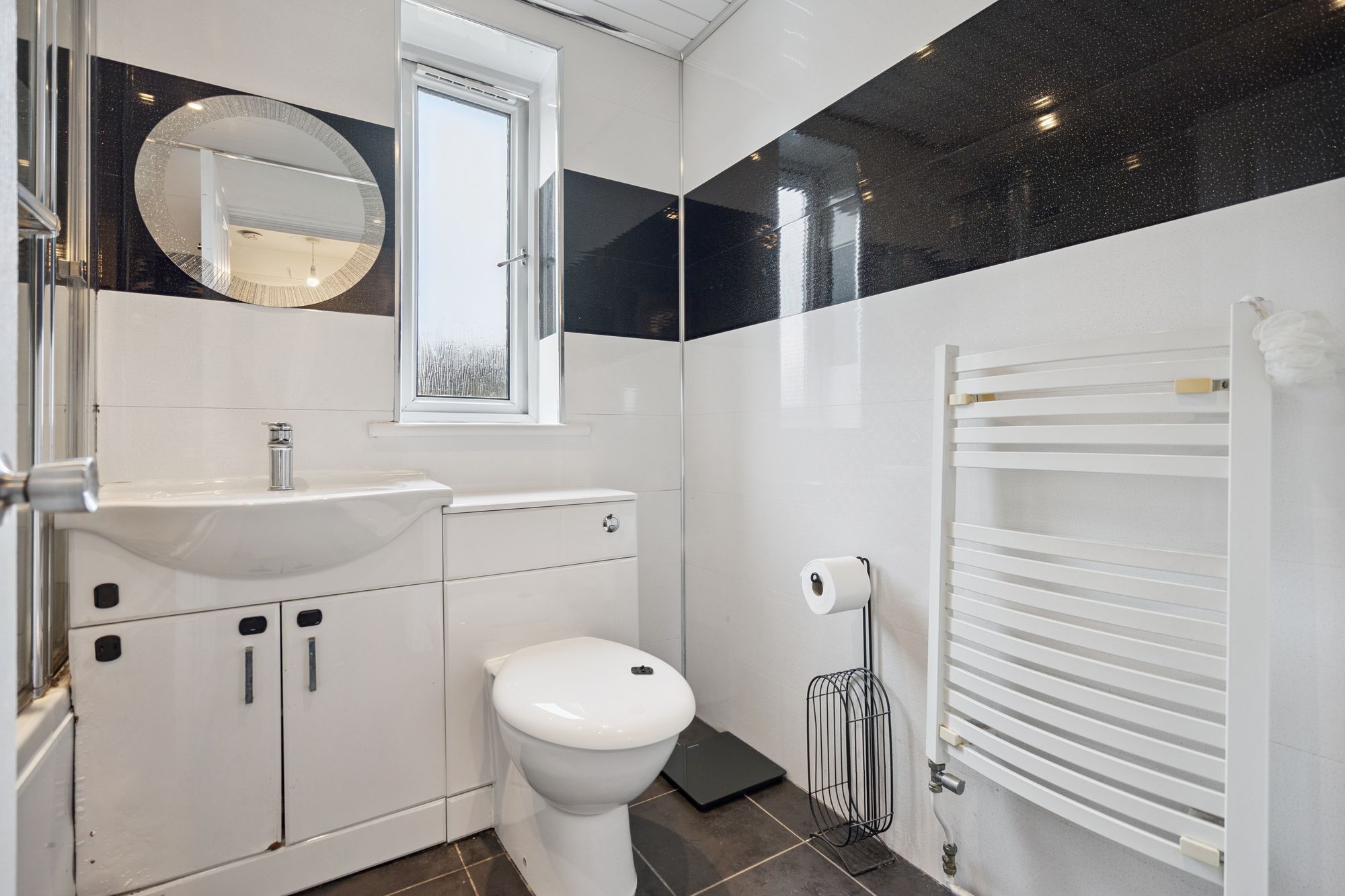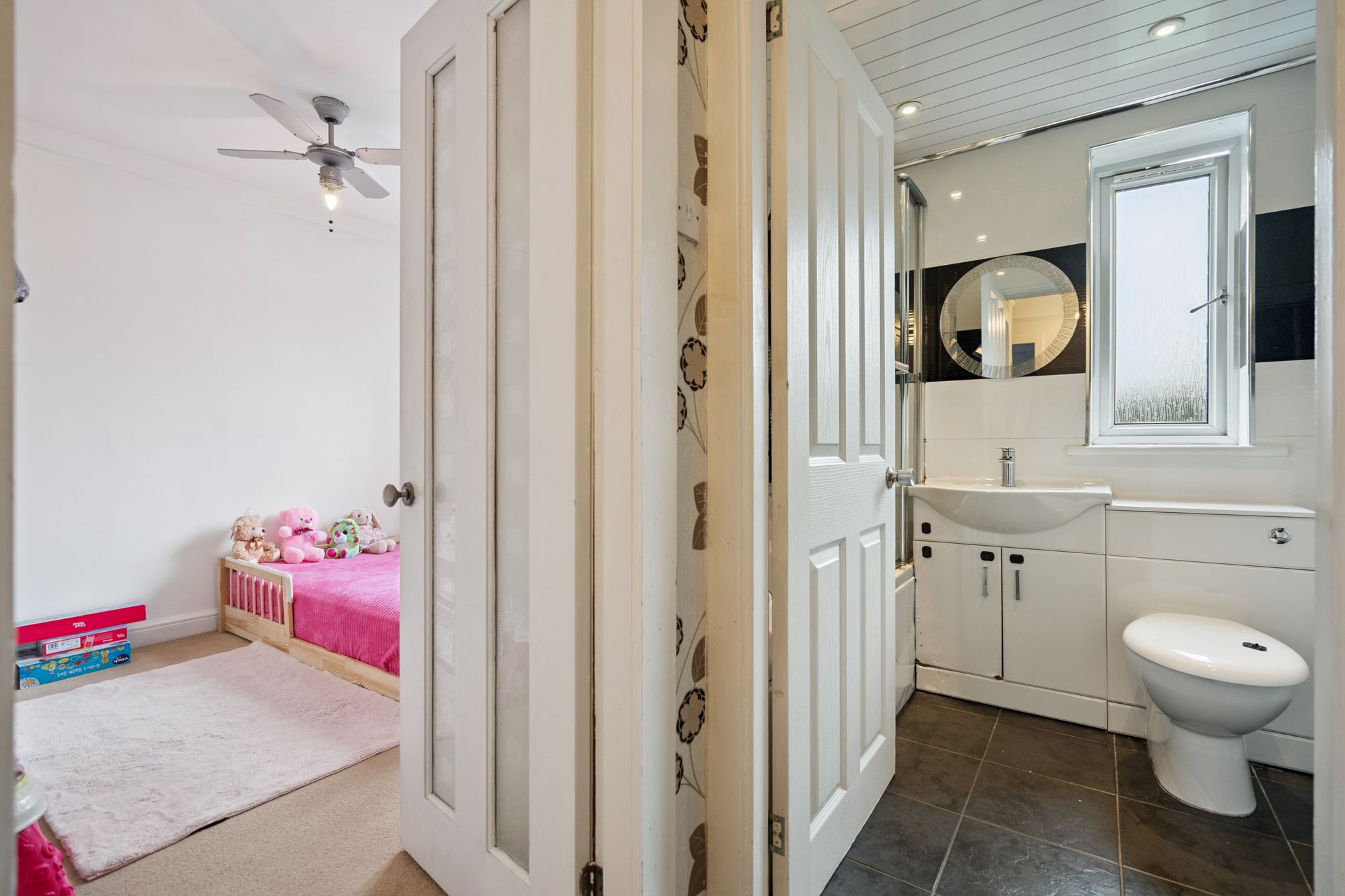 Upstairs, there are two comfortable double bedrooms, both carpeted for added warmth and comfort. The principal bedroom benefits from built-in wardrobes, and the accommodation is completed by a family bathroom fitted with a shower over the bath.