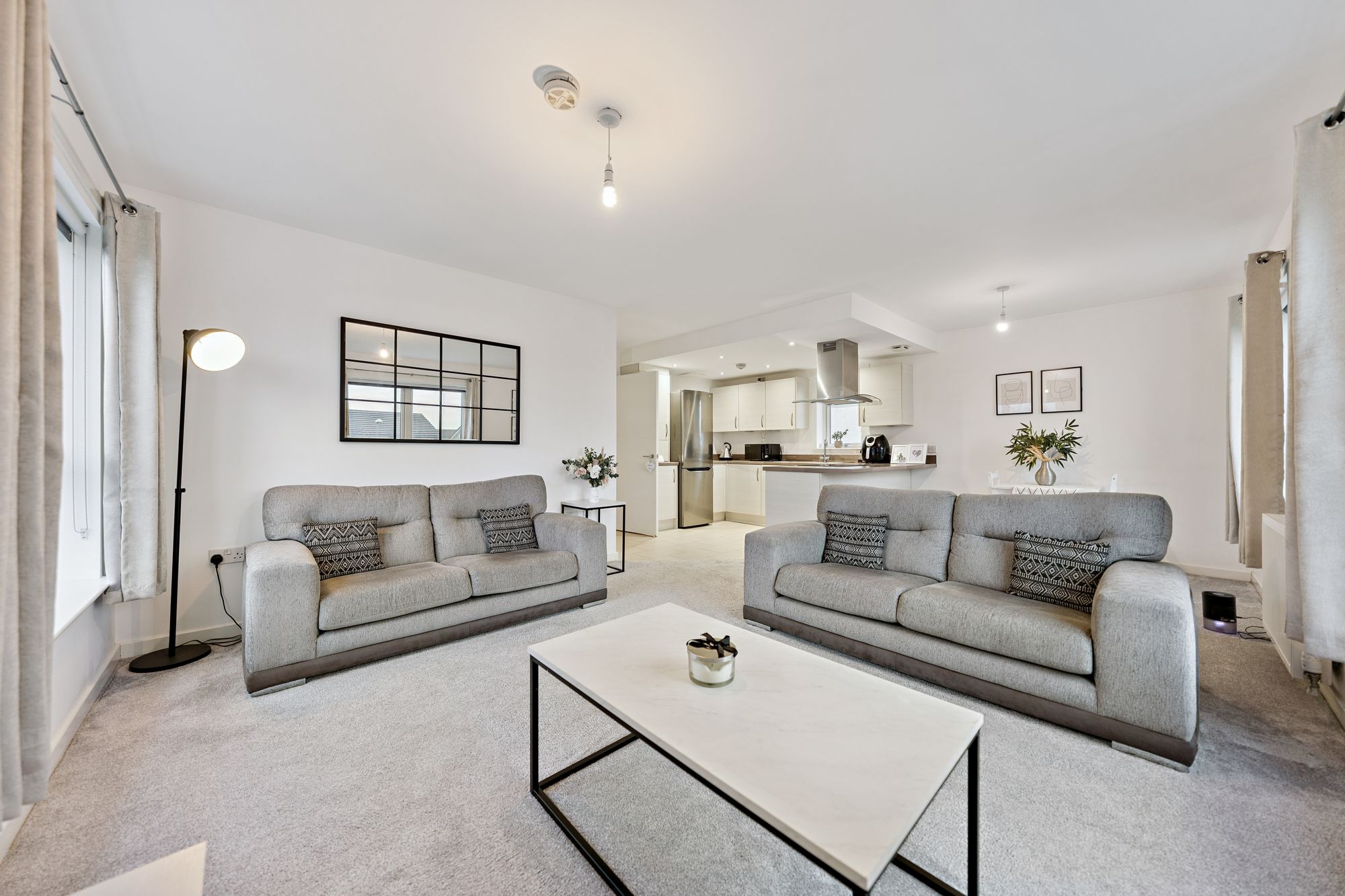 The accommodation comprises a welcoming entrance hall with a useful storage cupboard and access to all rooms. The generous front-facing, dual-aspect lounge provides an excellent living space, flooded with natural light. An open-plan, modern dining kitchen is fitted with a range of wall and floor mounted units and a selection of integrated appliances, making it ideal for both everyday living and entertaining.