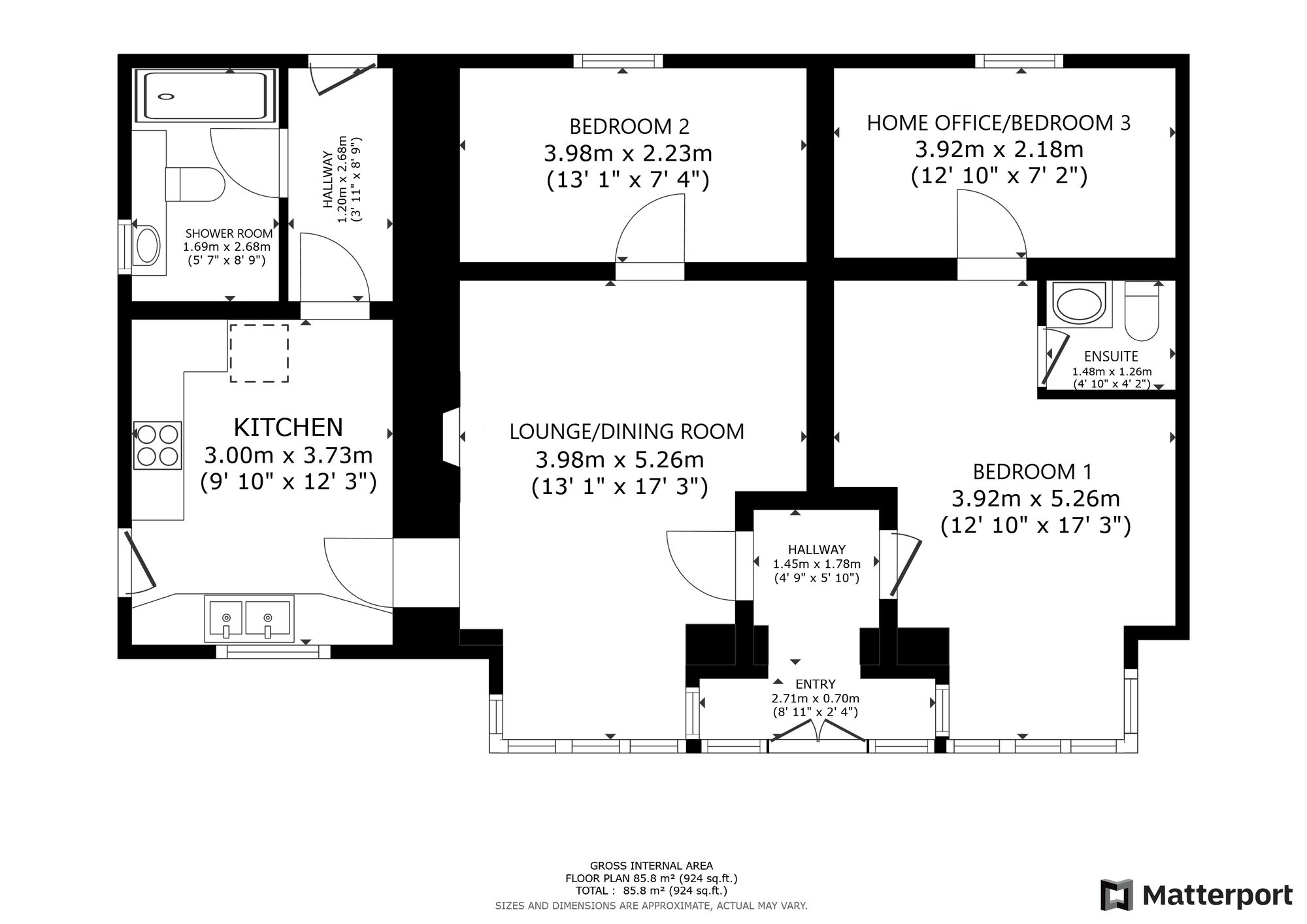 The accommodation offers an entrance vestibule opening into the reception hall which in turn gives access to a bright lounge which has the second bedroom located to the rear. Off the lounge is a modern refitted kitchen which is large enough to accommodate a dining table and chairs. The kitchen enjoys views across the garden and has a door out to the side. A rear hall behind the kitchen leads to a modern, recently refitted shower room and a good sized cupboard. On the other side of the main reception hall from the lounge is the master bedroom which is a good sized double room with south facing views and with its own ensuite wc. To the rear of this is an additional room which would be a perfect home office or nursery. Gas fired central heating and replacement double glazing throughout.