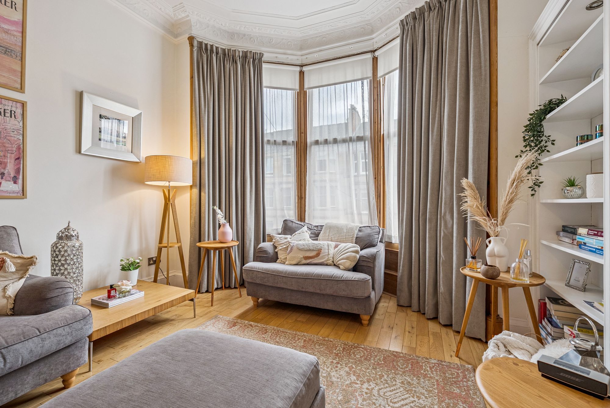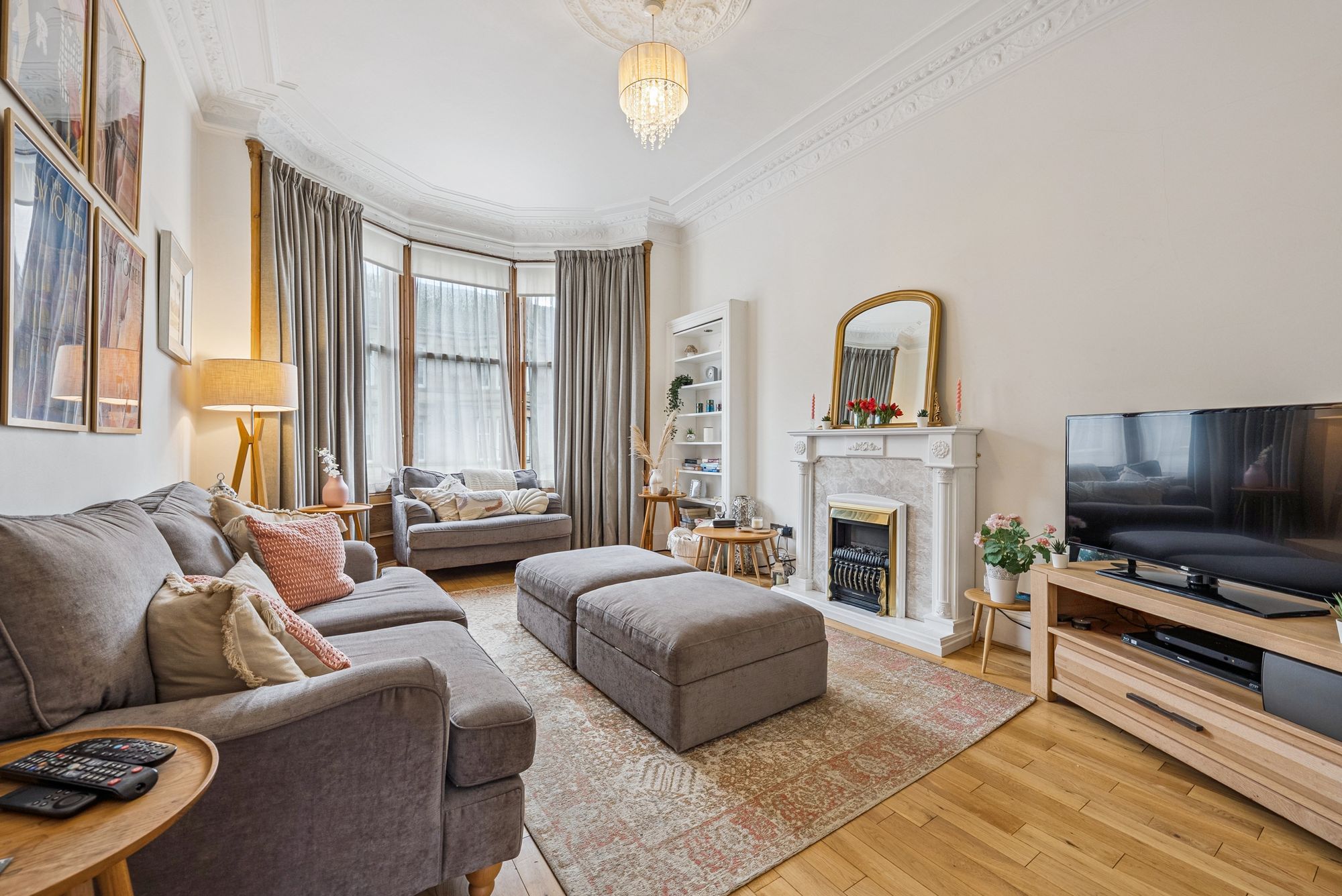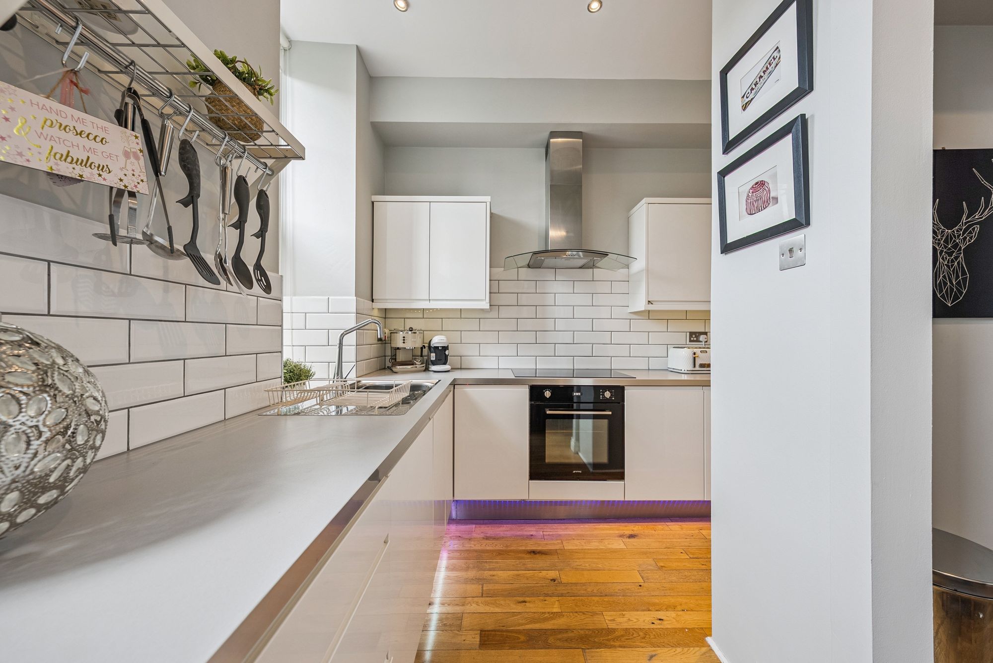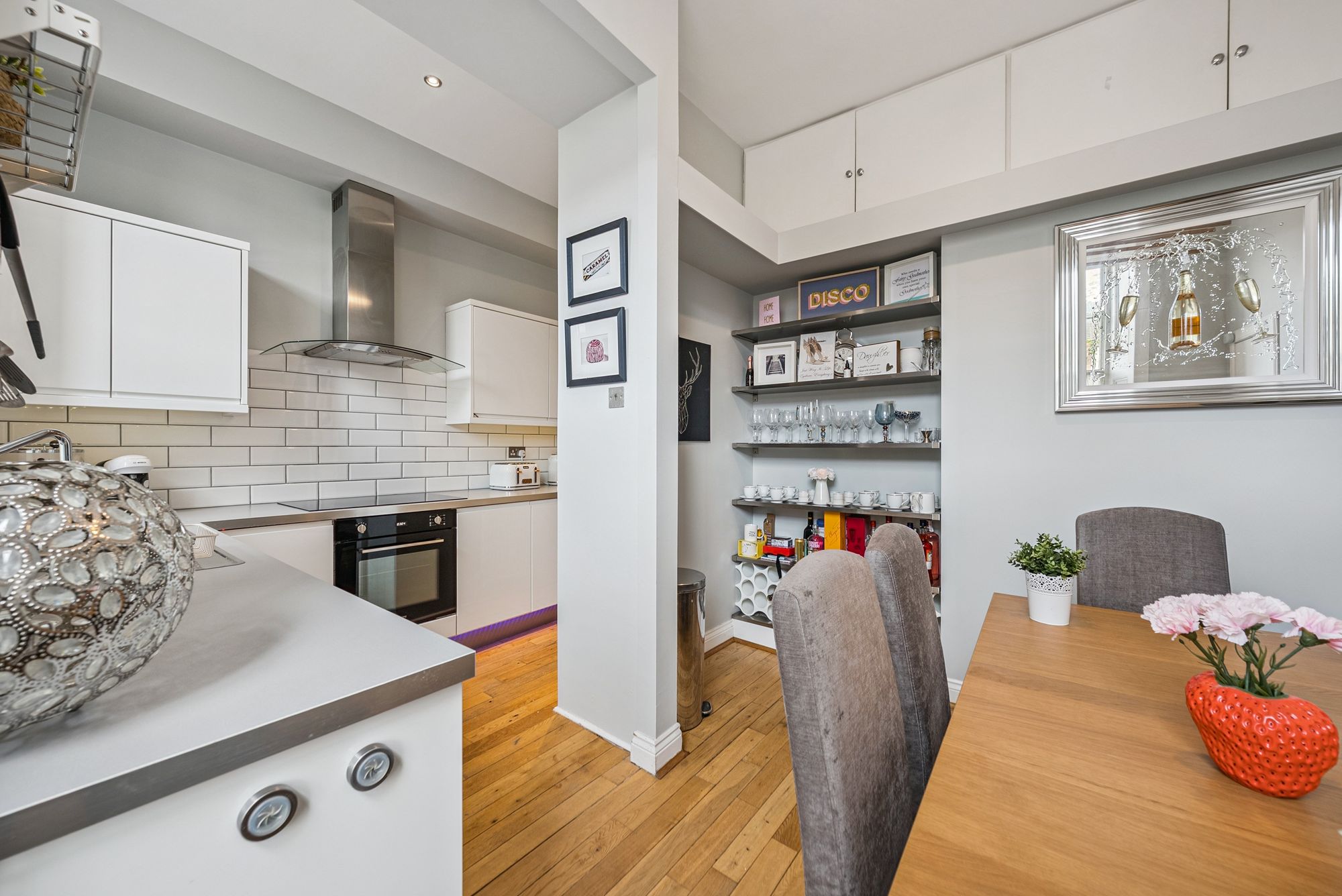 The attached photographs, floor plan and HD video tour will give an idea of the size and layout of the flat. However, in brief the accommodation extends to: welcoming entrance hallway with storage cupboards off, a spacious bay windowed living room, a modern dining sized L-shaped kitchen which makes a perfect space for entertaining. The kitchen itself has a range of base and wall mounted gloss units with tiled splash back and integrated appliances. There are two double bedrooms and the accommodation is completed by a fully tiled main bathroom with bath and separate walk-in shower.